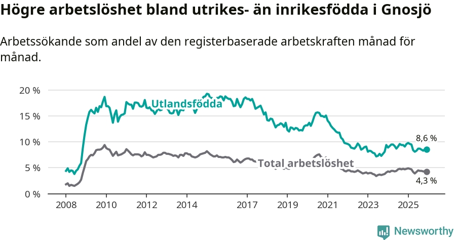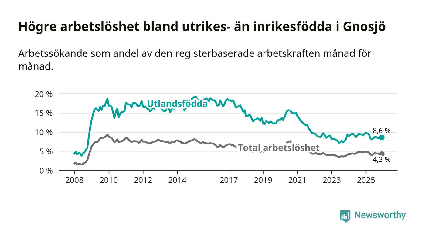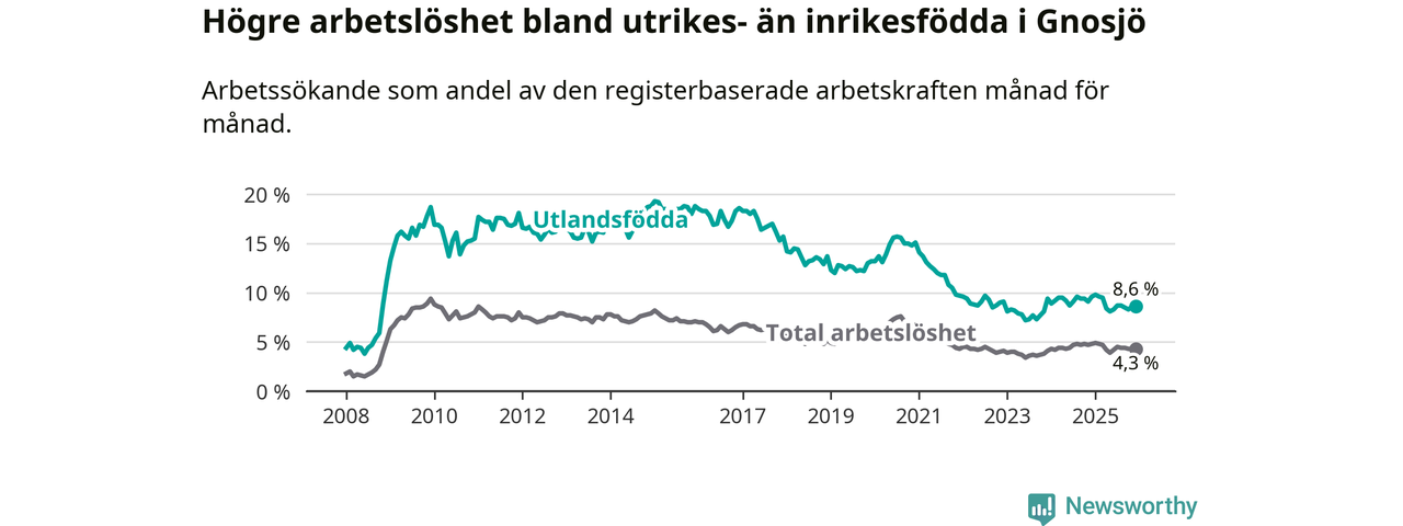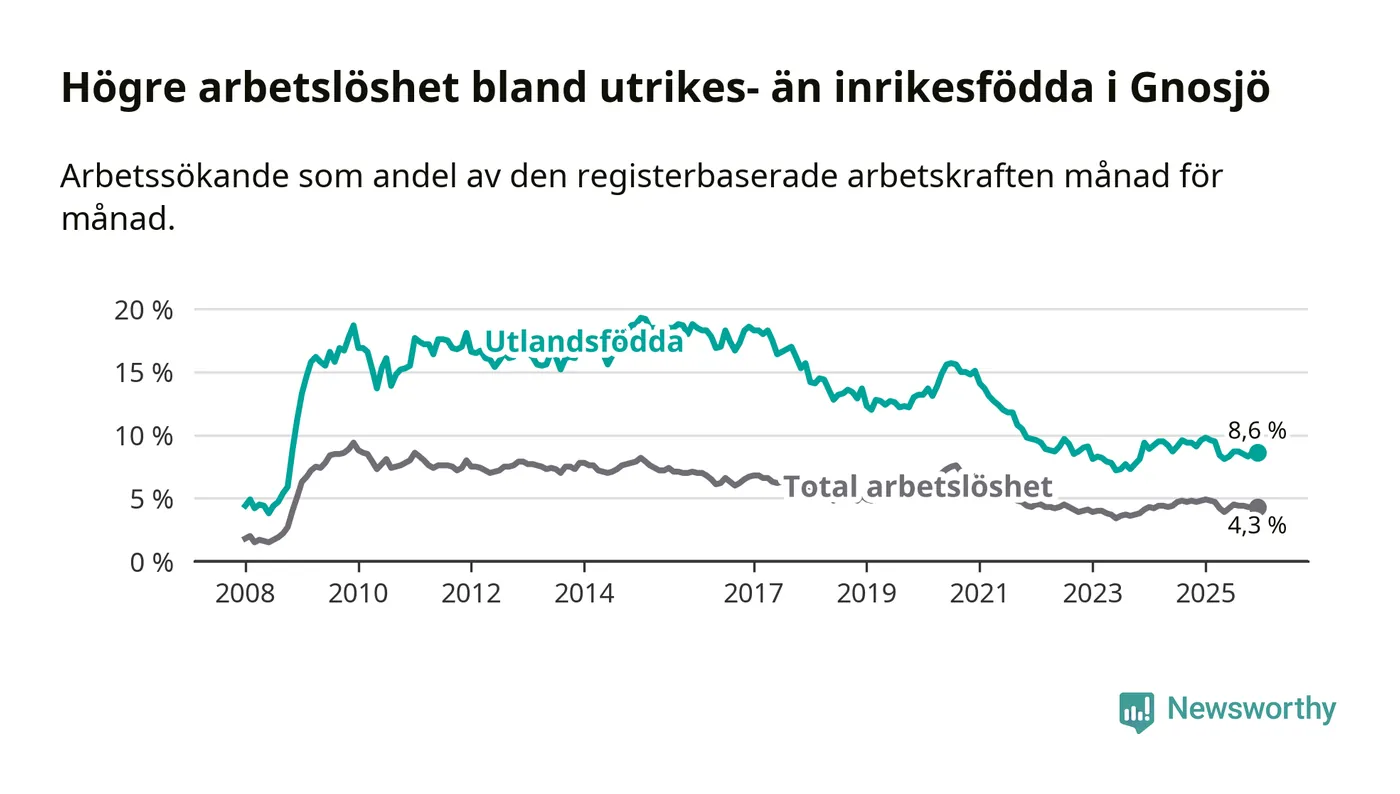 Skillnaden i arbetslöshet mellan utrikesfödda och hela befolkningen är 4,3 procentenheter i Gnosjö. Det är en mindre skillnad än för ett år sedan (−0,5 procentenheter).