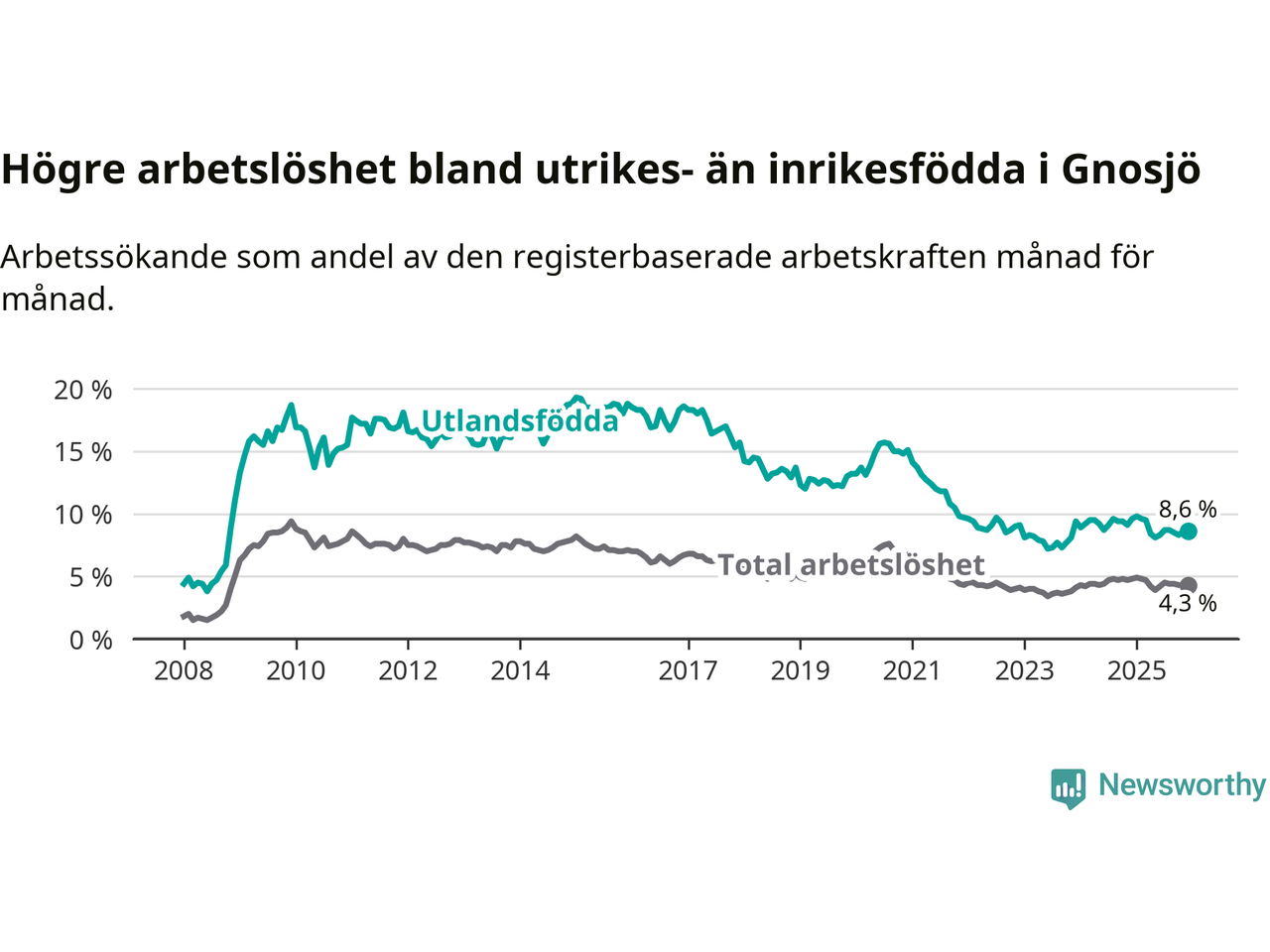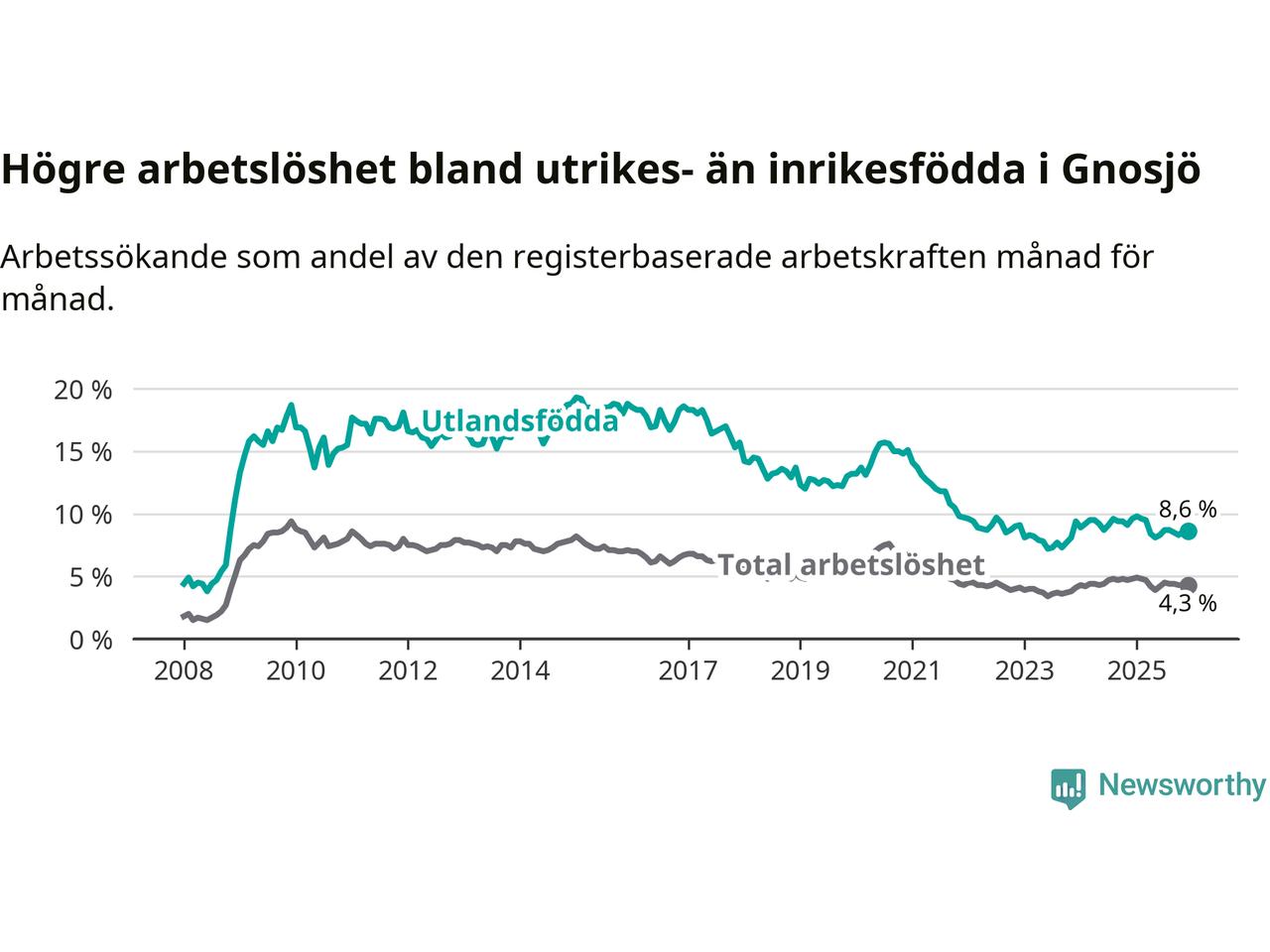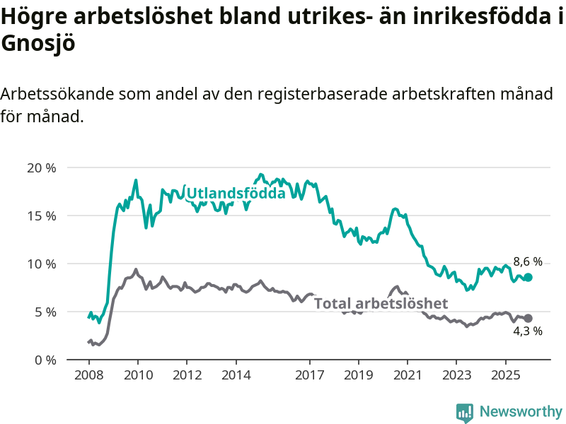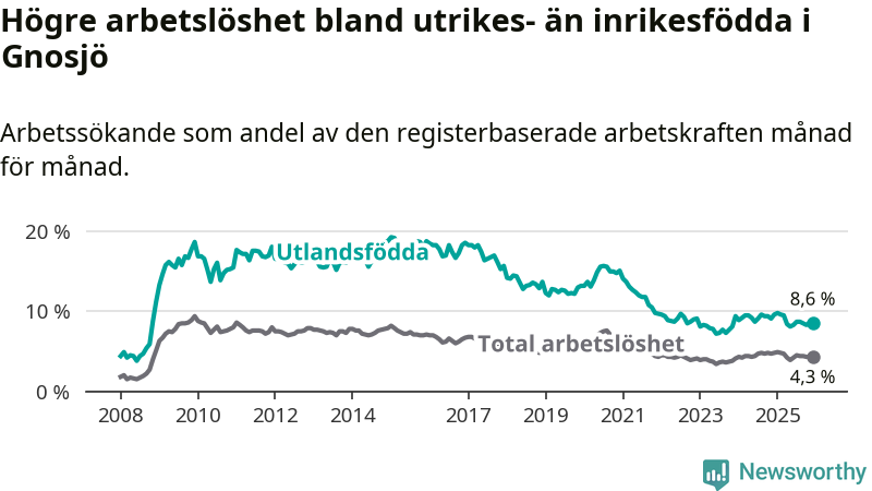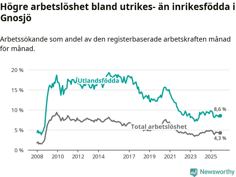 Skillnaden i arbetslöshet mellan utrikesfödda och hela befolkningen är 4,3 procentenheter i Gnosjö. Det är en mindre skillnad än för ett år sedan (−0,5 procentenheter).