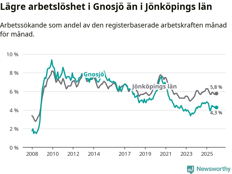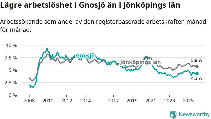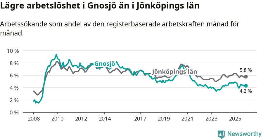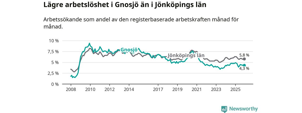 Under december månad rapporterade Gnosjö kommun en total arbetslöshet på 4,3 procent. Det är en minskning jämfört med samma tidpunkt i fjol (−0,5 procentenheter). Även i Jönköpings län sjunker arbetslösheten .