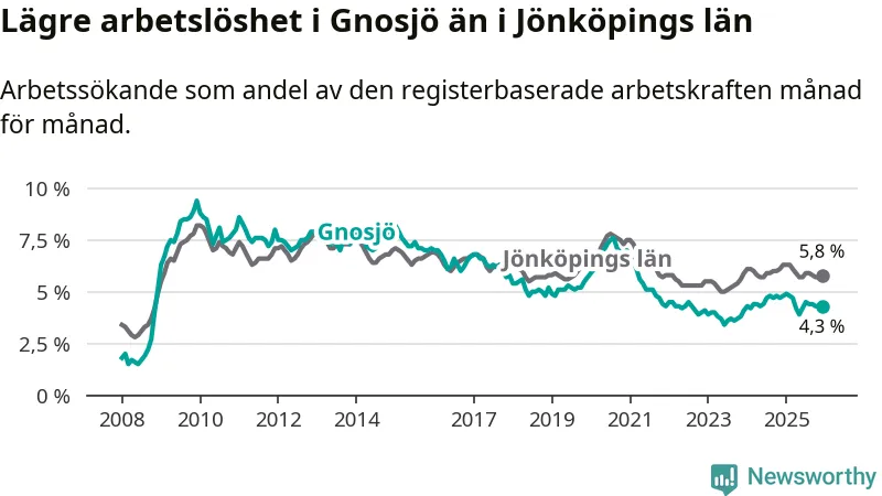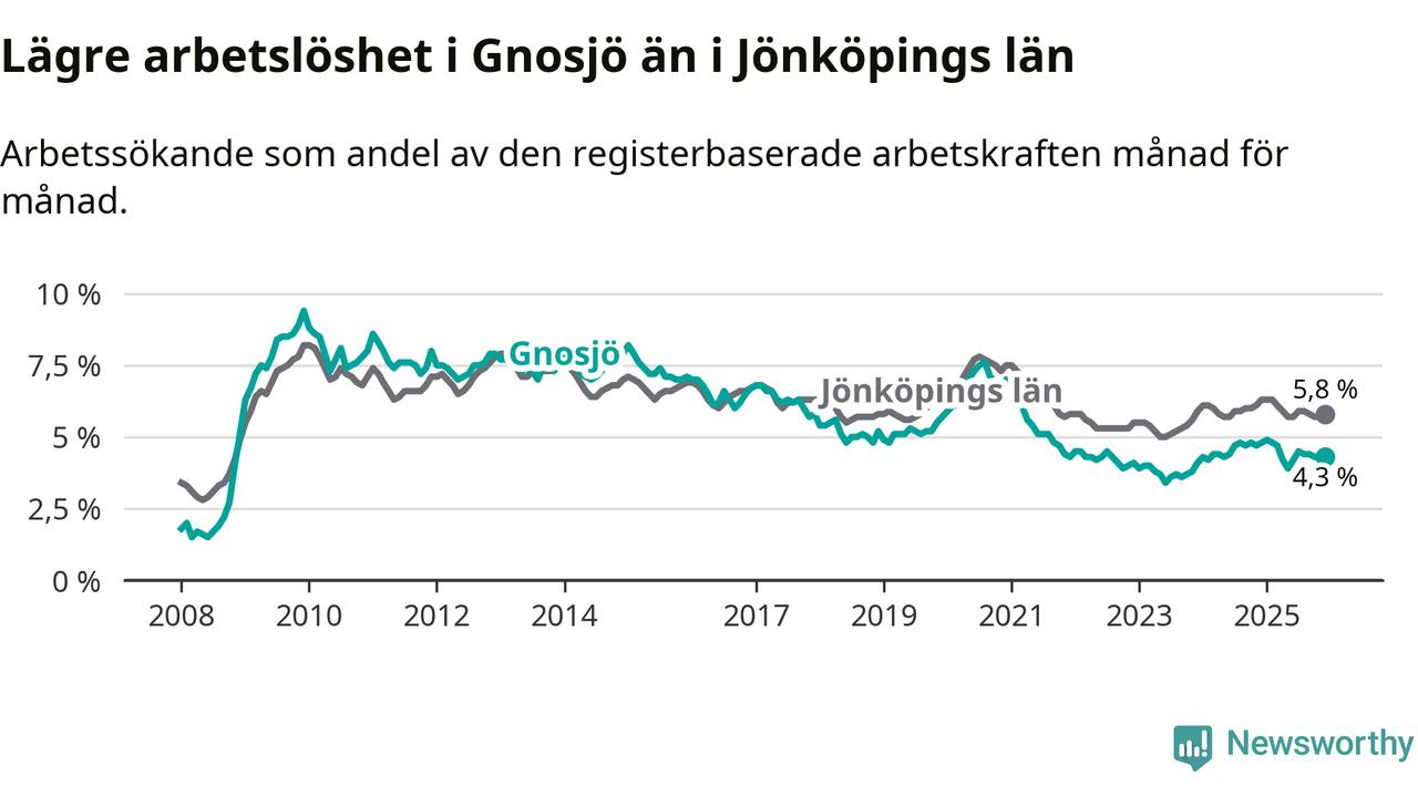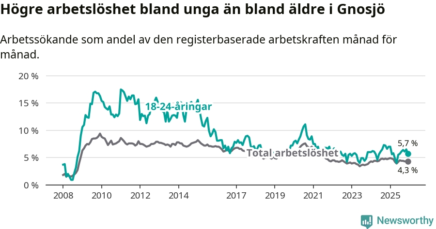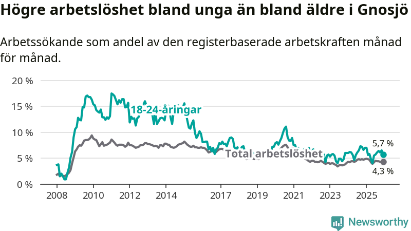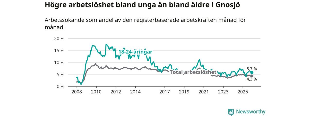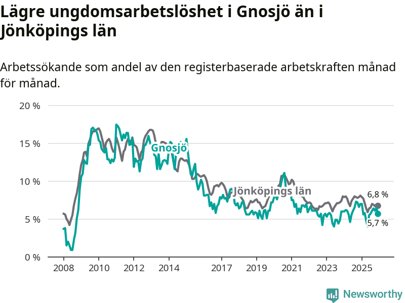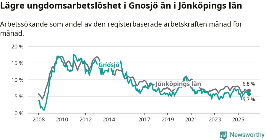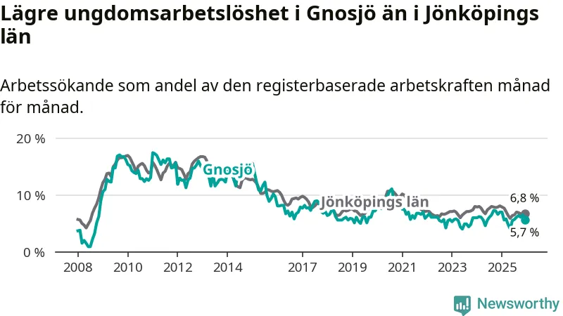 I och med den senaste månadens nedgång har de ungas arbetslöshet i Gnosjö sjunkit elva månader i följd (ner från 7,0 procent i januari 2025 till 5,7 procent nu).