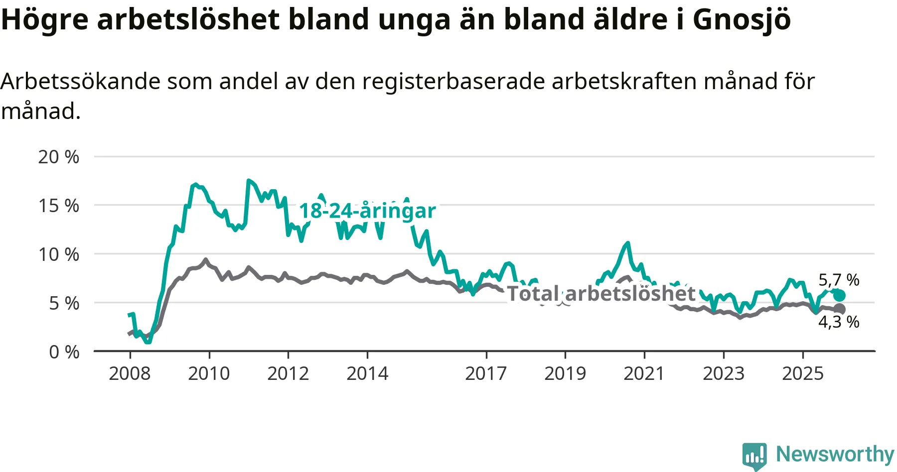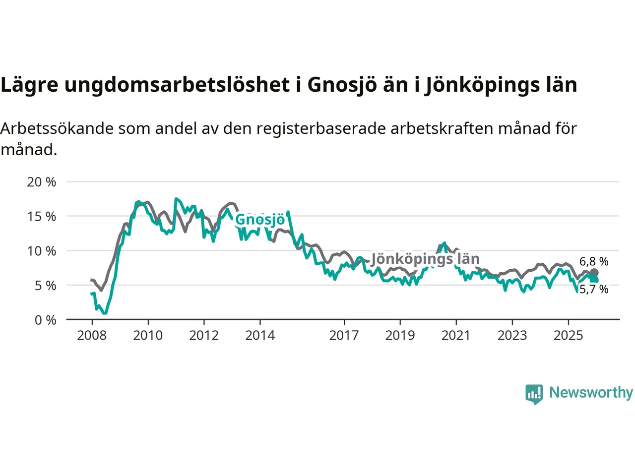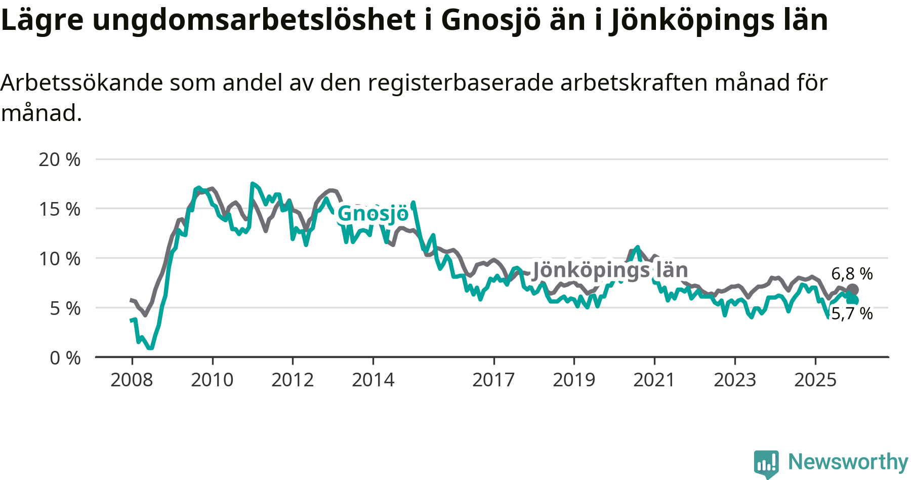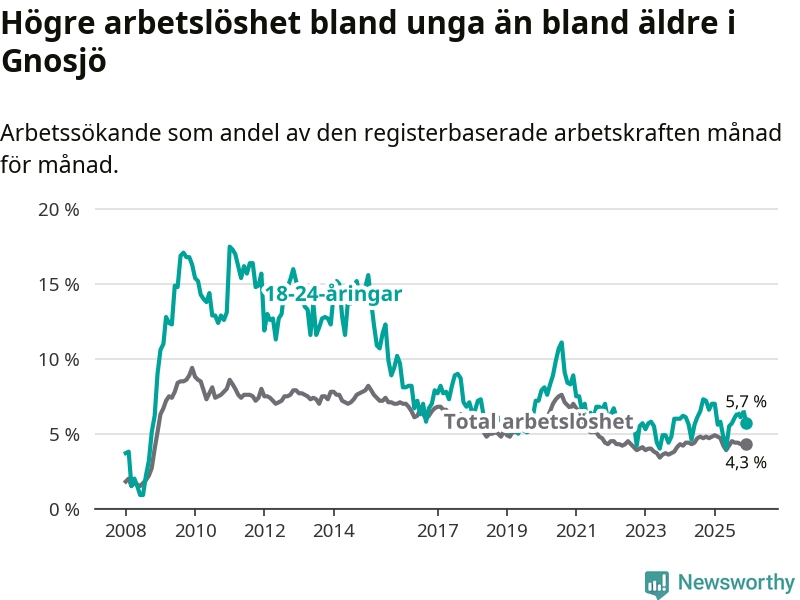 I och med den senaste månadens nedgång har de ungas arbetslöshet i Gnosjö sjunkit elva månader i följd (ner från 7,0 procent i januari 2025 till 5,7 procent nu).