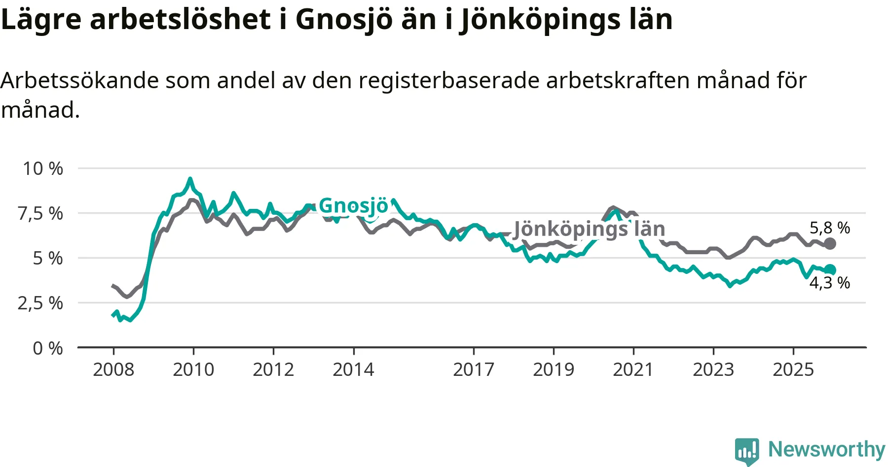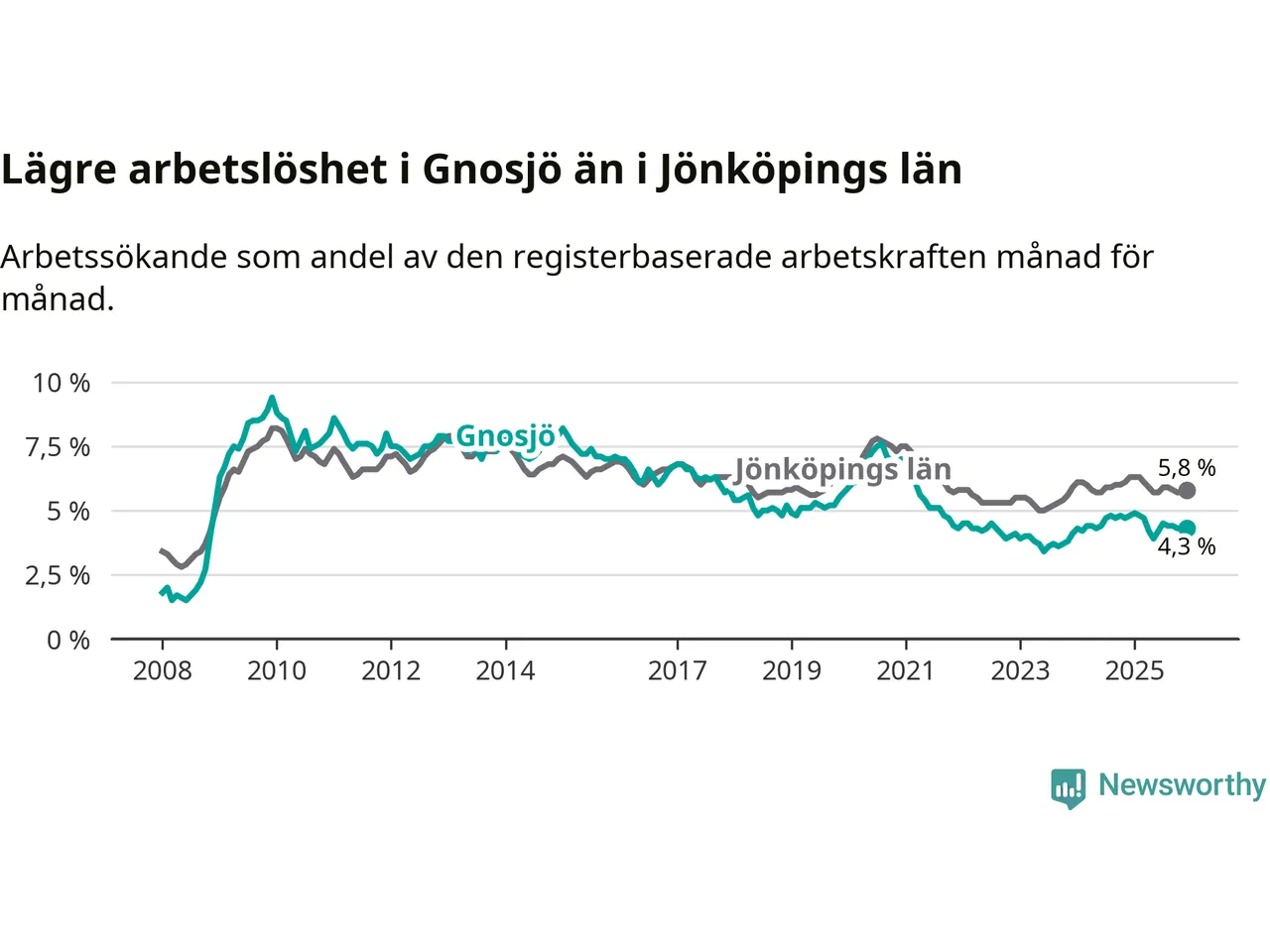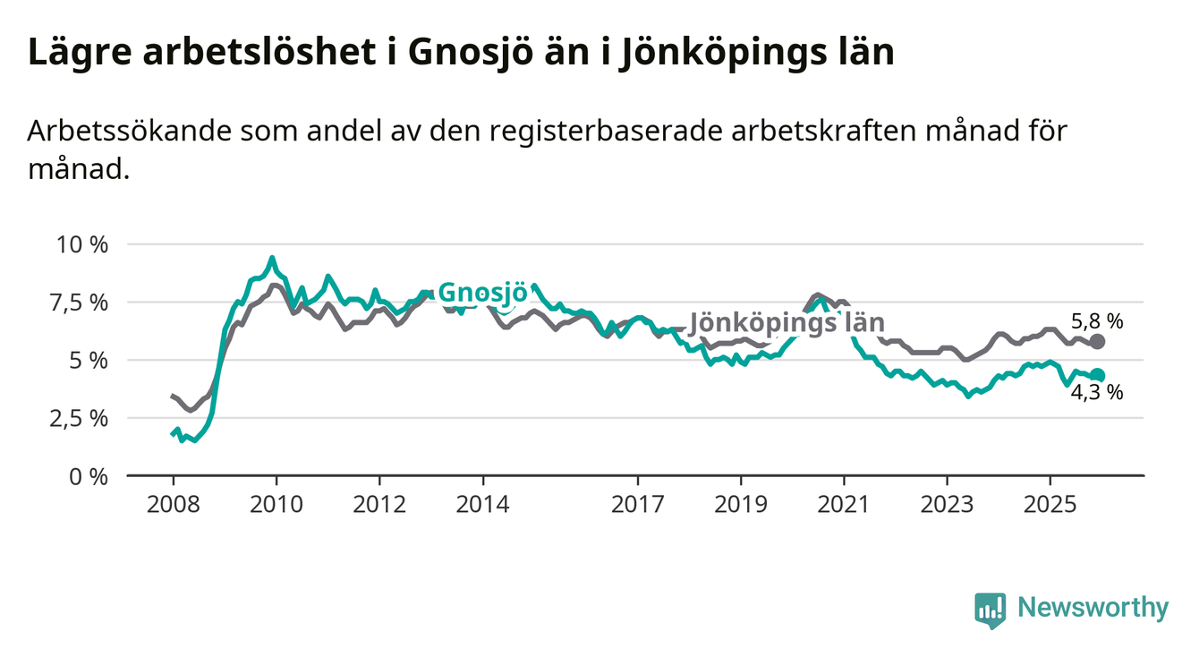 Gnosjö hade redan tidigare lägre arbetslöshet än snittet i hela Jönköpings län och nu växer klyftan (4,3 procent i kommunen, jämfört med 5,8 procent i hela länet). Habo har den lägsta arbetslösheten i länet (3,3 procent), medan Sävsjö har den högsta (7,9 procent). För att Gnosjö skulle komma ner i samma arbetslöshetsnivå som Habo skulle 47 personer behöva sysselsättas.