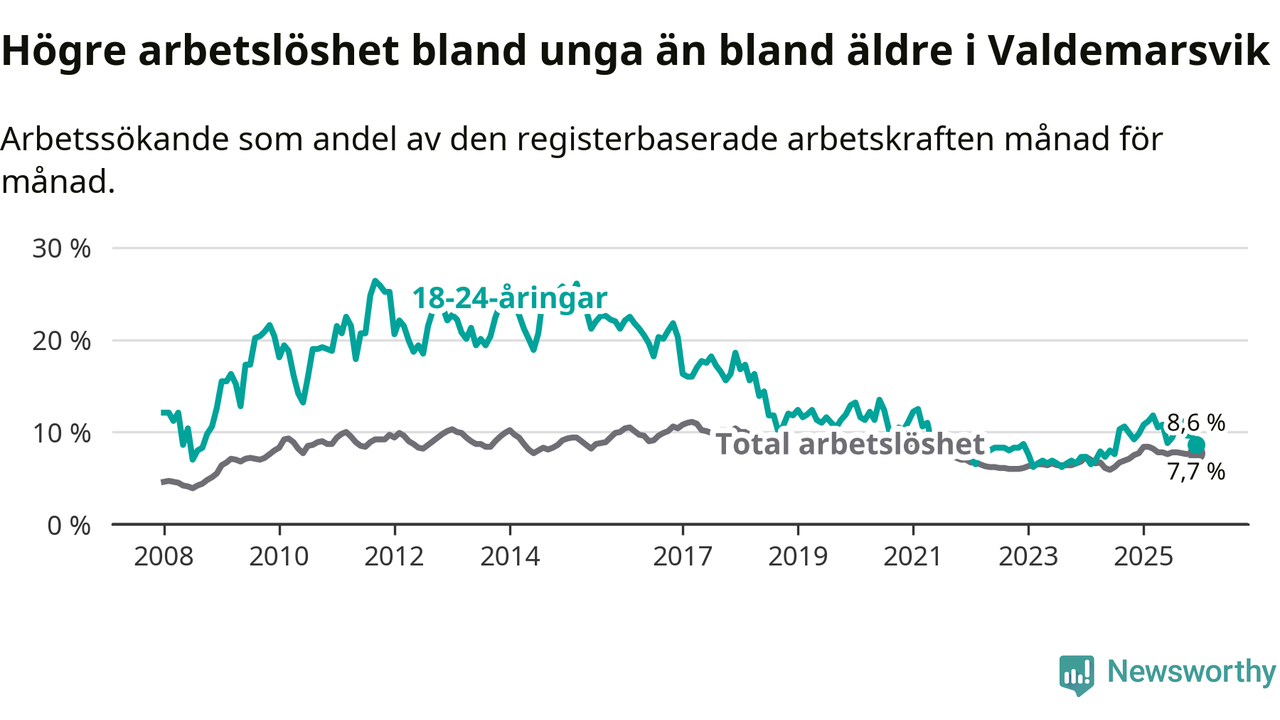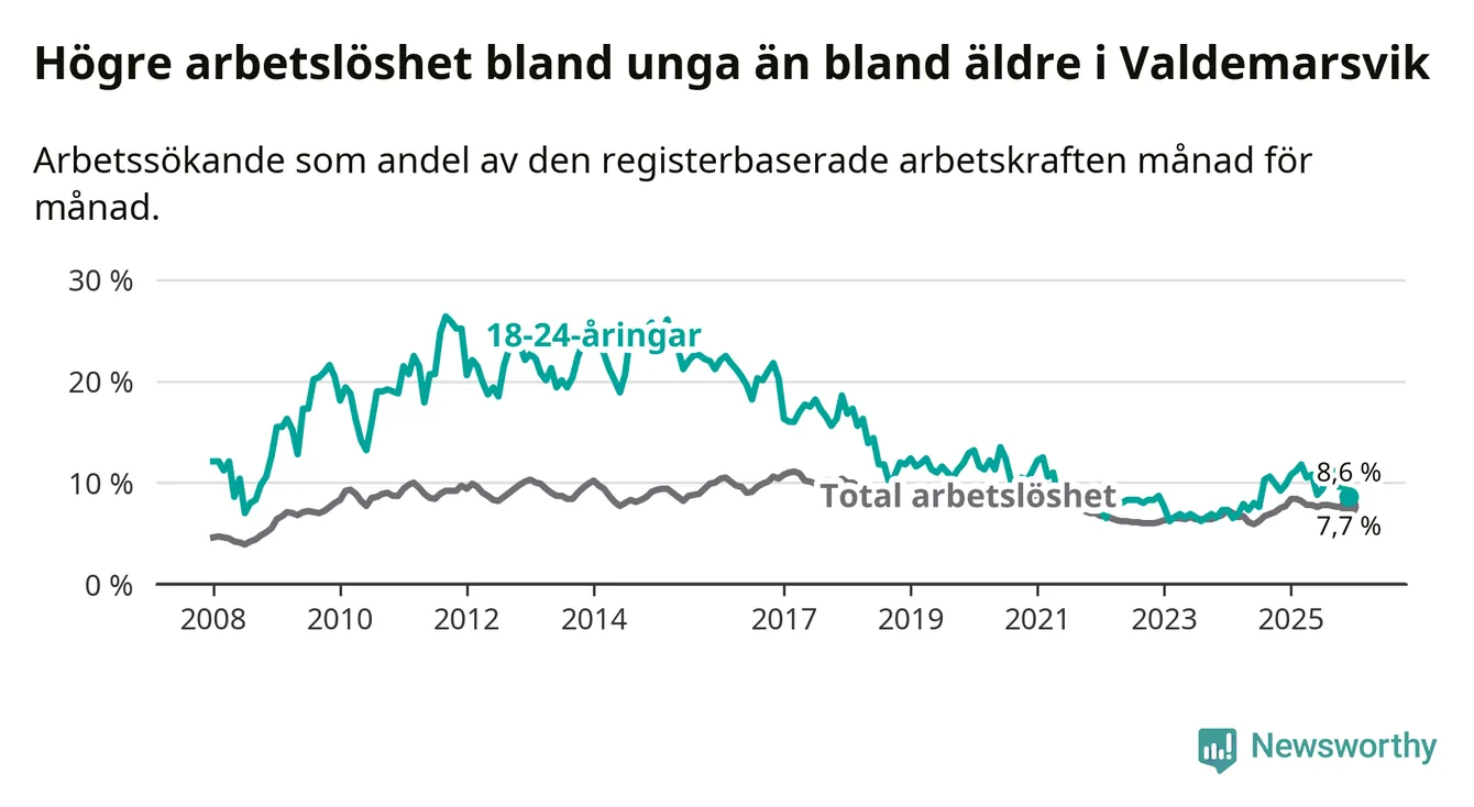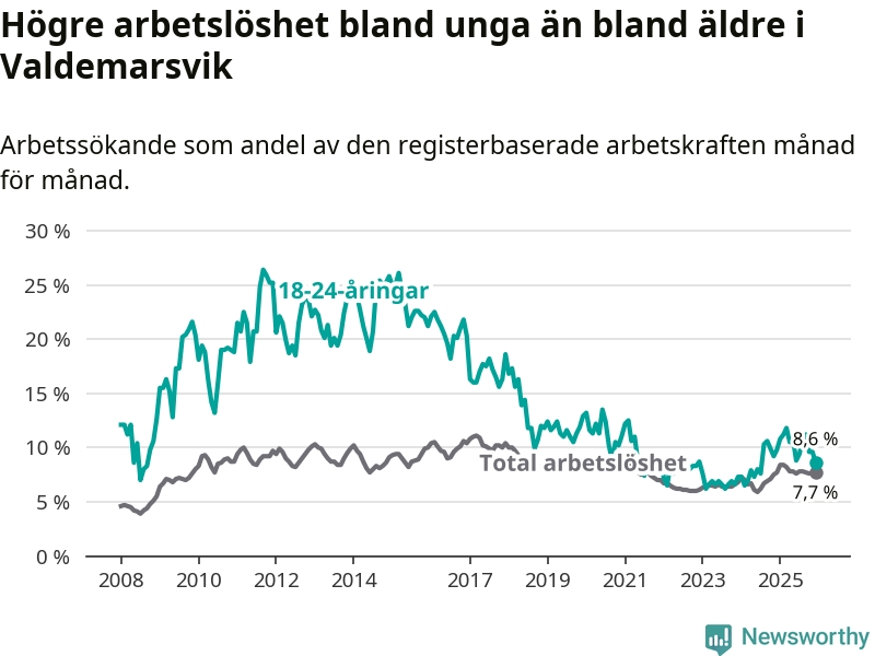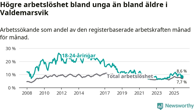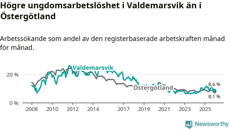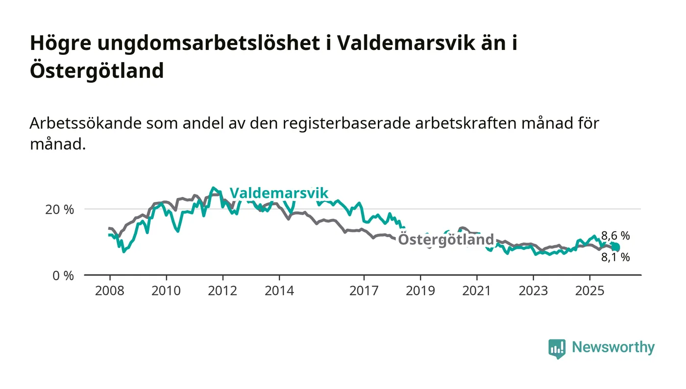 Precis som den totala arbetslösheten ligger ungdomsarbetslösheten i Valdemarsvik högre än i Östergötland som helhet. Skillnaden mellan kommunen och länet är 0,5 procentenheter.