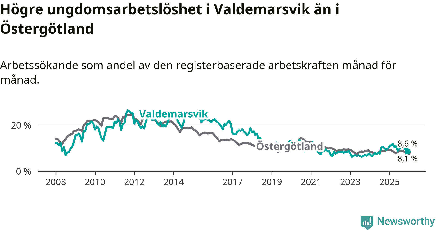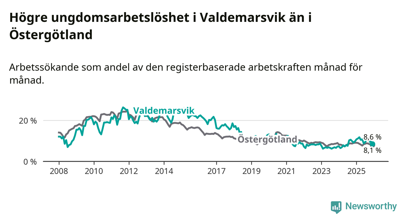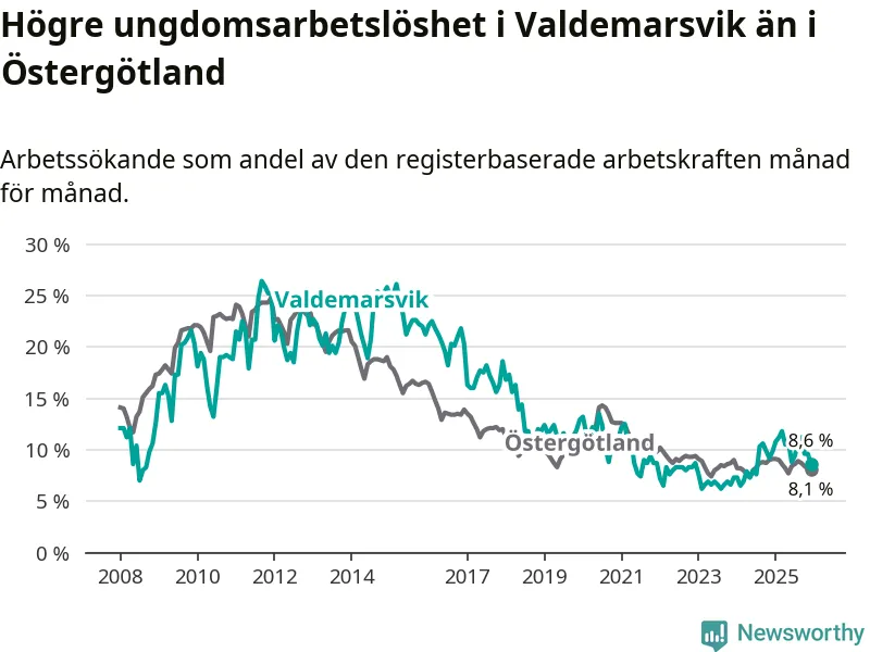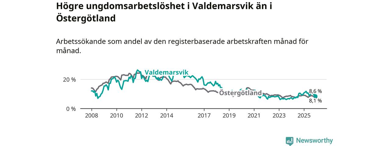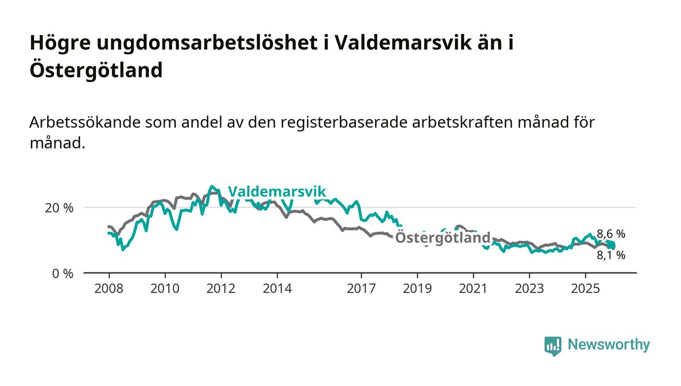 Graf: Arbetslöshet bland unga i Valdemarsviks kommun och Östergötlands län