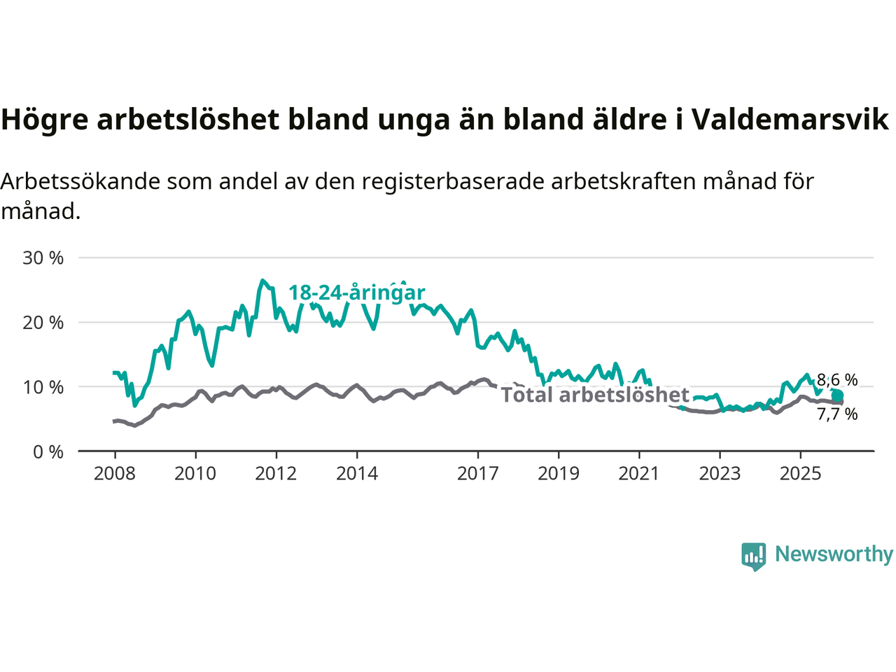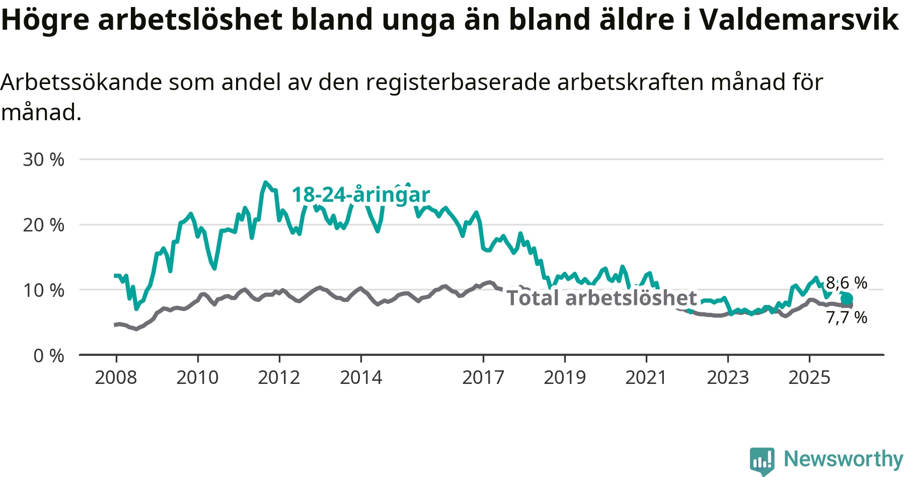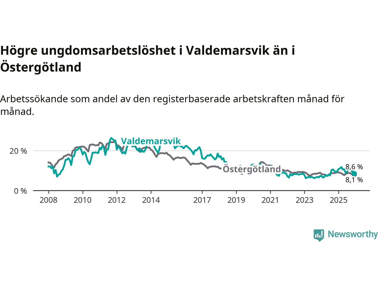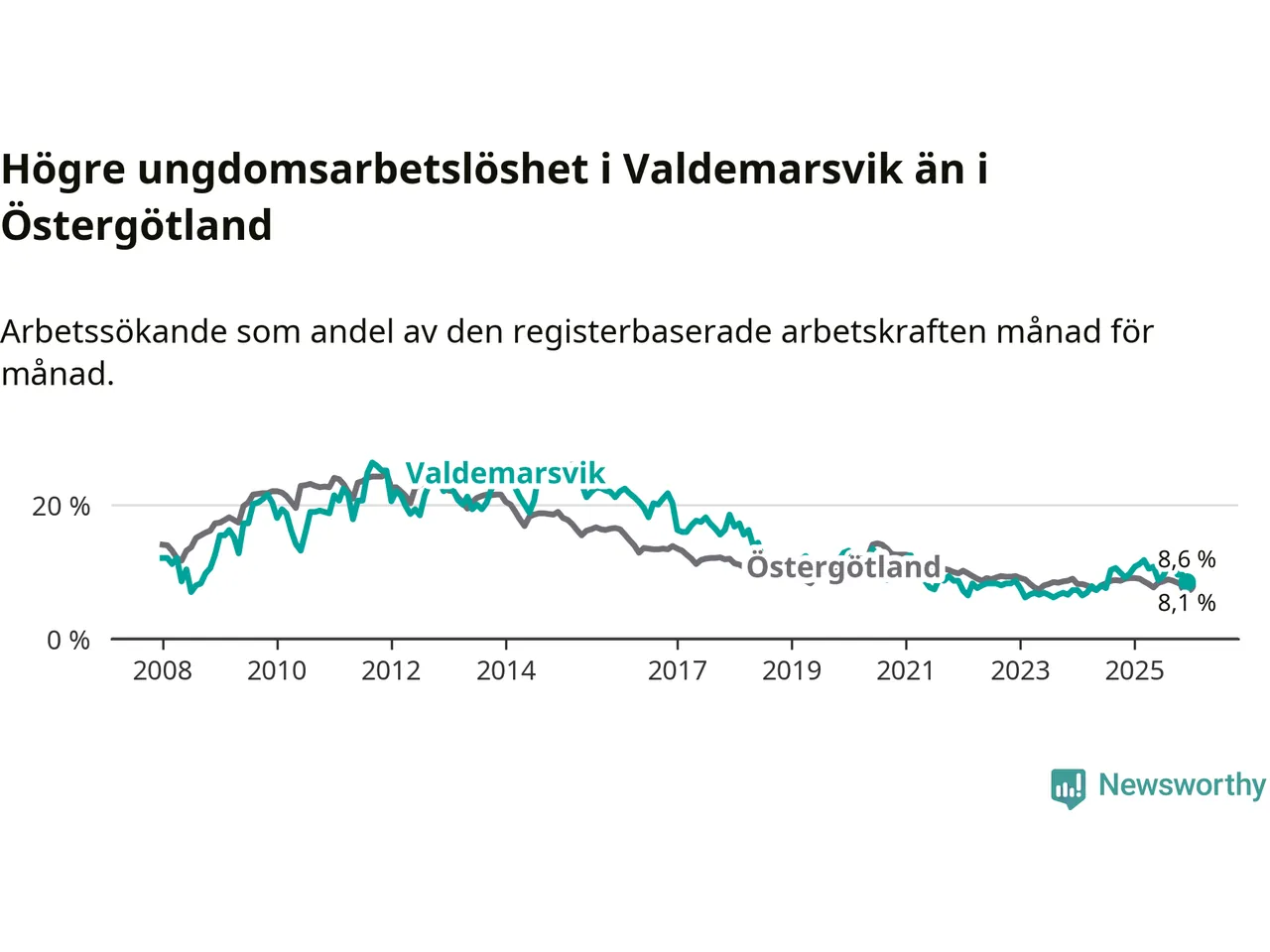 Graf: Arbetslöshet bland unga i Valdemarsviks kommun och Östergötlands län