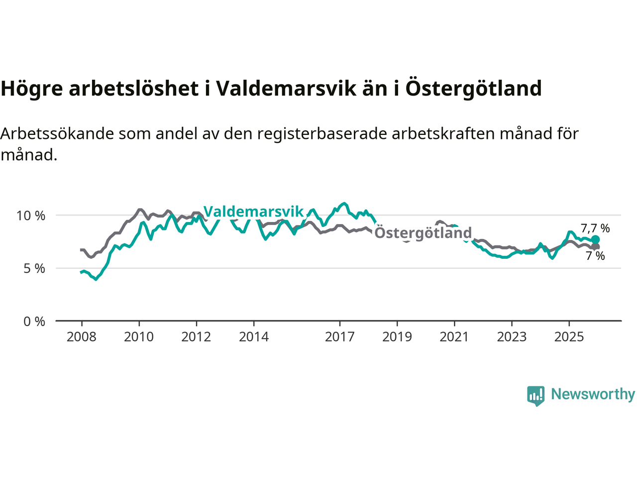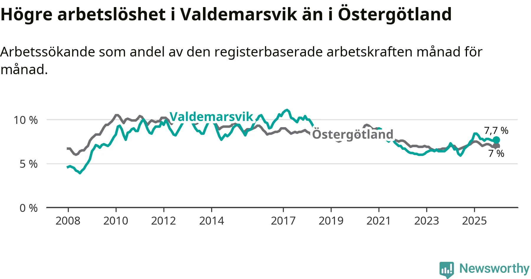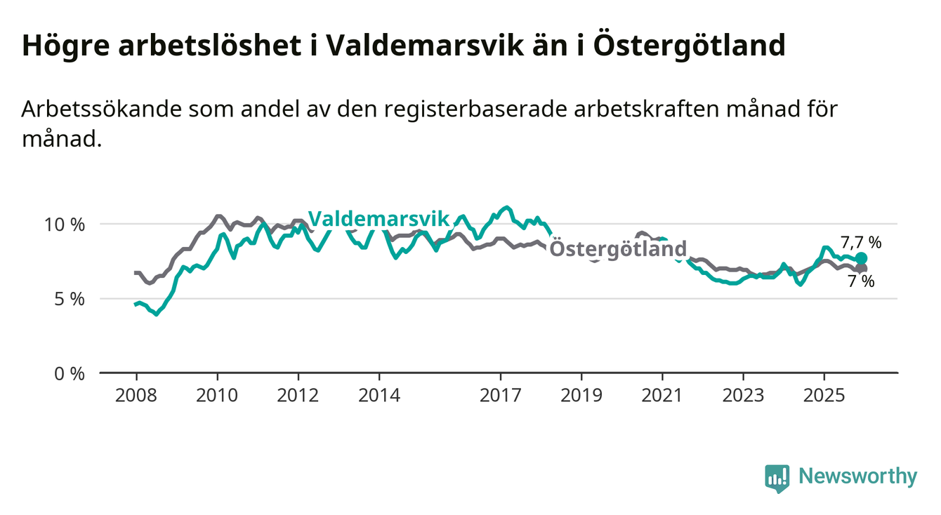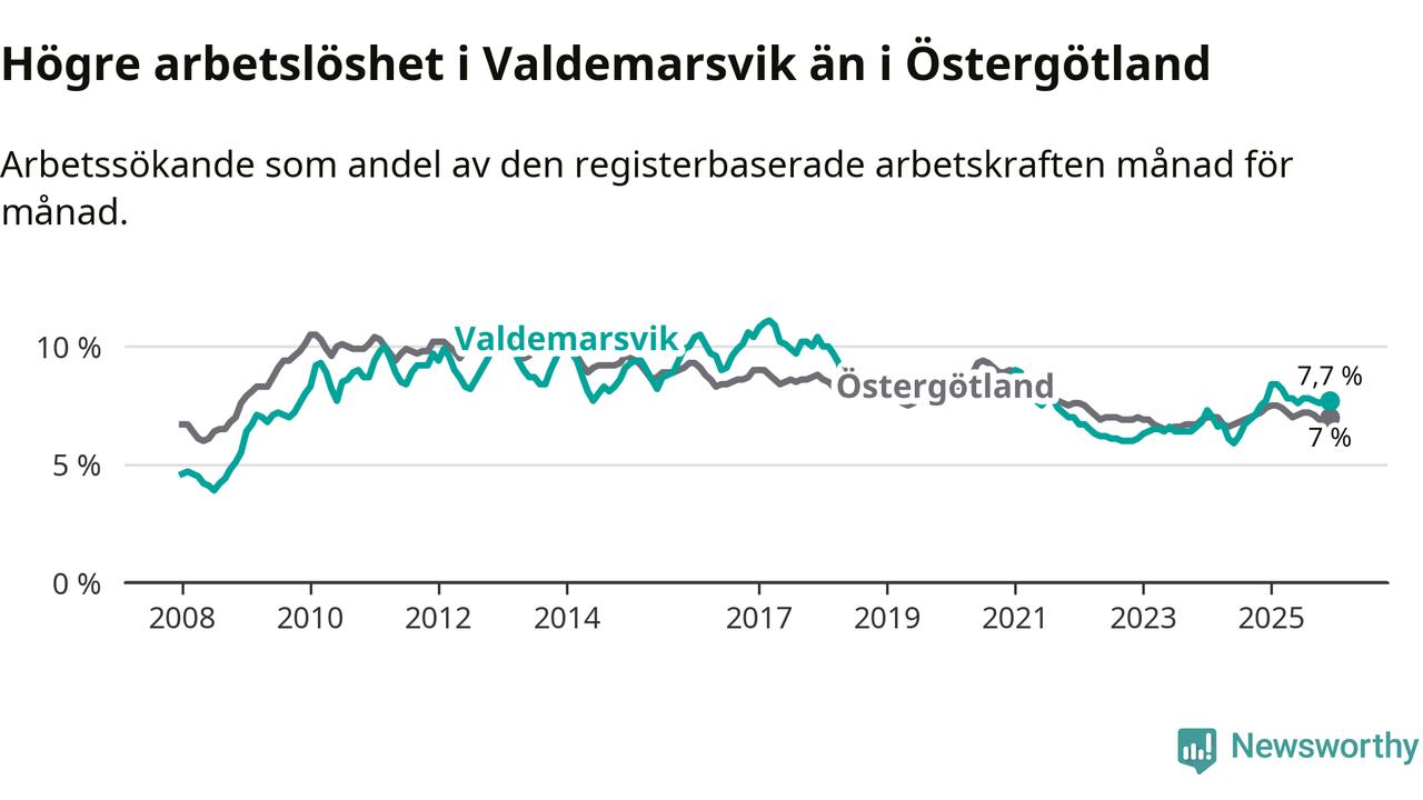 Graf: Arbetslöshet i Valdemarsviks kommun och Östergötlands län