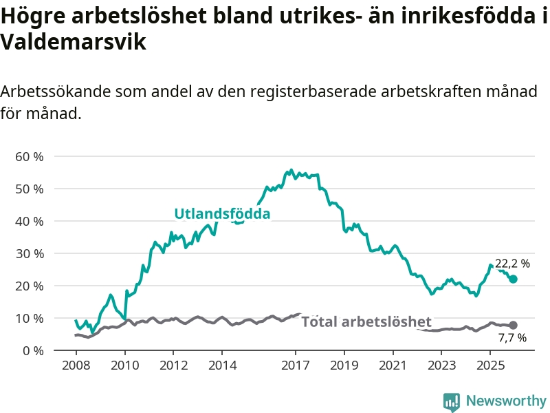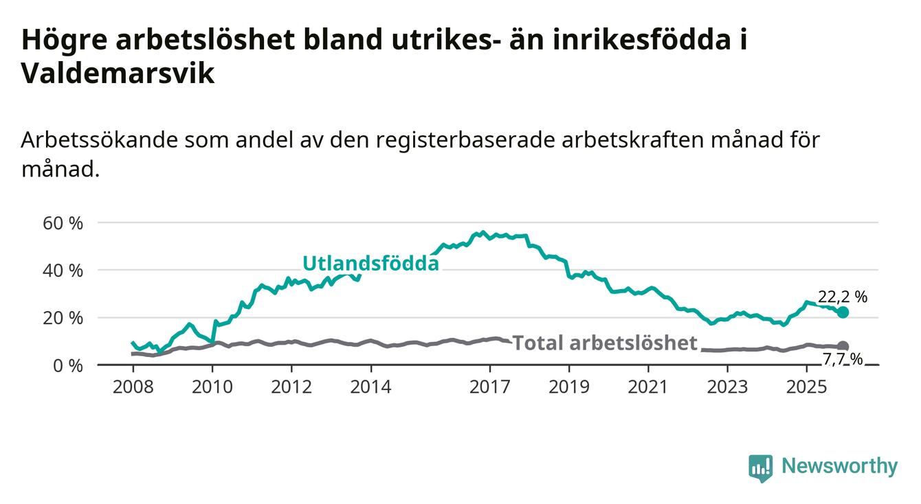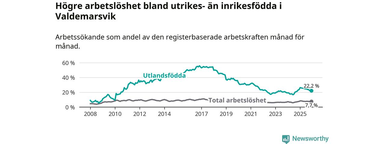 Arbetslösheten bland utlandsfödda var 22,2 procent i Valdemarsvik under december månad, motsvarande 88 av 396 personer. Det är 1,6 procentenheter färre än vid samma tidpunkt i fjol (−4 om man räknar personer).