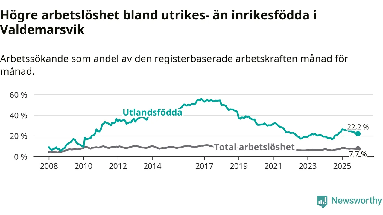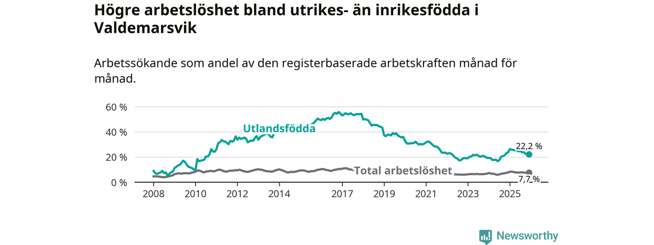 Skillnaden i arbetslöshet mellan utrikesfödda och hela befolkningen är 14,5 procentenheter i Valdemarsvik. Det är en betydligt mindre skillnad än för ett år sedan (−1,6 procentenheter).