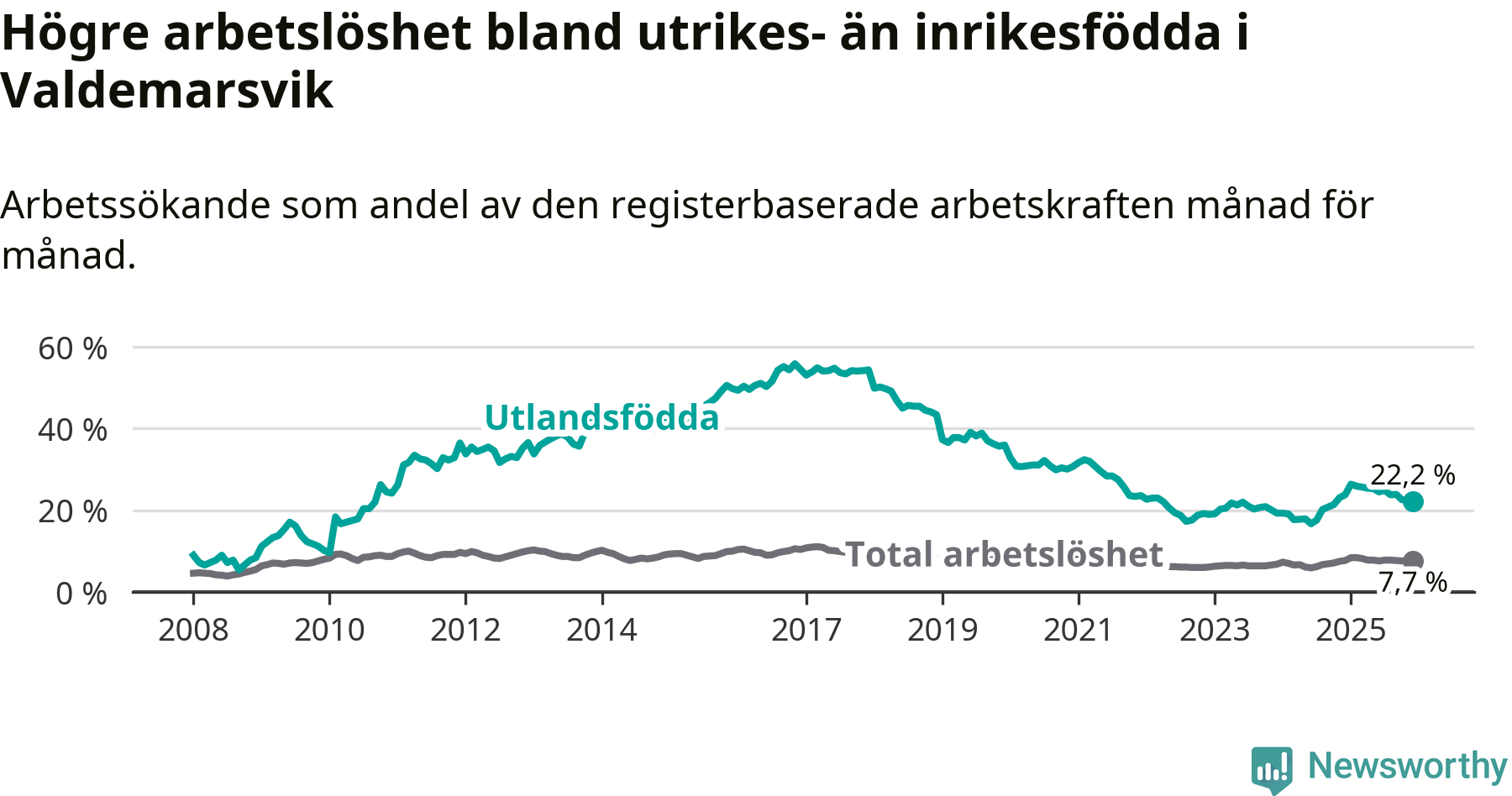 Graf: Skillnad i arbetslöshet mellan utrikesfödda och hela befolkningen i Valdemarsviks kommun