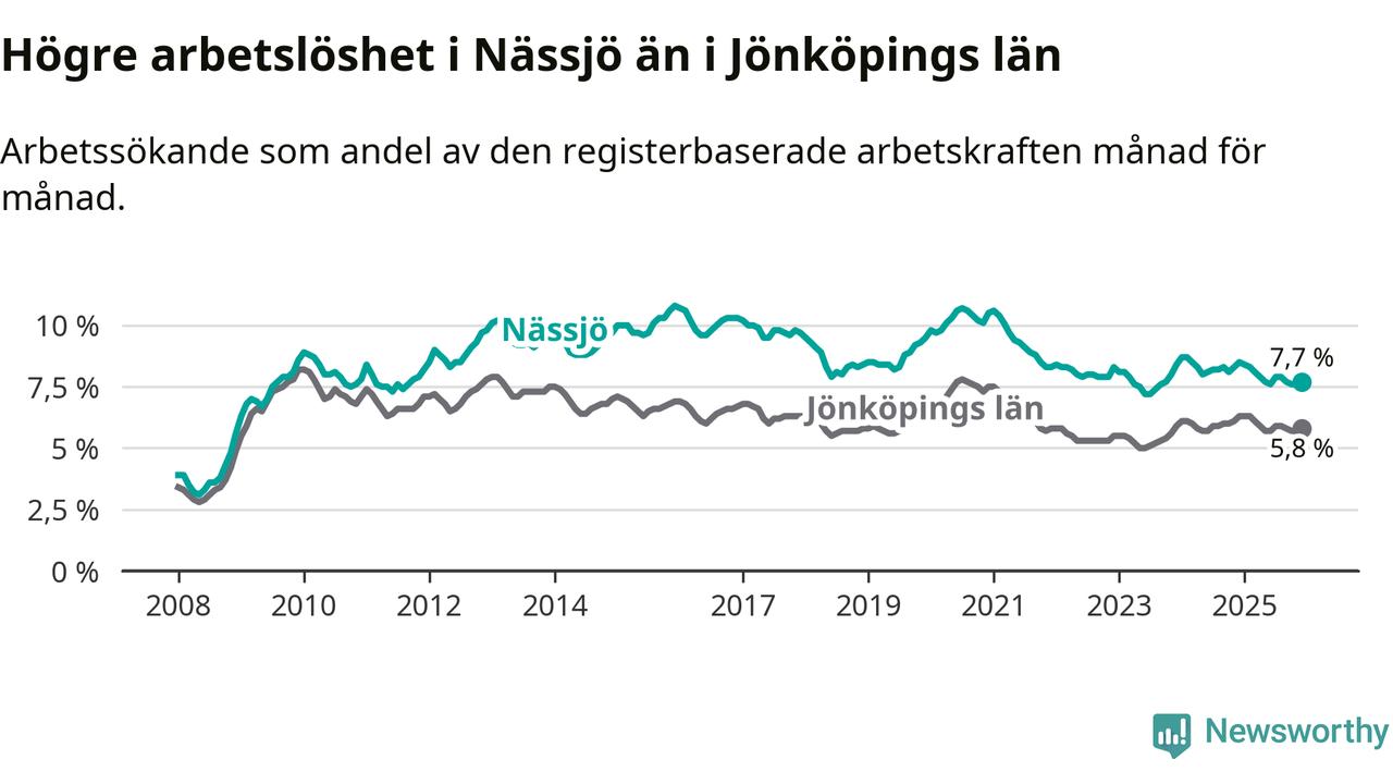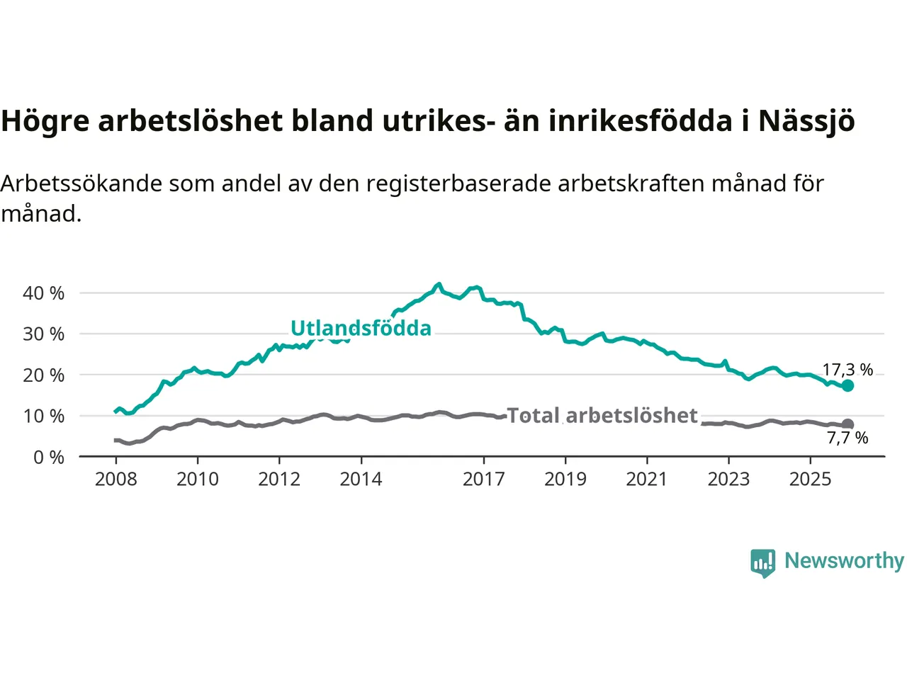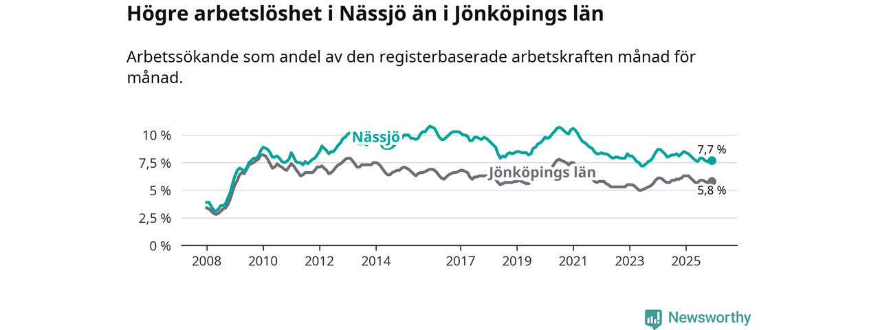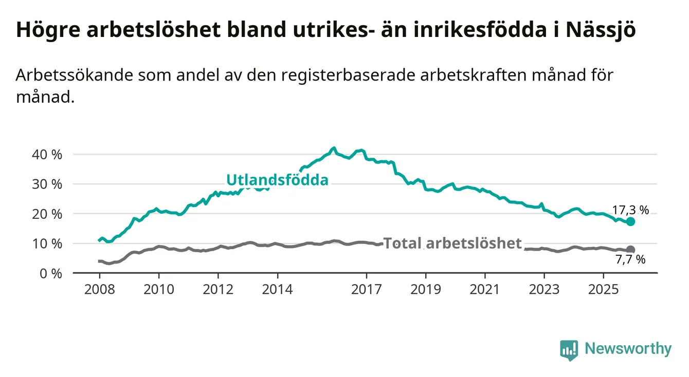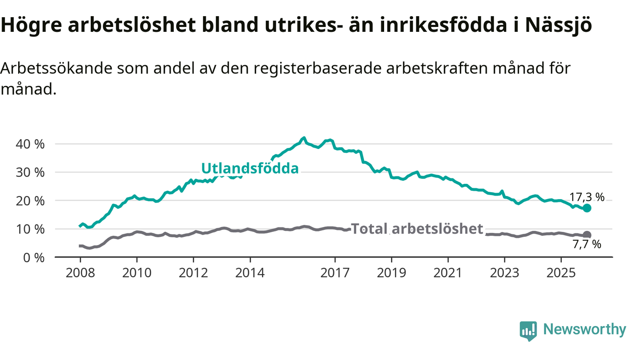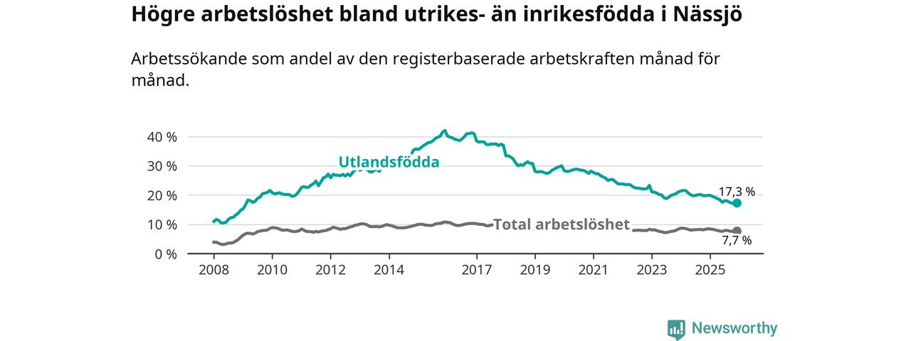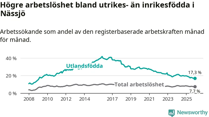 Arbetslösheten bland utlandsfödda var 17,3 procent i Nässjö under december månad, motsvarande 684 av 3 954 personer. Det är 2,6 procentenheter färre än vid samma tidpunkt i fjol (−105 om man räknar personer). Därmed är de utlandsföddas arbetslöshet lägre än vid samma tidpunkt i fjol för 15:e månaden i följd. Sedan september 2024 har arbetslösheten bland utlandsfödda minskat från 20,2 till 17,3 procent.