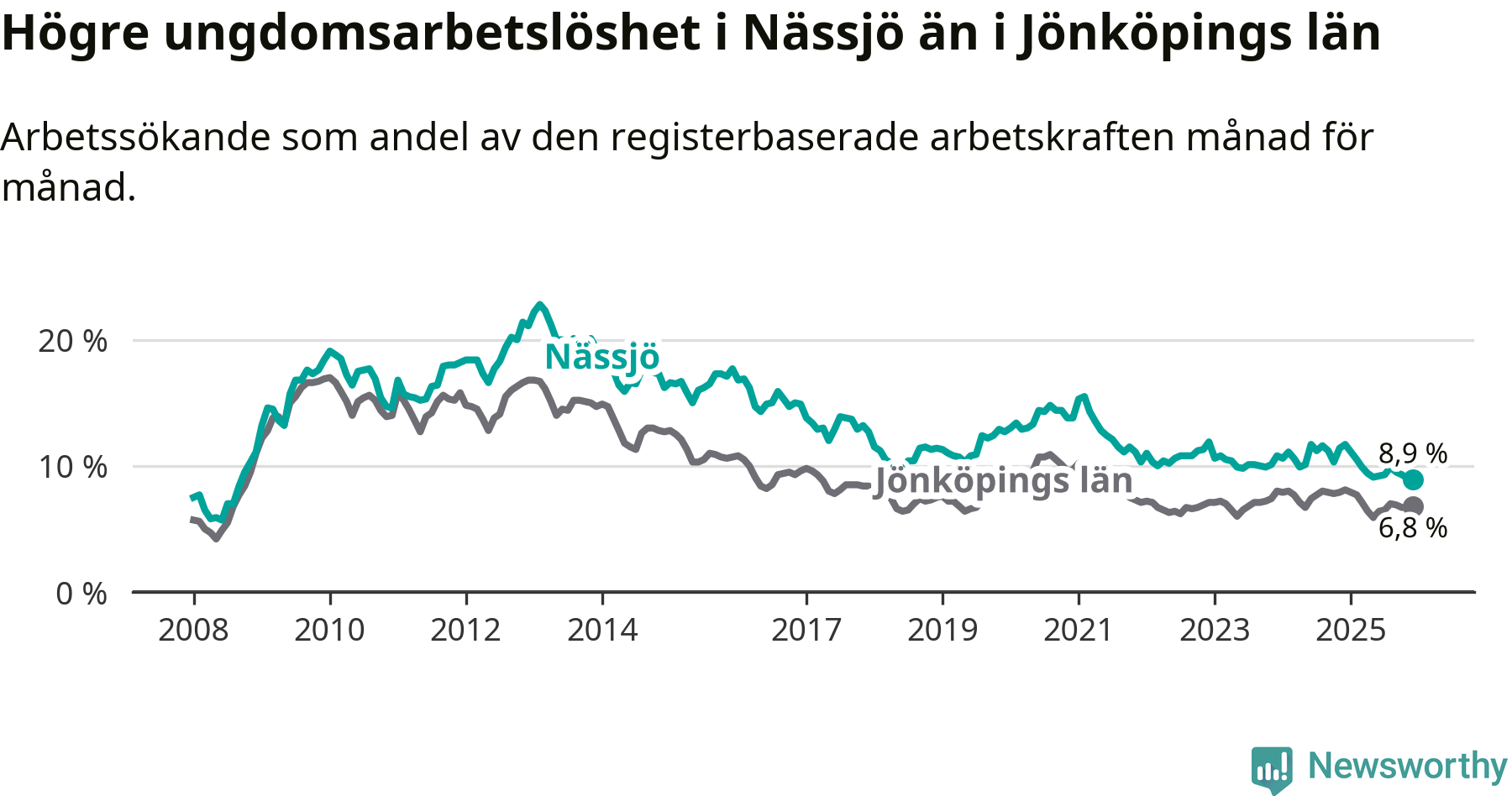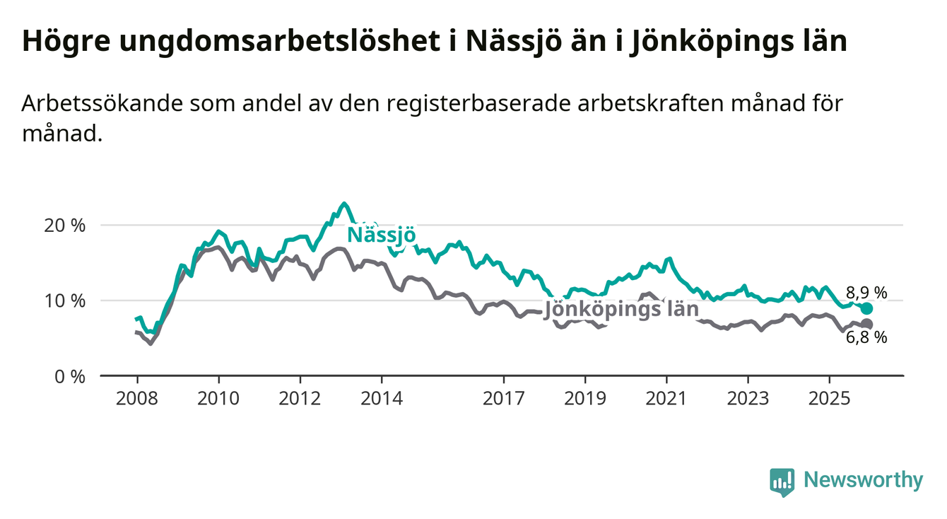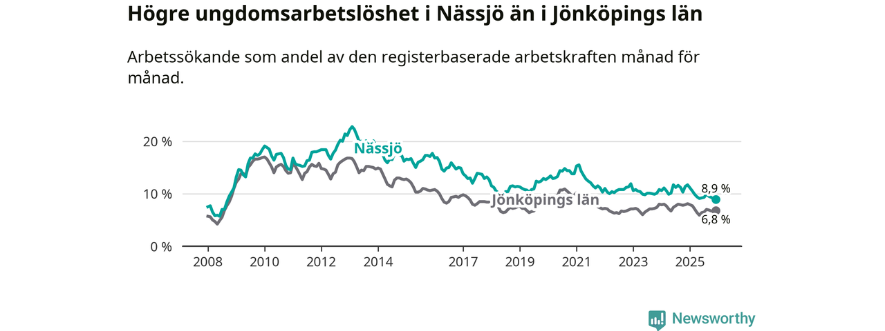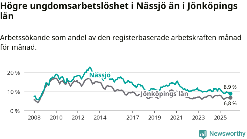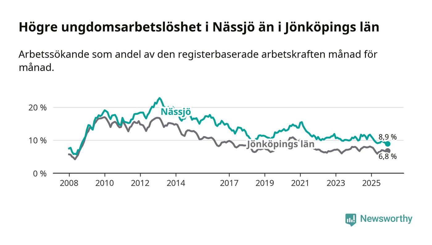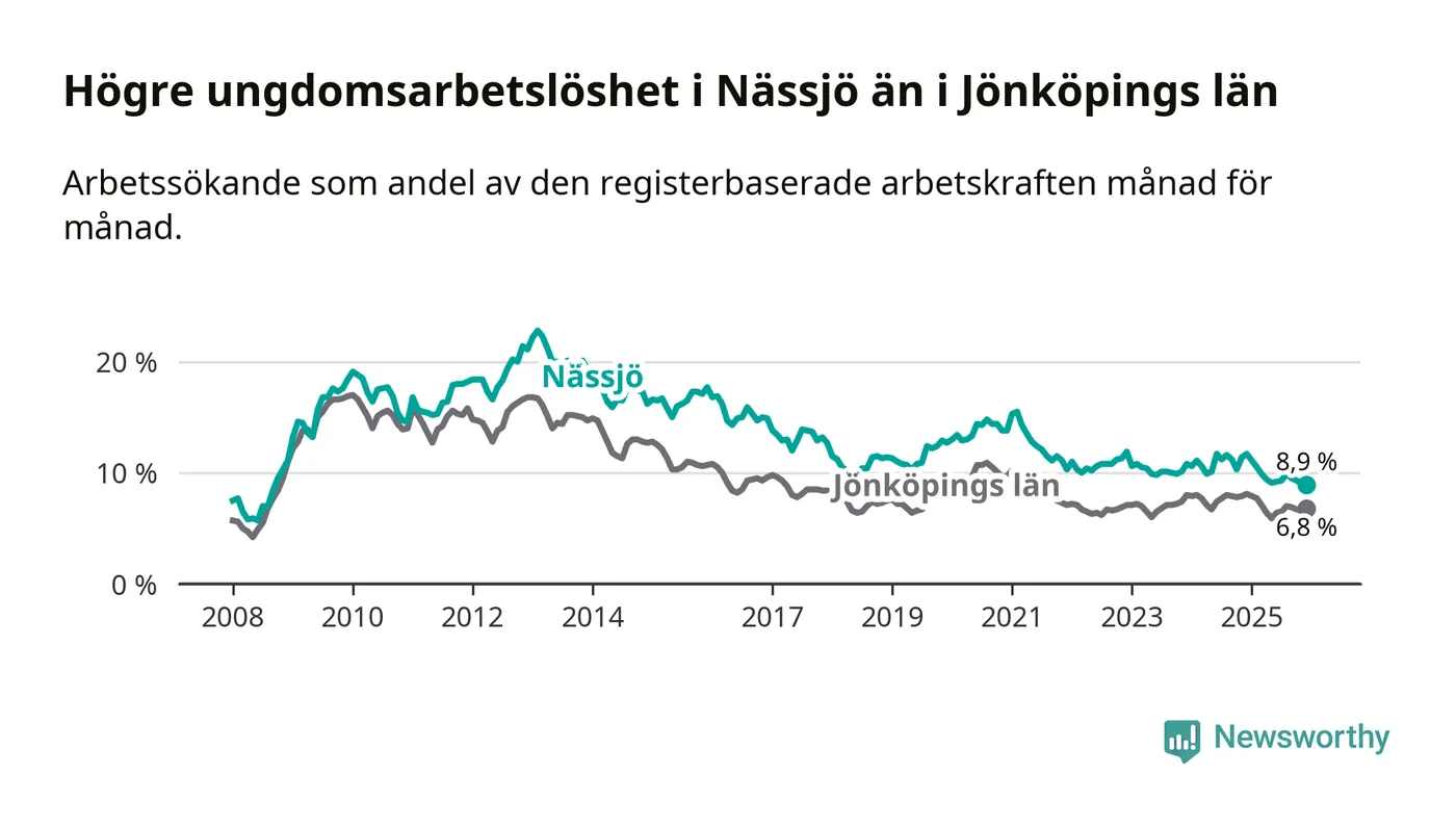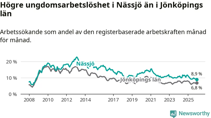 Precis som den totala arbetslösheten ligger ungdomsarbetslösheten i Nässjö högre än i Jönköpings län som helhet. Skillnaden mellan kommunen och länet är 2,1 procentenheter.