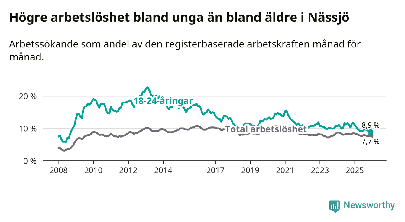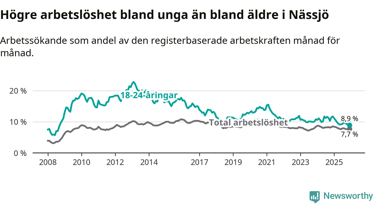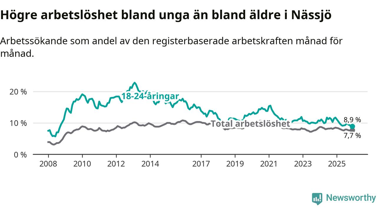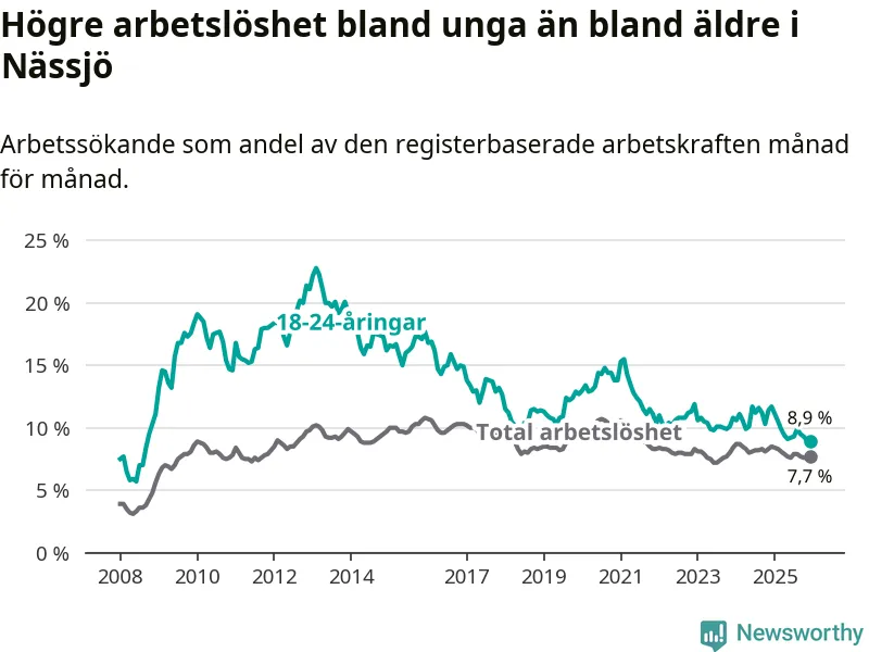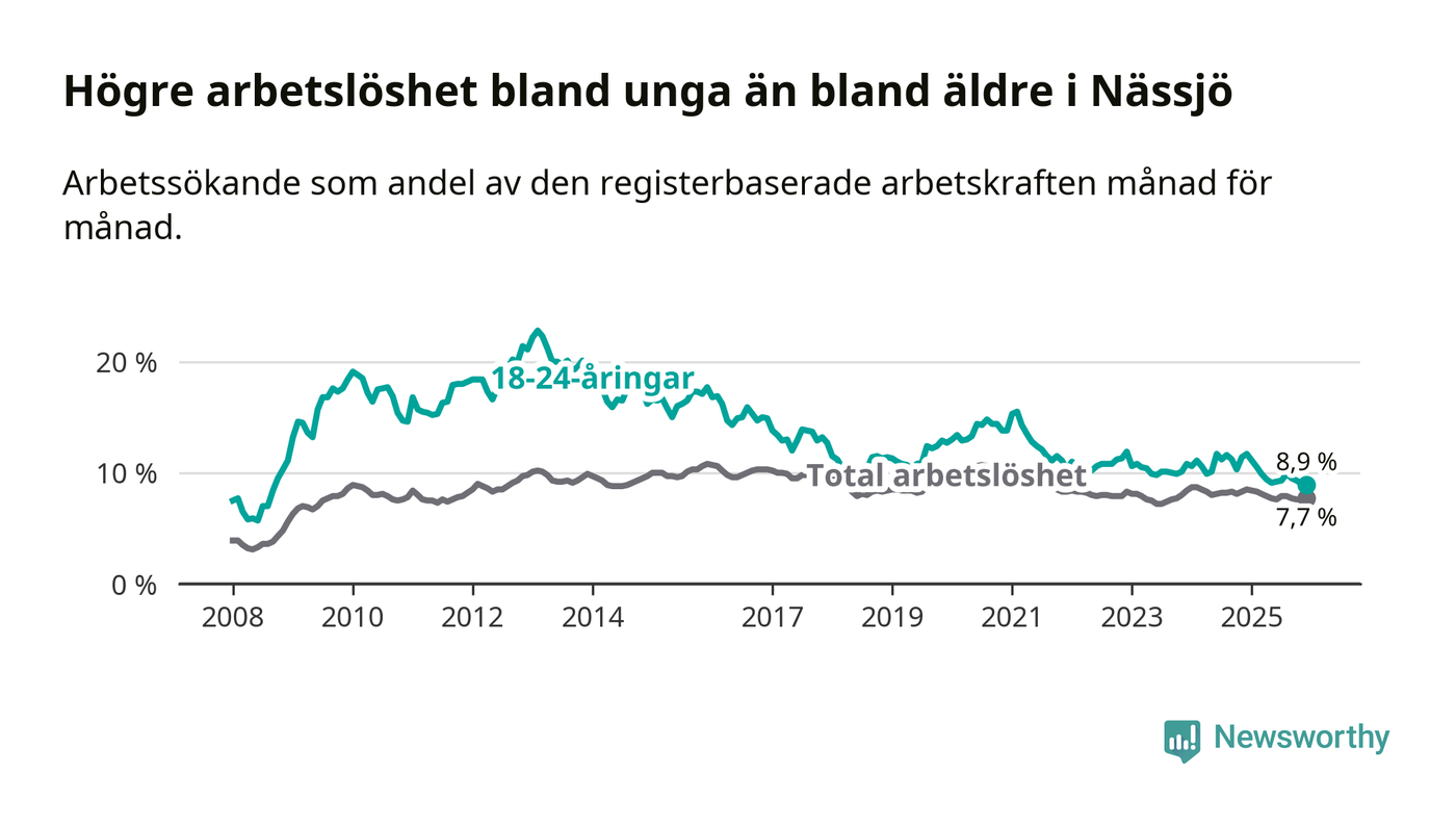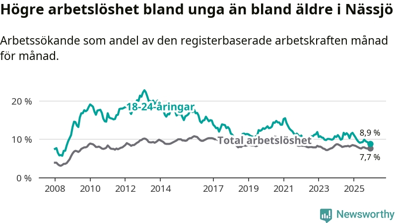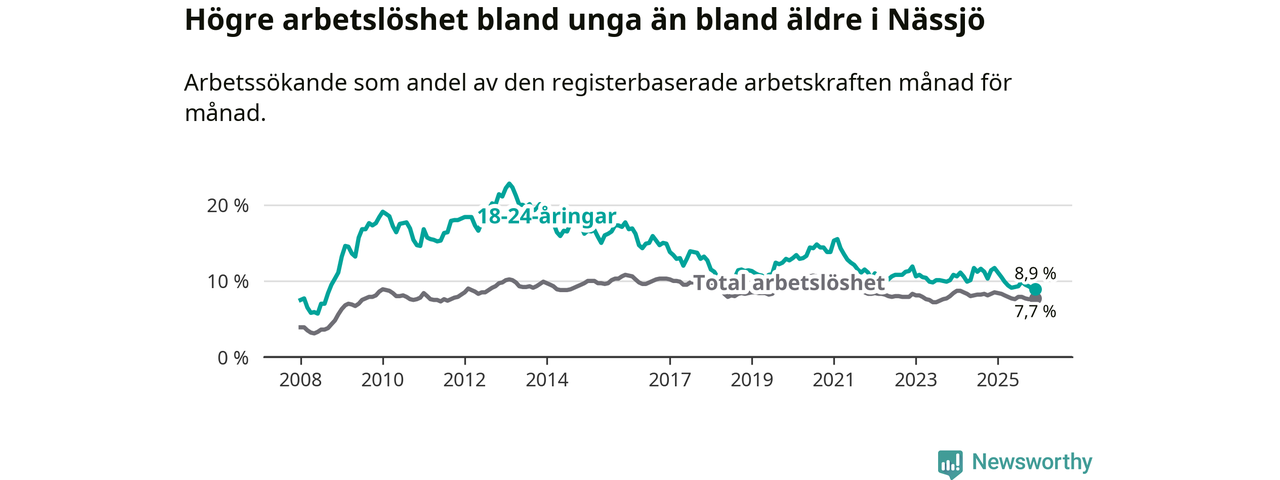 I och med den senaste månadens nedgång har de ungas arbetslöshet i Nässjö sjunkit elva månader i följd (ner från 11,1 procent i januari 2025 till 8,9 procent nu). Den nuvarande arbetslöshetsnivån är den lägsta sedan september 2008.