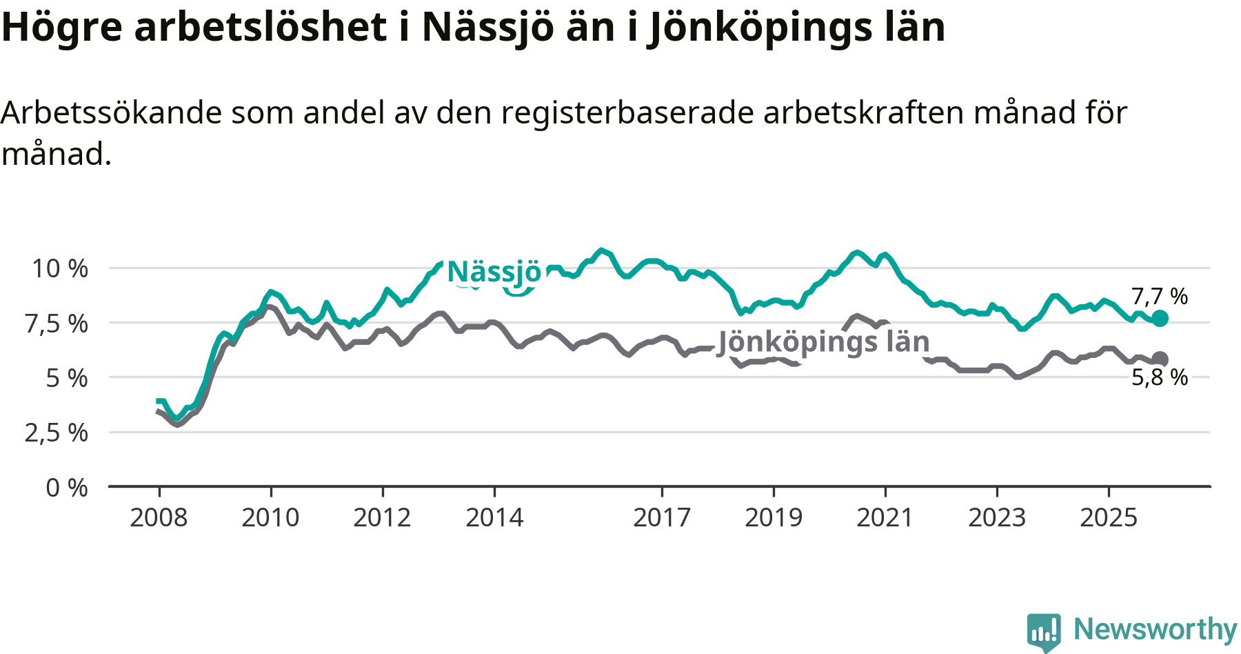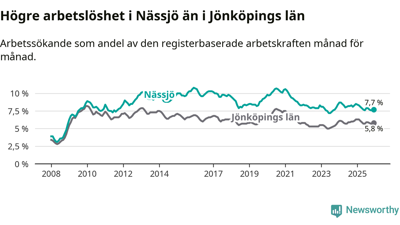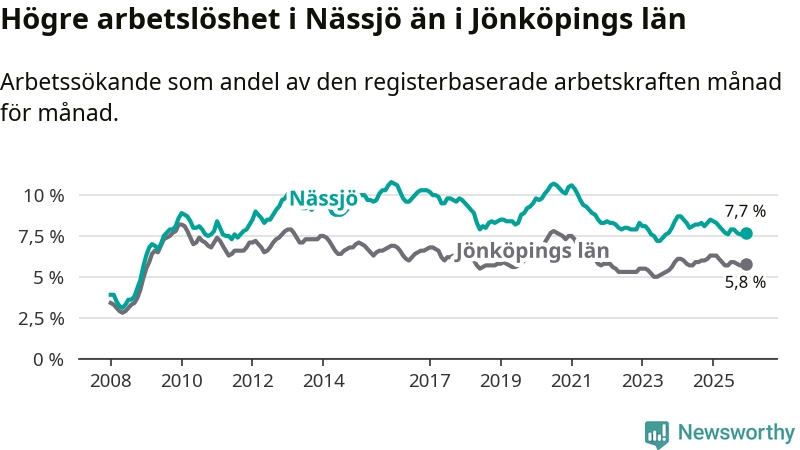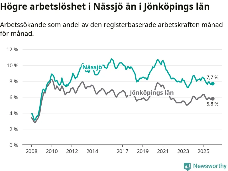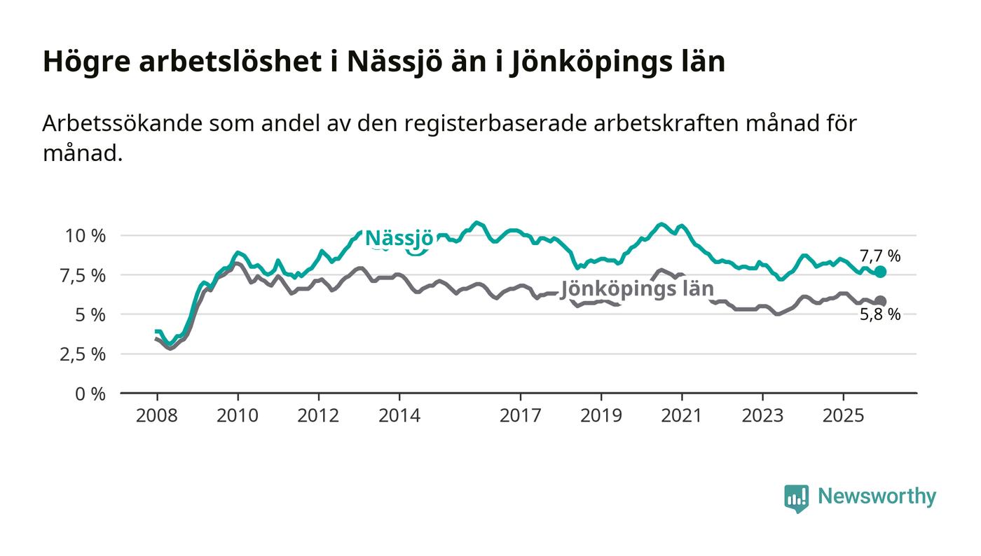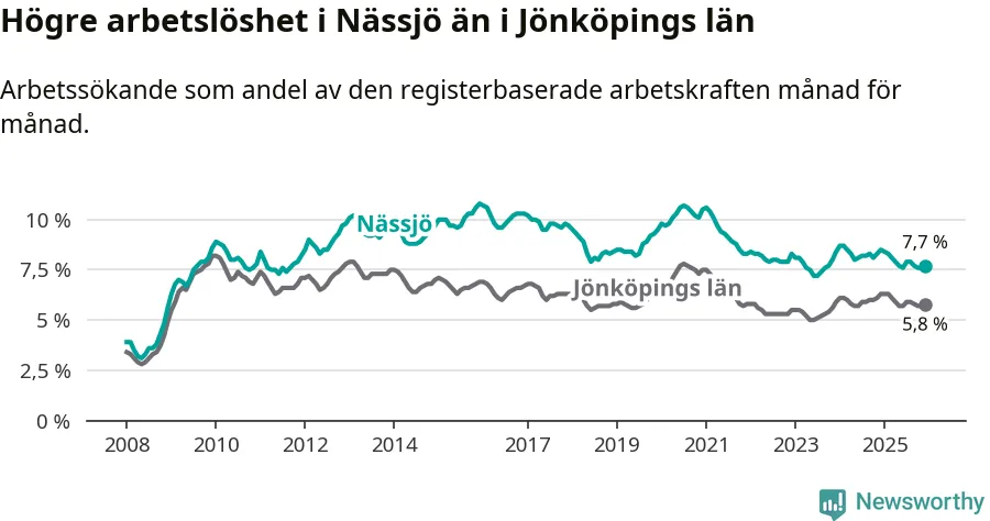 Under december månad rapporterade Nässjö kommun en total arbetslöshet på 7,7 procent. Det är en minskning jämfört med samma tidpunkt i fjol (−0,8 procentenheter). Även i Jönköpings län sjunker arbetslösheten .