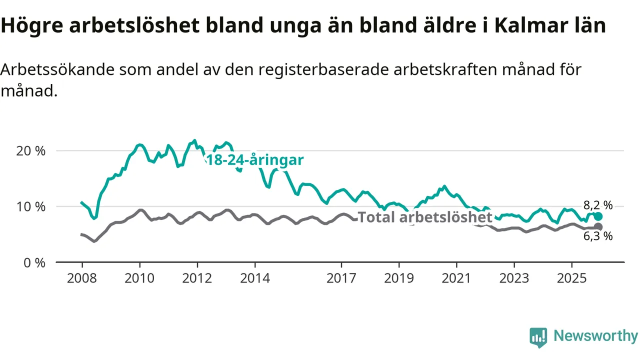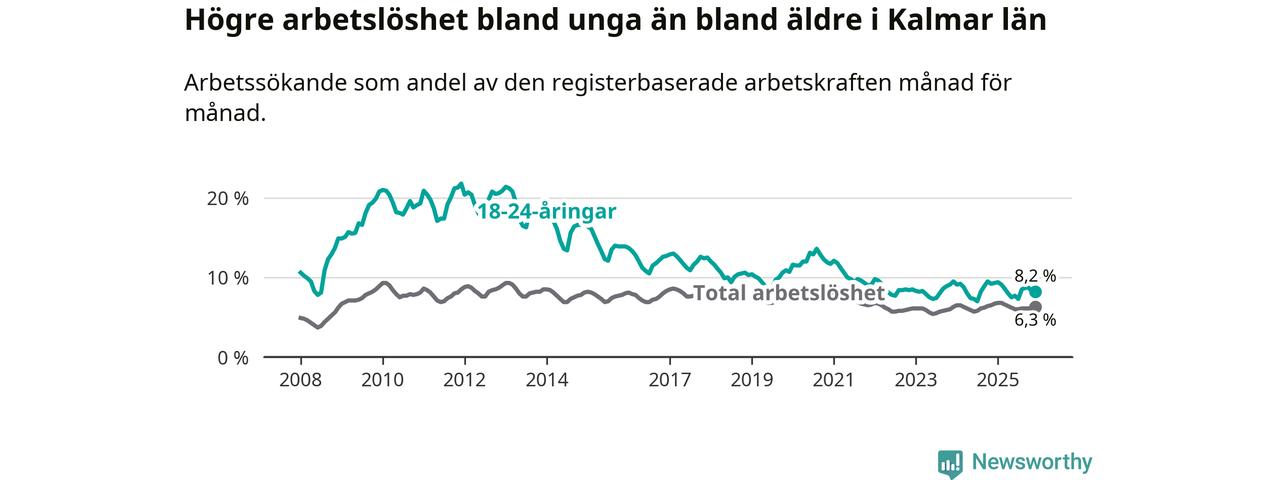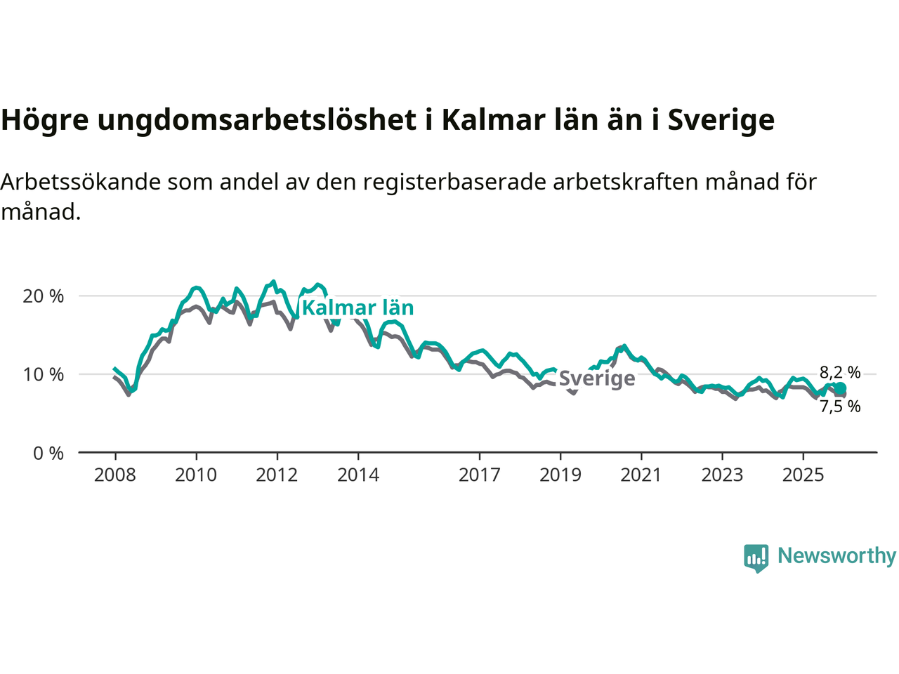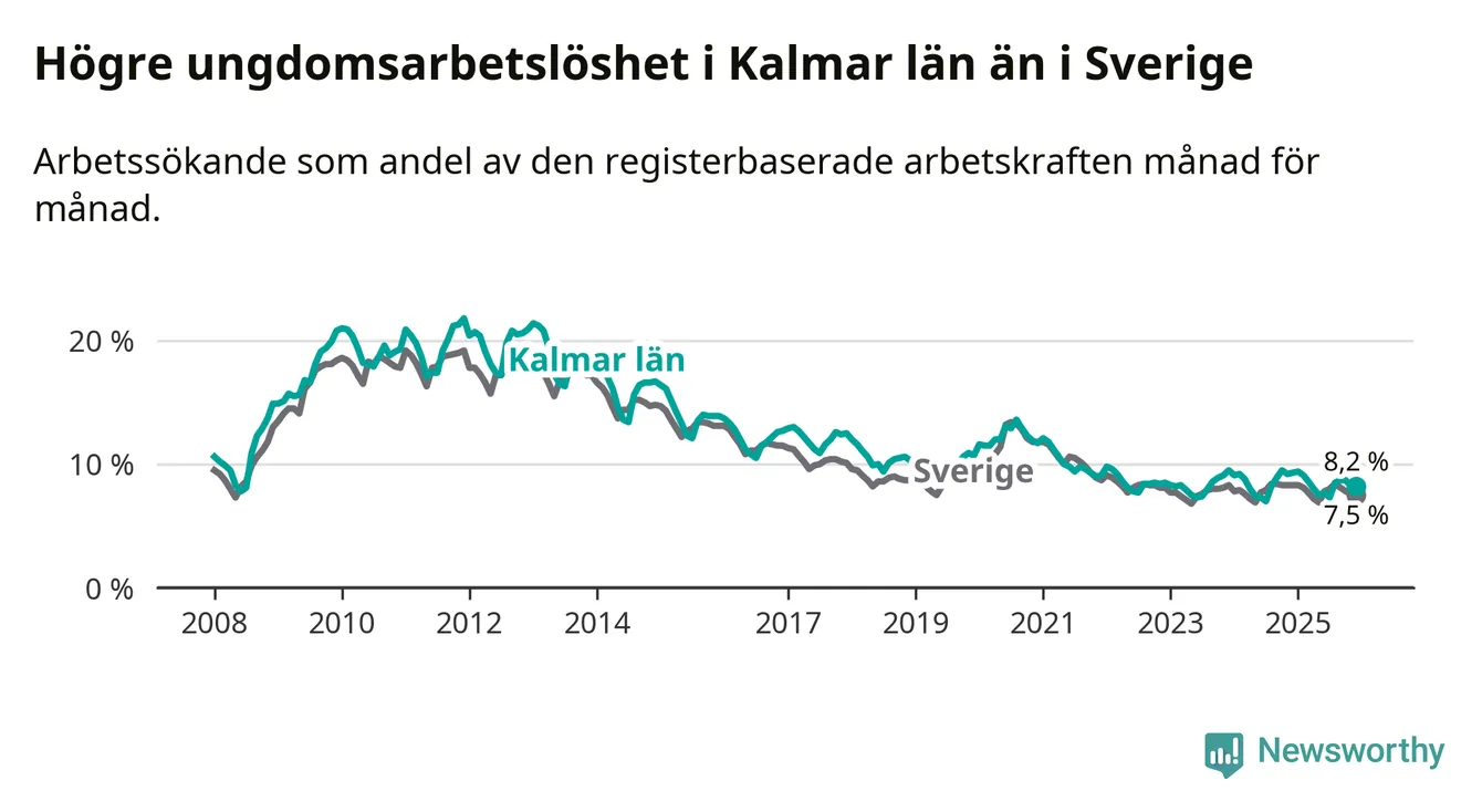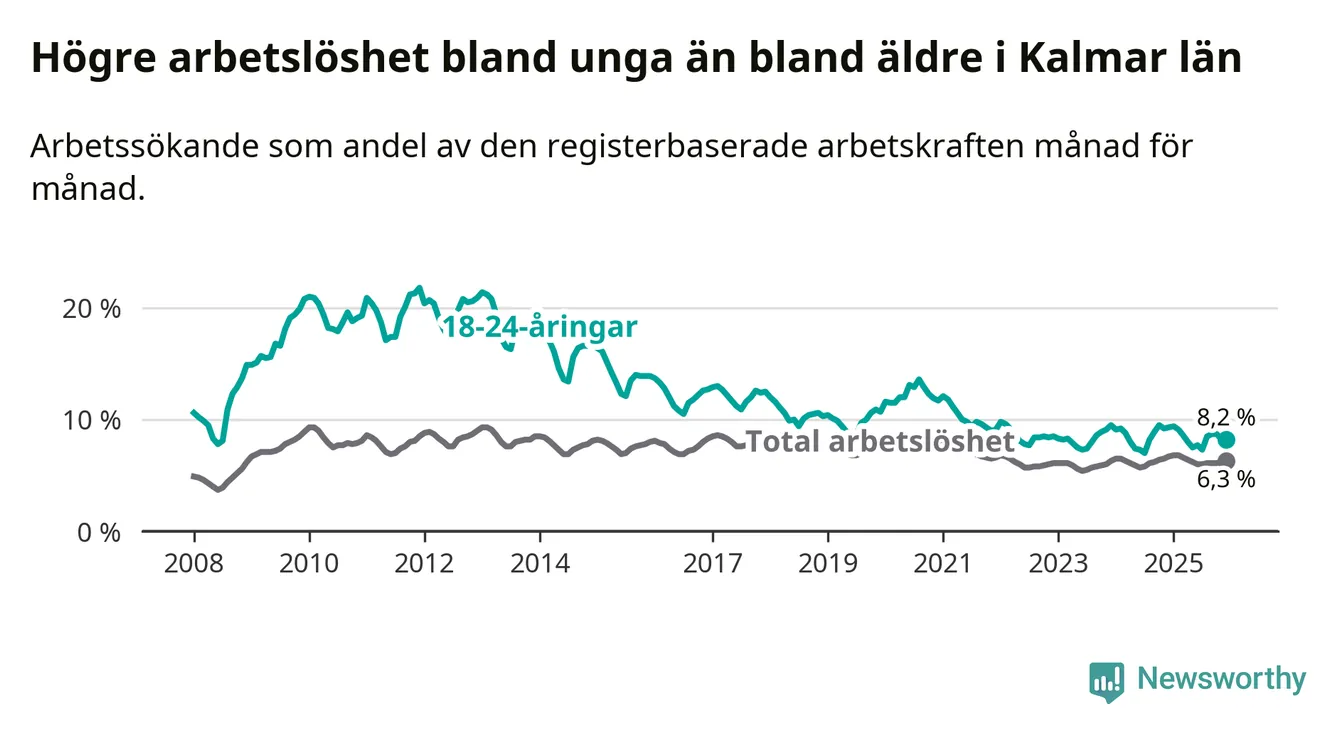 Medan Kalmar län har lägre total arbetslöshet än Sverige, ligger ungdomsarbetslösheten 0,7 procentenheter högre i Kalmar.