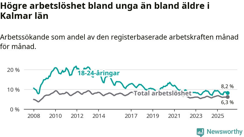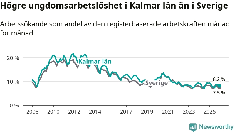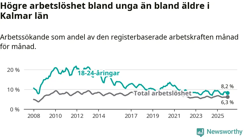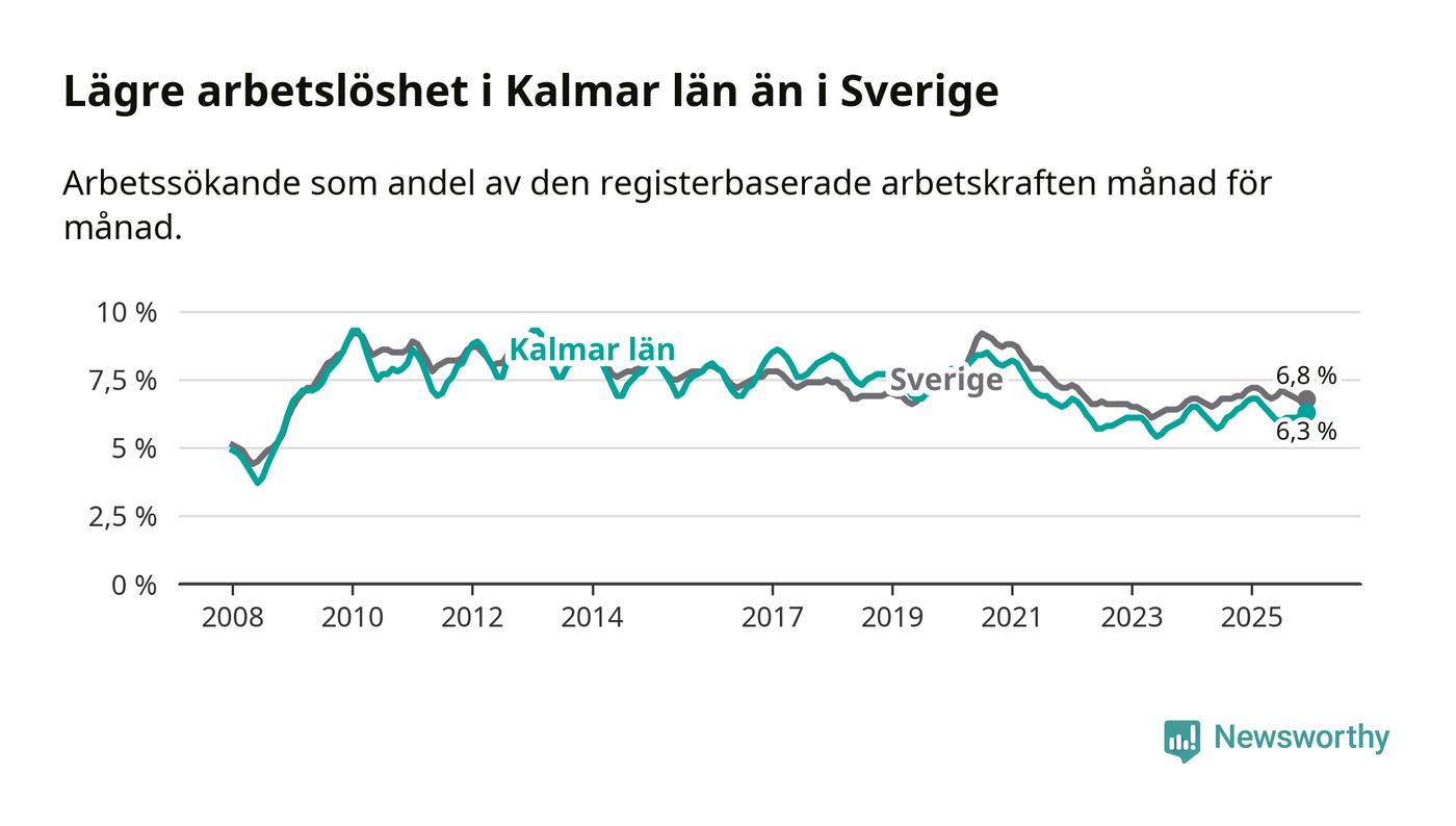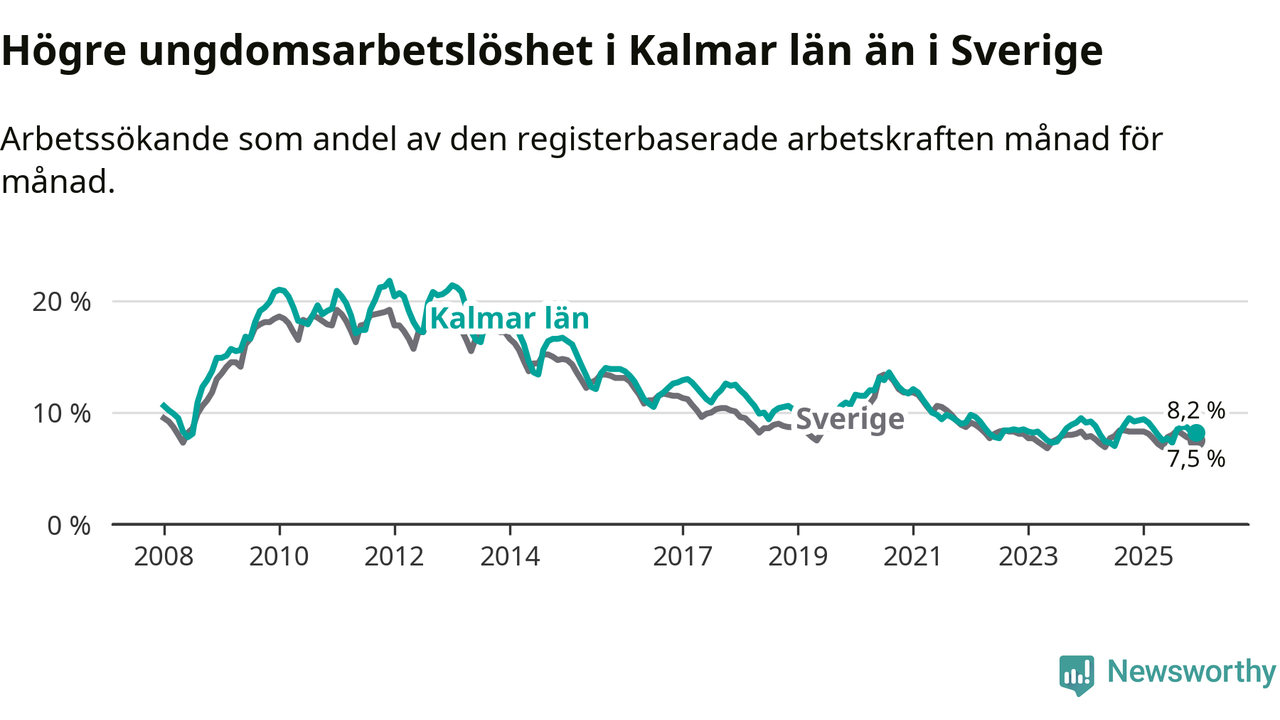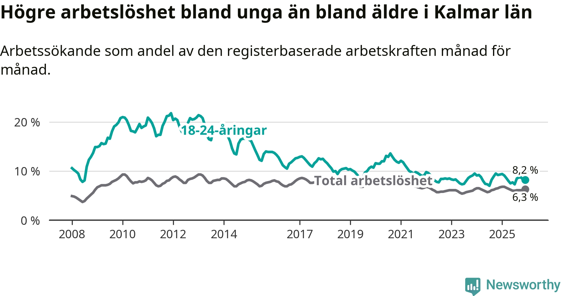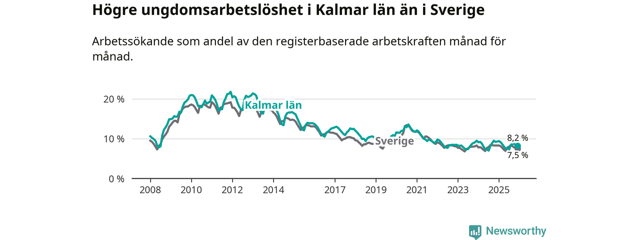 Medan Kalmar län har lägre total arbetslöshet än Sverige, ligger ungdomsarbetslösheten 0,7 procentenheter högre i Kalmar.