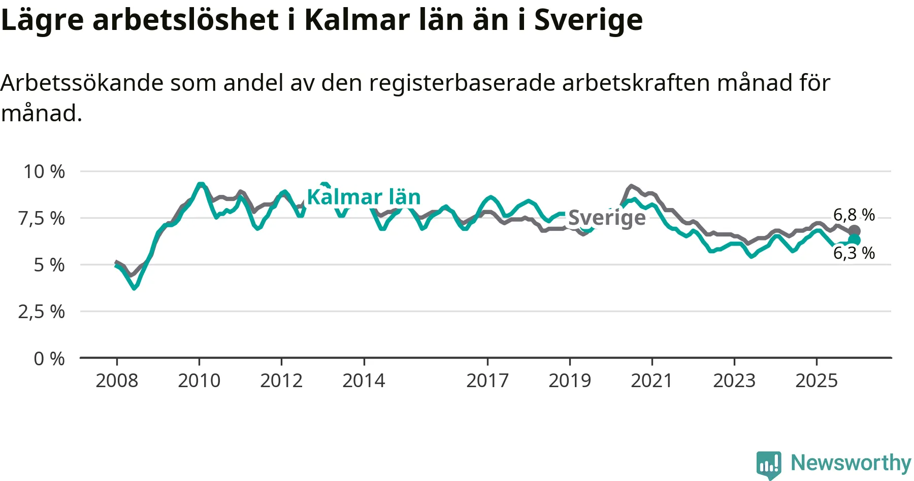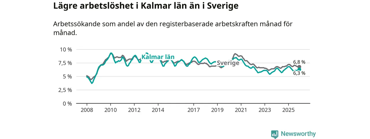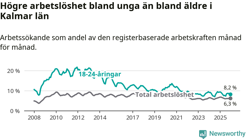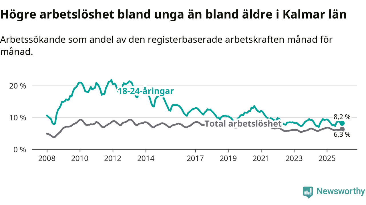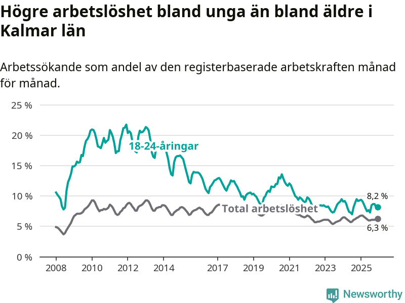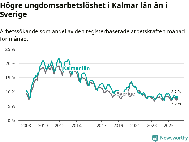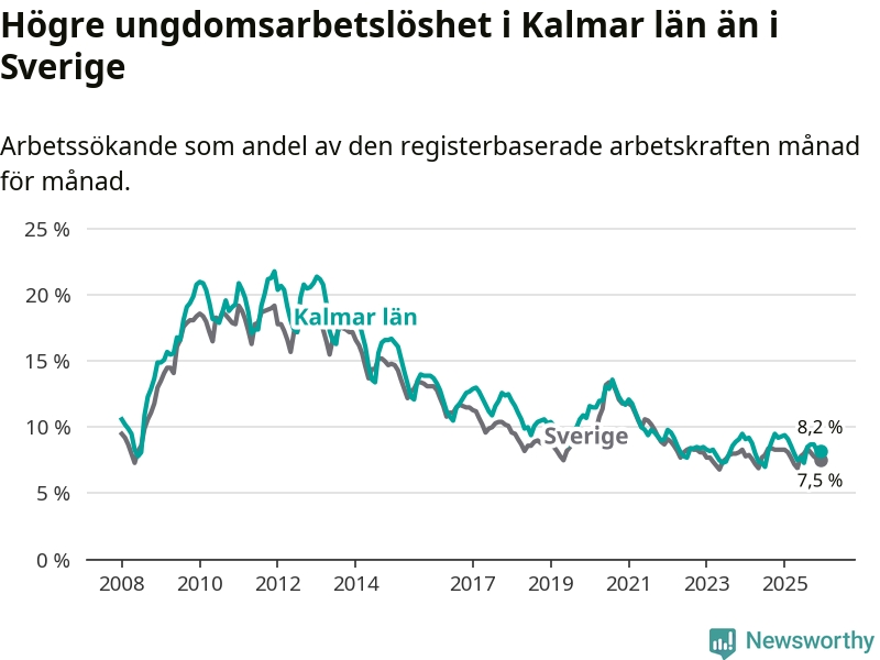 Medan Kalmar län har lägre total arbetslöshet än Sverige, ligger ungdomsarbetslösheten 0,7 procentenheter högre i Kalmar.