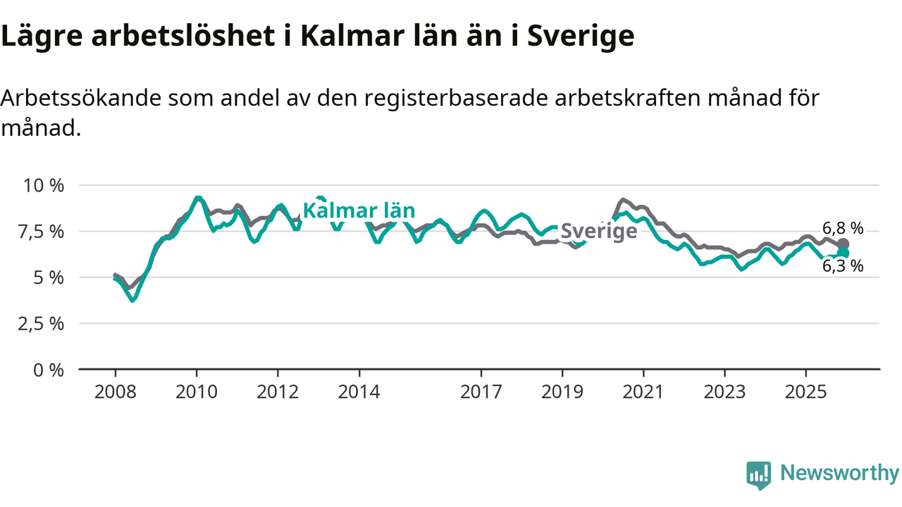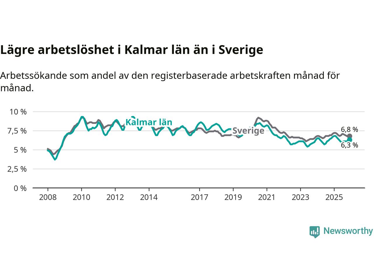 Kalmar län hade redan tidigare lägre arbetslöshet än snittet i hela Sverige och nu växer klyftan (6,3 procent i länet, jämfört med 6,8 procent i hela riket). Norrbotten har den lägsta arbetslösheten i riket (3,8 procent), medan Skåne har den högsta (8,9 procent). För att Kalmar län skulle komma ner i samma arbetslöshetsnivå som Norrbotten skulle 2 877 personer behöva sysselsättas.