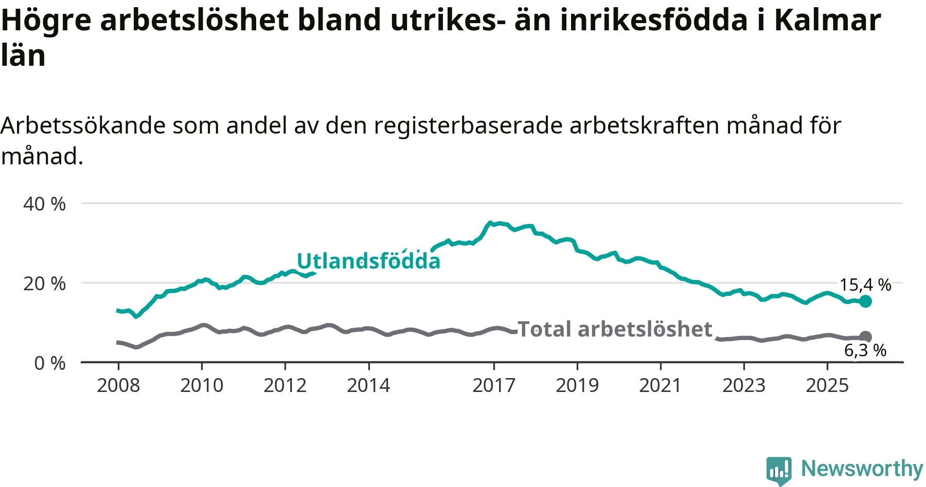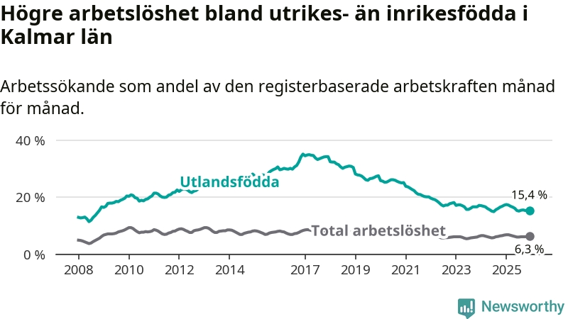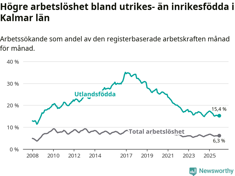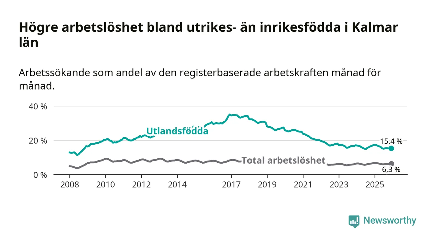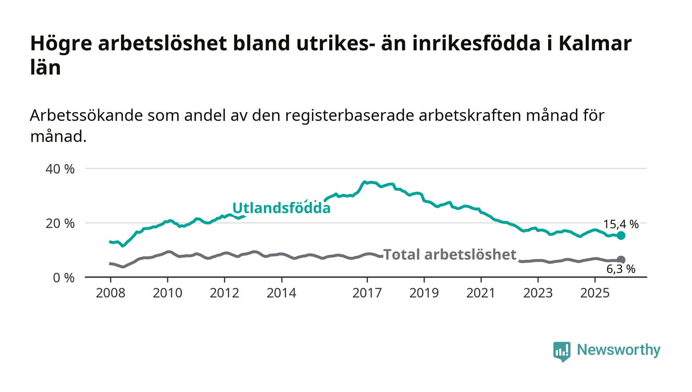 Arbetslösheten bland utlandsfödda var 15,4 procent i Kalmar under december månad, motsvarande 3 276 av 21 273 personer. Det är 1,8 procentenheter färre än vid samma tidpunkt i fjol (−343 om man räknar personer).