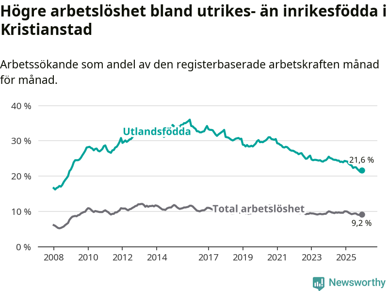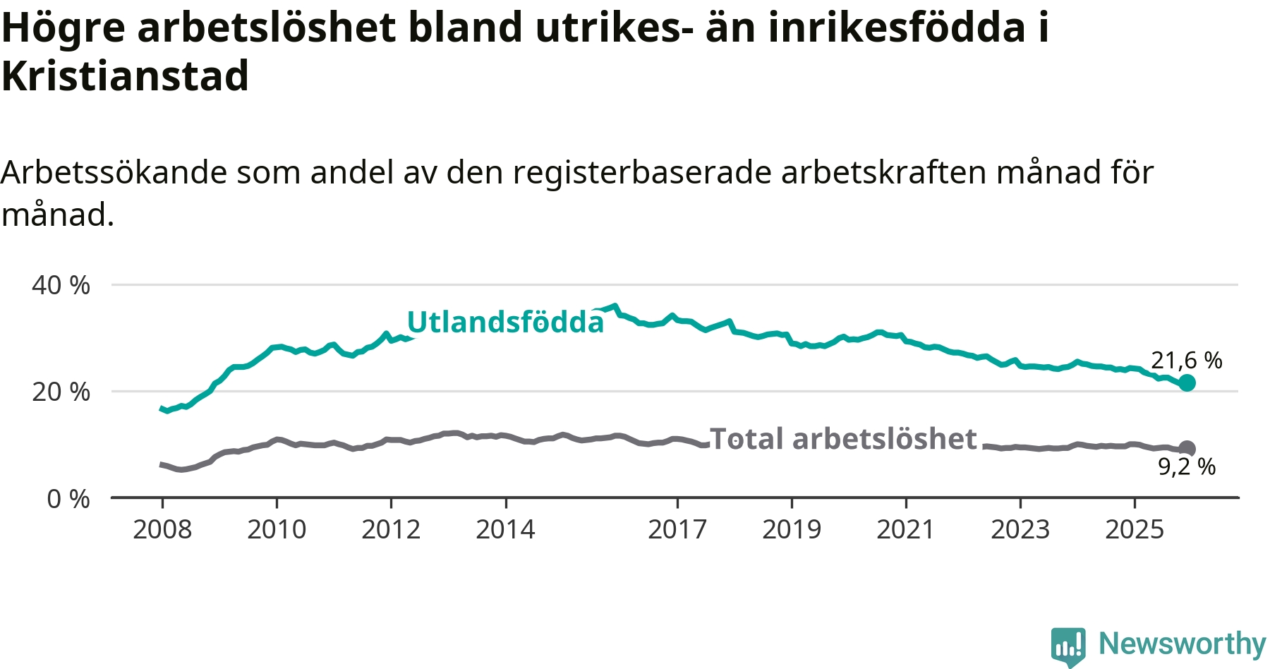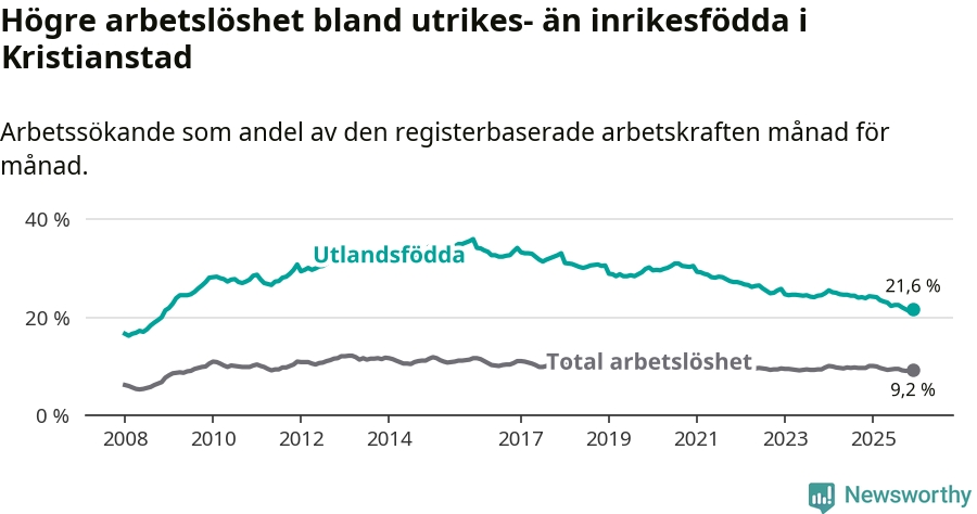 Arbetslösheten bland utlandsfödda var 21,6 procent i Kristianstad under december månad, motsvarande 2 249 av 10 412 personer. Det är 2,7 procentenheter färre än vid samma tidpunkt i fjol (−266 om man räknar personer). Därmed är de utlandsföddas arbetslöshet lägre än vid samma tidpunkt i fjol för 16:e månaden i följd. Sedan augusti 2024 har arbetslösheten bland utlandsfödda minskat från 24,4 till 21,6 procent.