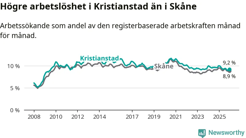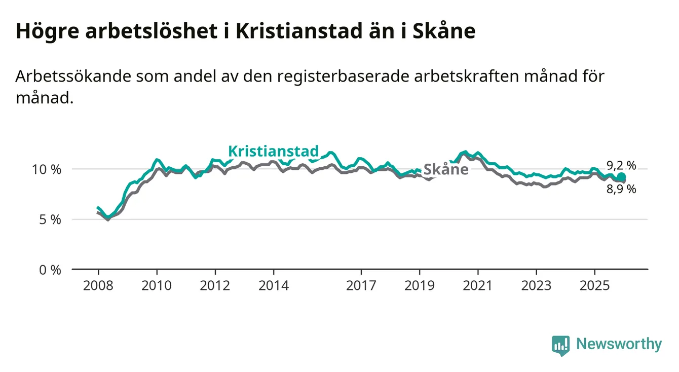 Även om arbetslösheten i Kristianstad alltså minskar, så ligger den fortfarande över snittet i hela Skåne län (9,2 procent i kommunen, jämfört med 8,9 procent i hela länet). Lomma har den lägsta arbetslösheten i länet (4,0 procent), medan Perstorp har den högsta (13,3 procent). För att Kristianstad skulle komma ner i samma arbetslöshetsnivå som Lomma skulle 2 168 personer behöva sysselsättas.