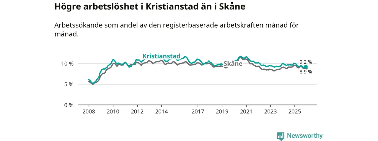 Under december månad rapporterade Kristianstads kommun en total arbetslöshet på 9,2 procent. Det är en minskning jämfört med samma tidpunkt i fjol (−0,8 procentenheter). Även i Skåne län sjunker arbetslösheten .
