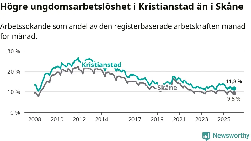 Precis som den totala arbetslösheten ligger ungdomsarbetslösheten i Kristianstad högre än i Skåne som helhet. Skillnaden mellan kommunen och länet är 2,3 procentenheter.