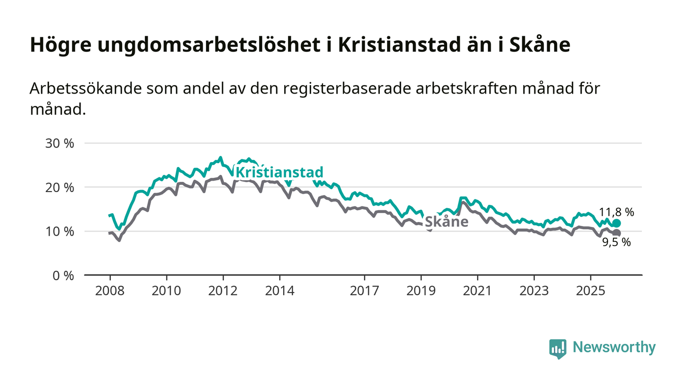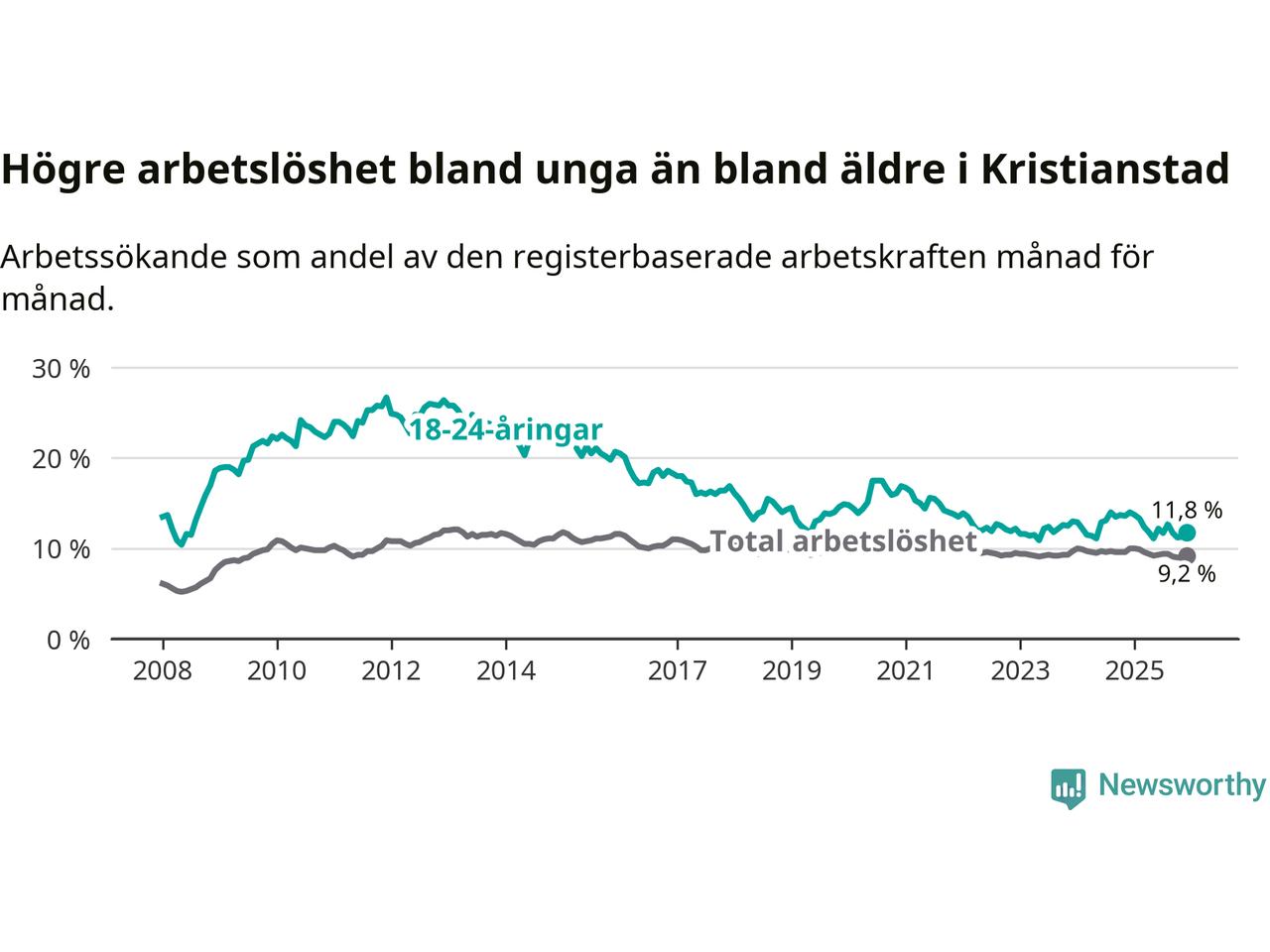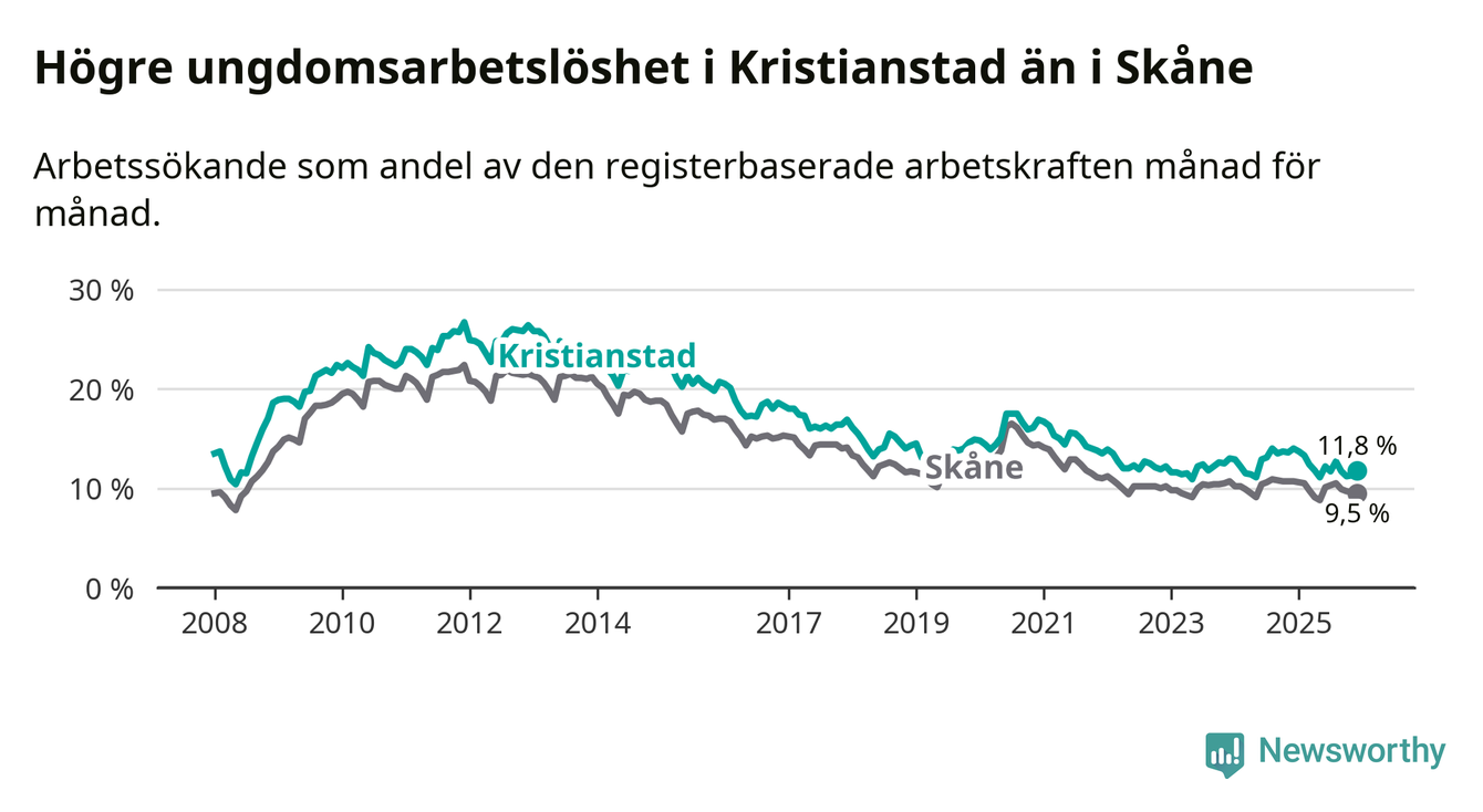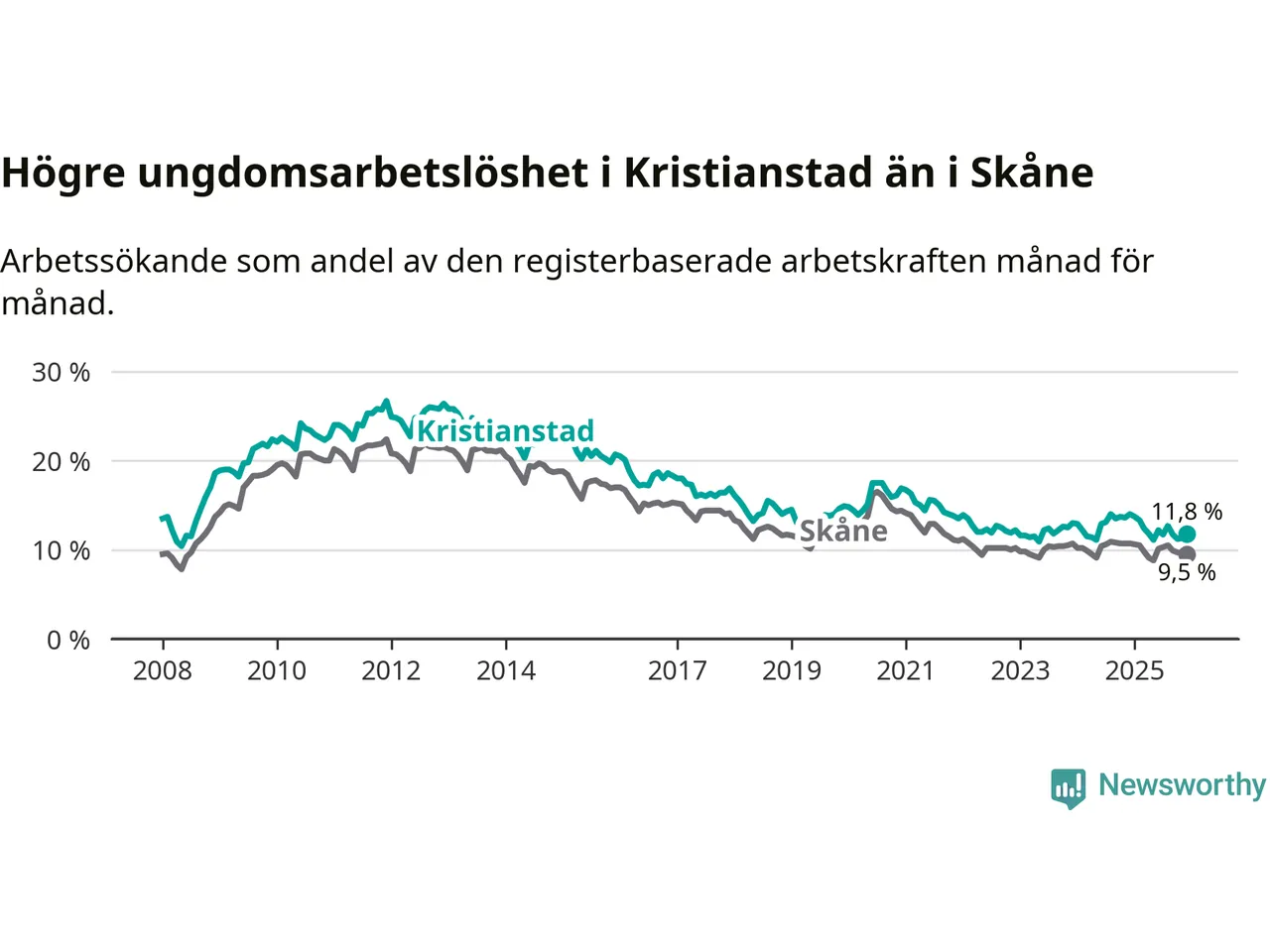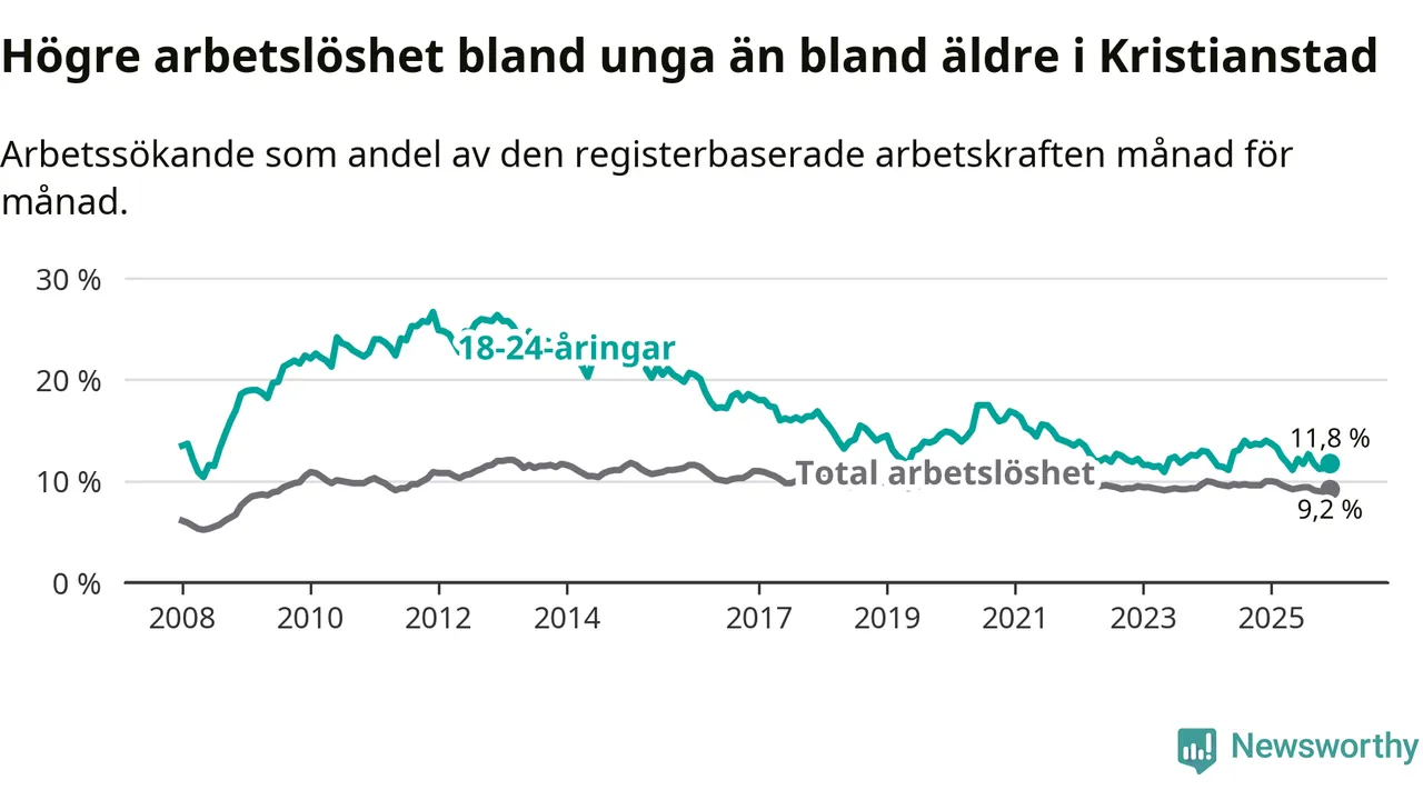 I och med den senaste månadens nedgång har de ungas arbetslöshet i Kristianstad sjunkit sju månader i följd (ner från 11,1 procent i maj 2025 till 11,8 procent nu).
