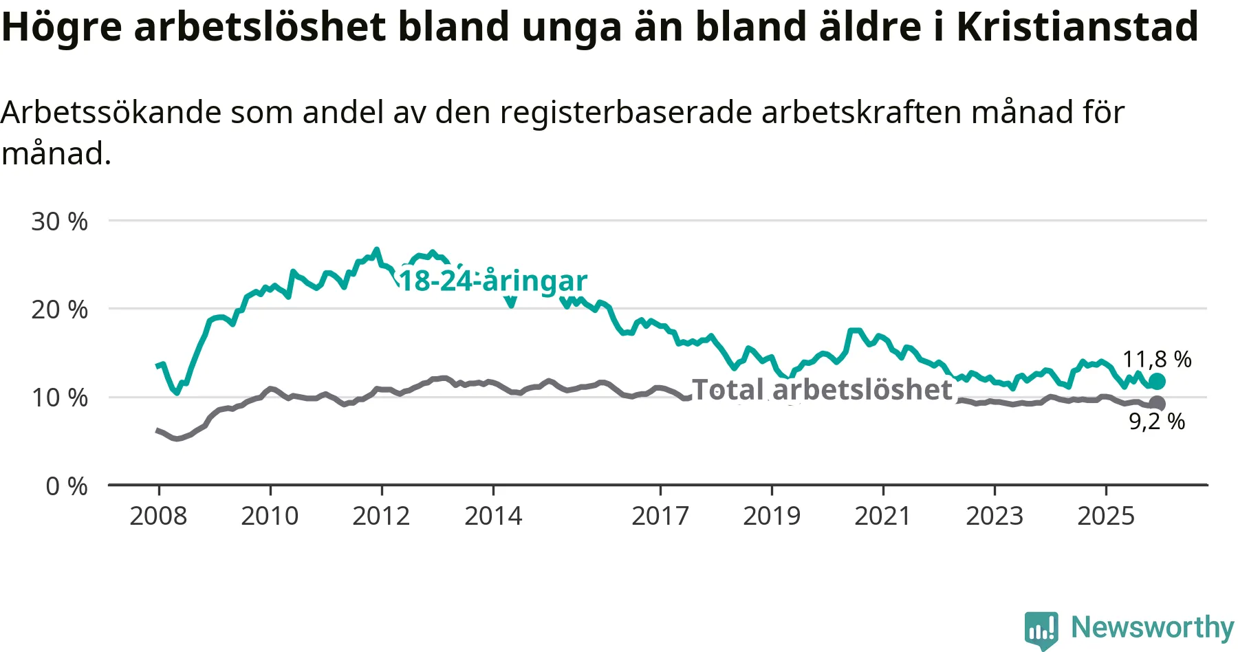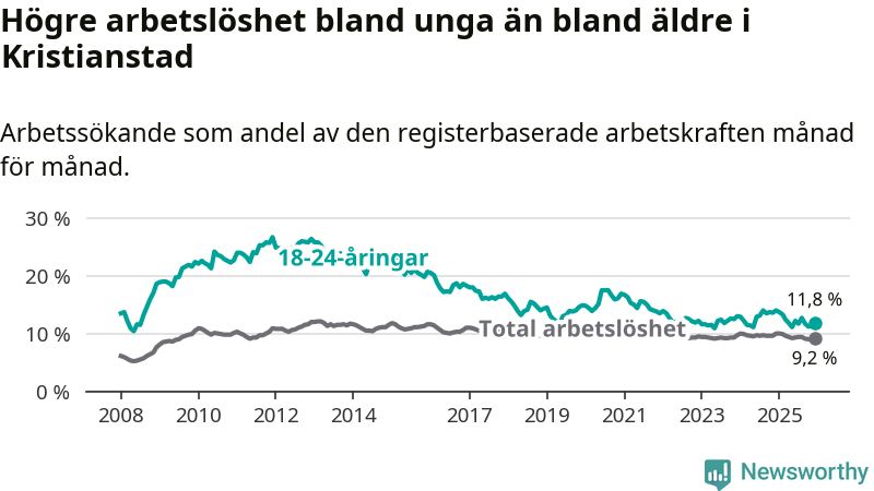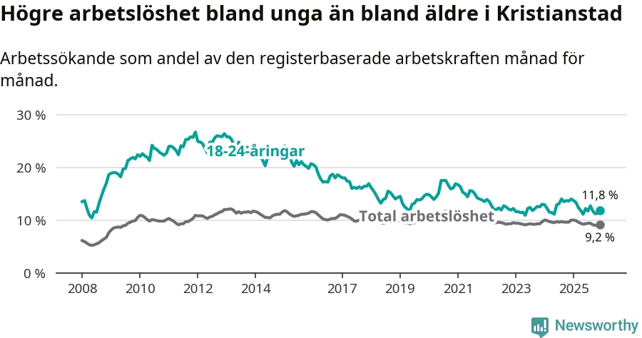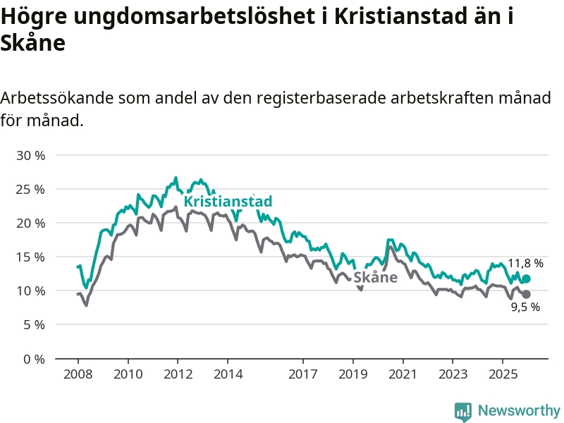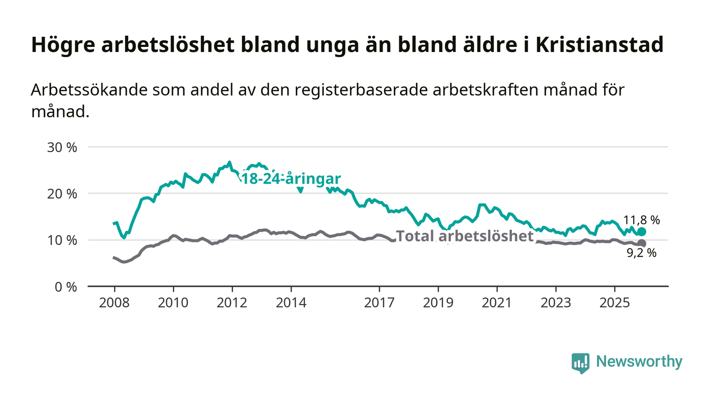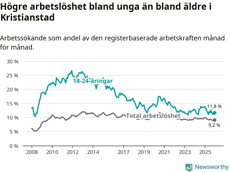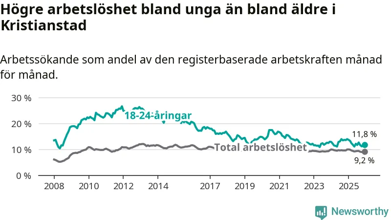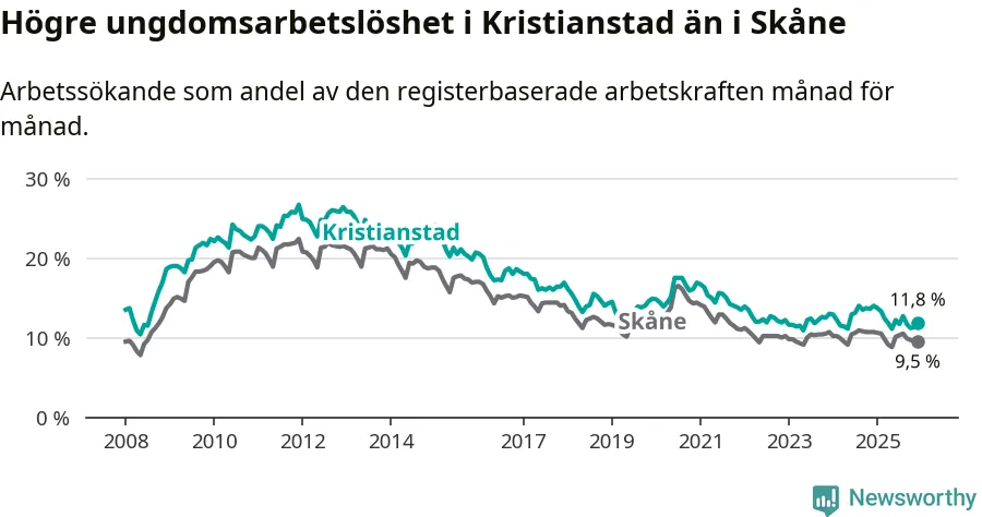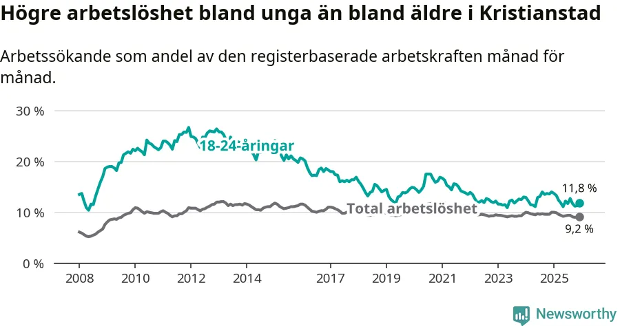 I och med den senaste månadens nedgång har de ungas arbetslöshet i Kristianstad sjunkit sju månader i följd (ner från 11,1 procent i maj 2025 till 11,8 procent nu).