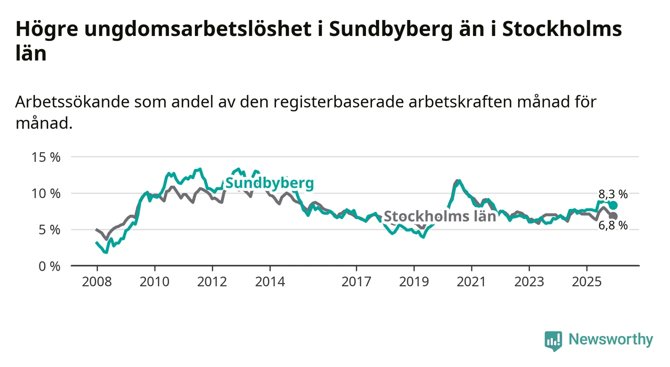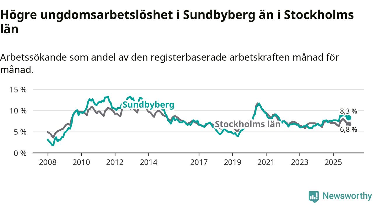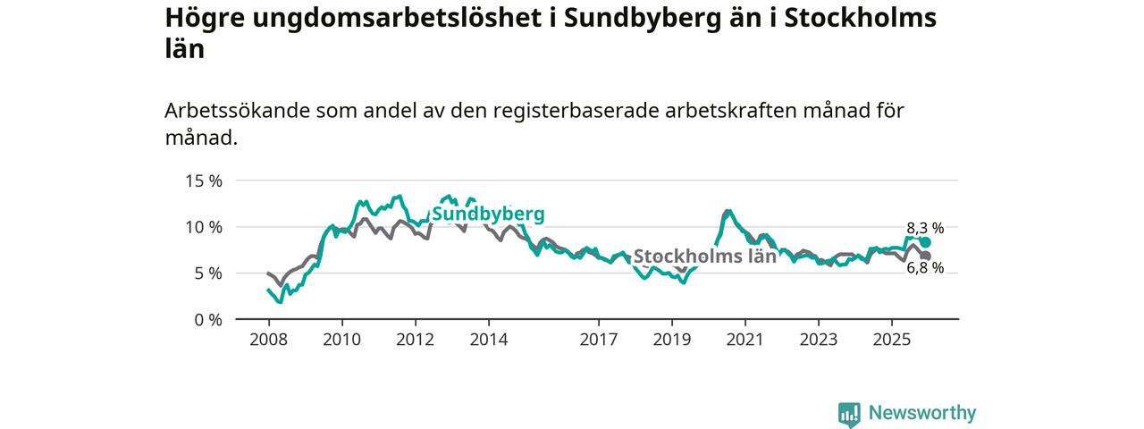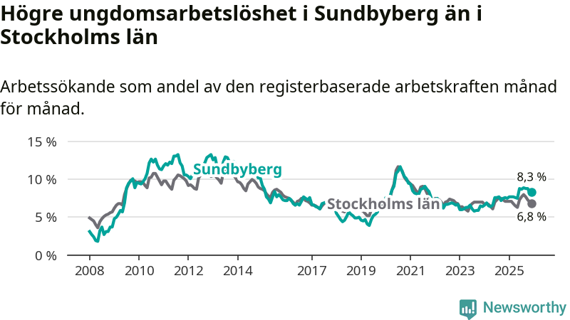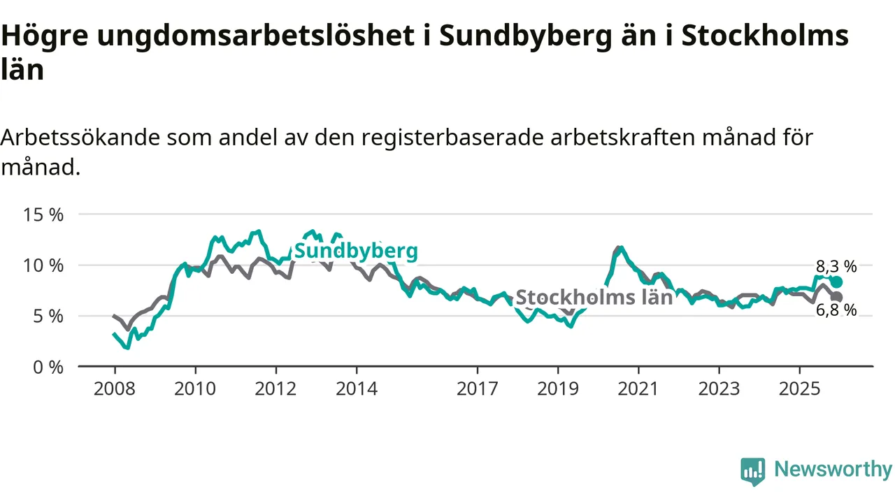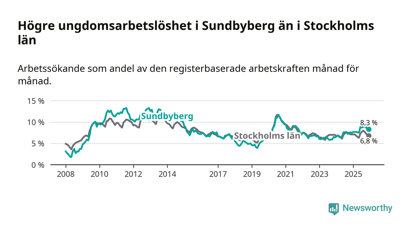 Medan Sundbyberg har ungefär samma total arbetslöshet som Stockholms län, ligger ungdomsarbetslösheten 1,5 procentenheter högre i Sundbyberg.