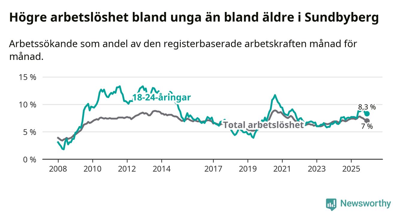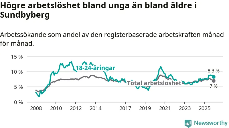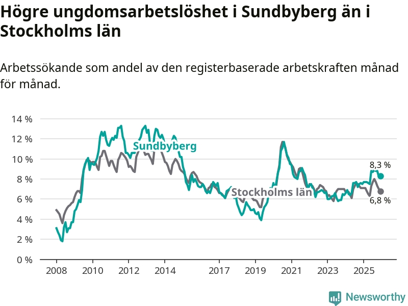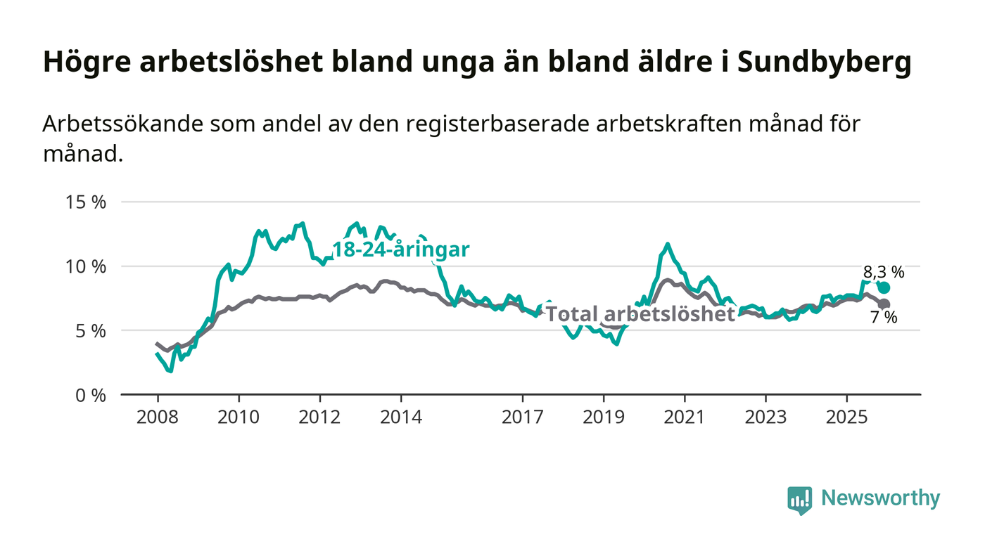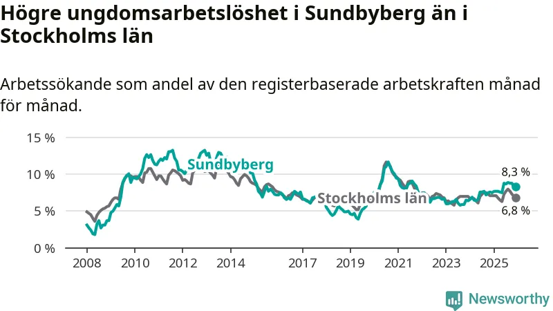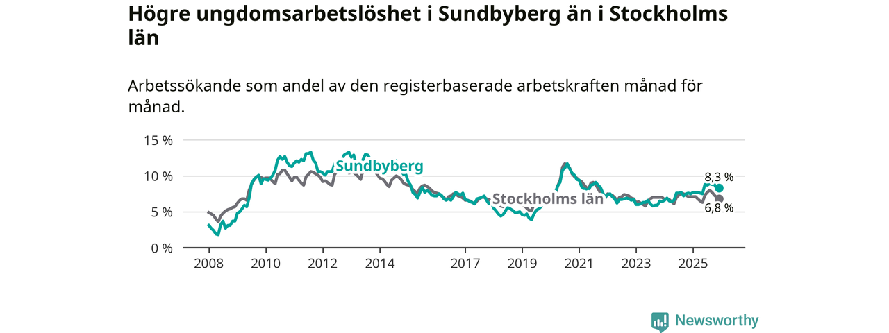Medan Sundbyberg har ungefär samma total arbetslöshet som Stockholms län, ligger ungdomsarbetslösheten 1,5 procentenheter högre i Sundbyberg.