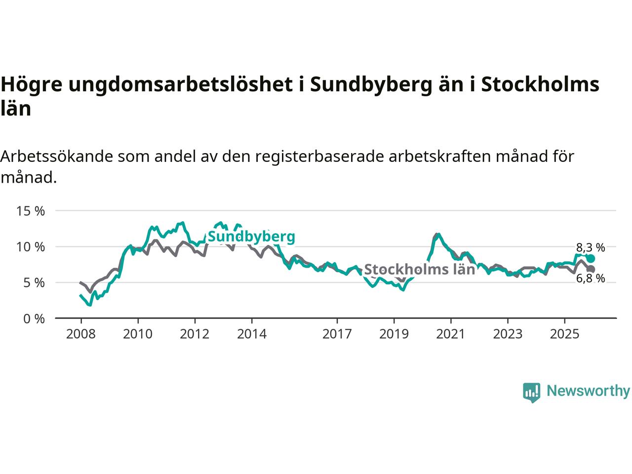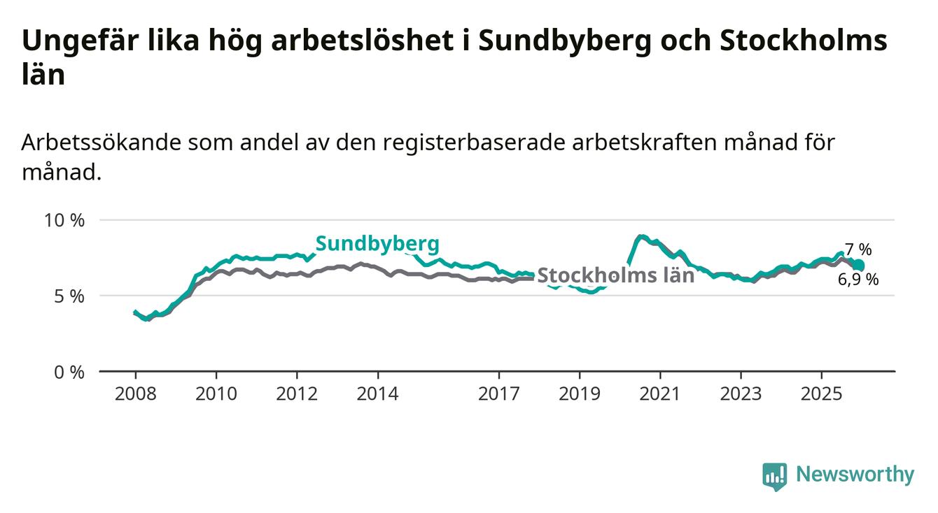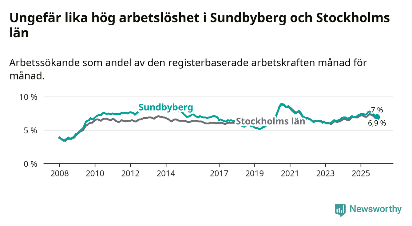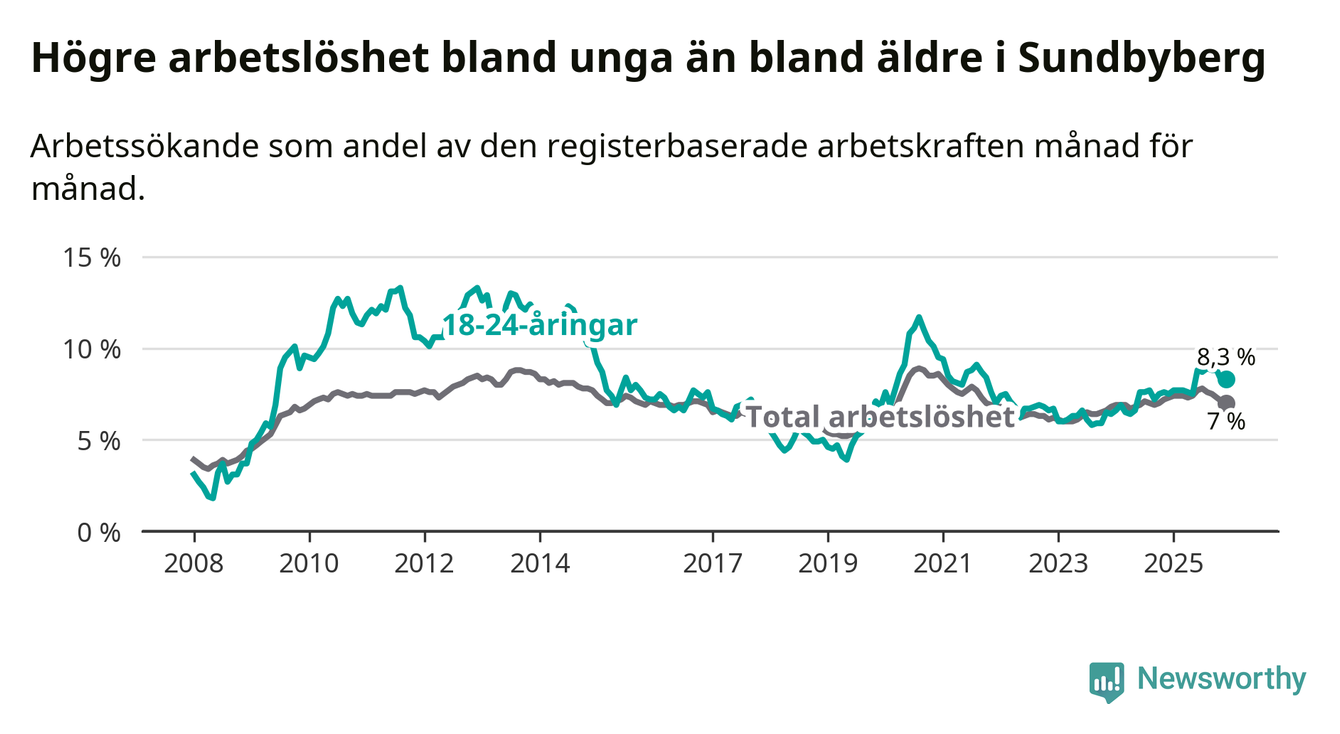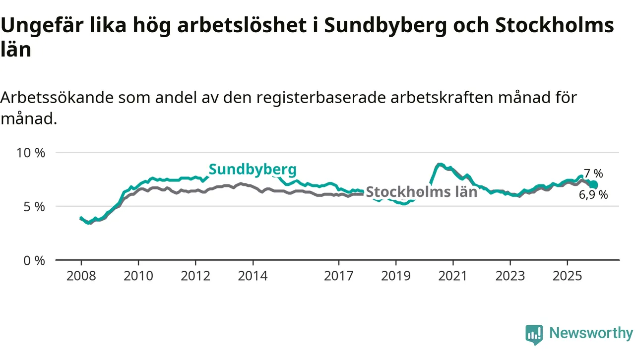Medan Sundbyberg har ungefär samma total arbetslöshet som Stockholms län, ligger ungdomsarbetslösheten 1,5 procentenheter högre i Sundbyberg.