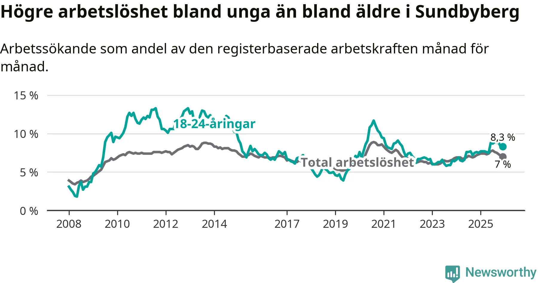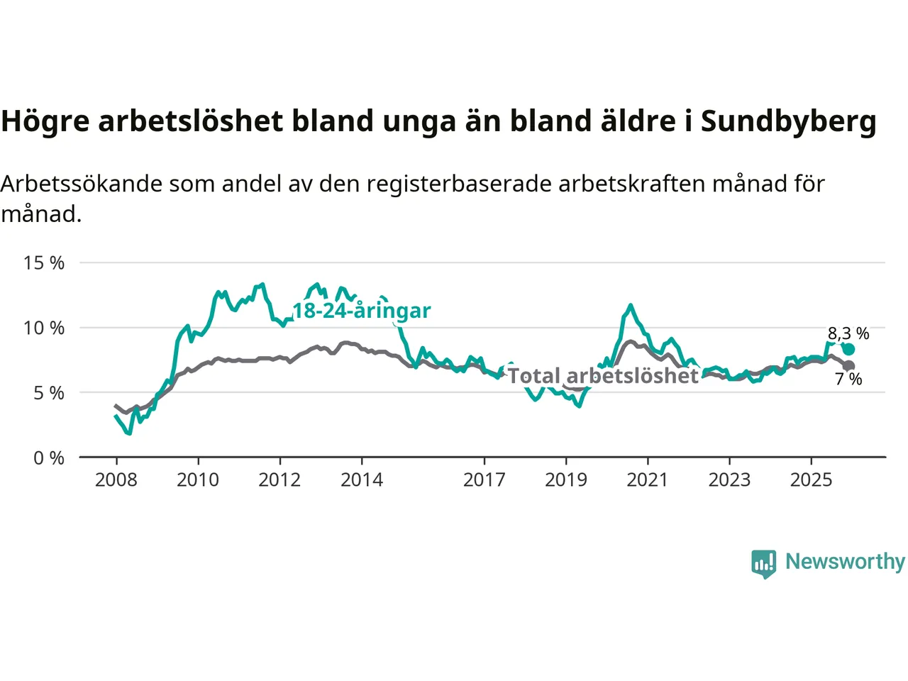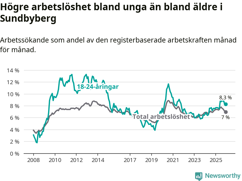 I och med den senaste månadens uppgång har de ungas arbetslöshet i Sundbyberg stigit över två år i sträck (upp från 6,4 procent i december 2023 till 8,3 procent nu).