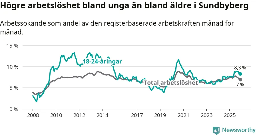 Den senaste månadsstatistiken från Arbetsförmedlingen visar på en uppgång i ungdomsarbetslöshet i Sundbybergs kommun med 0,8 procentenheter. Arbetslösheten bland personer i åldern 18–24 år låg i december på 8,3 procent.