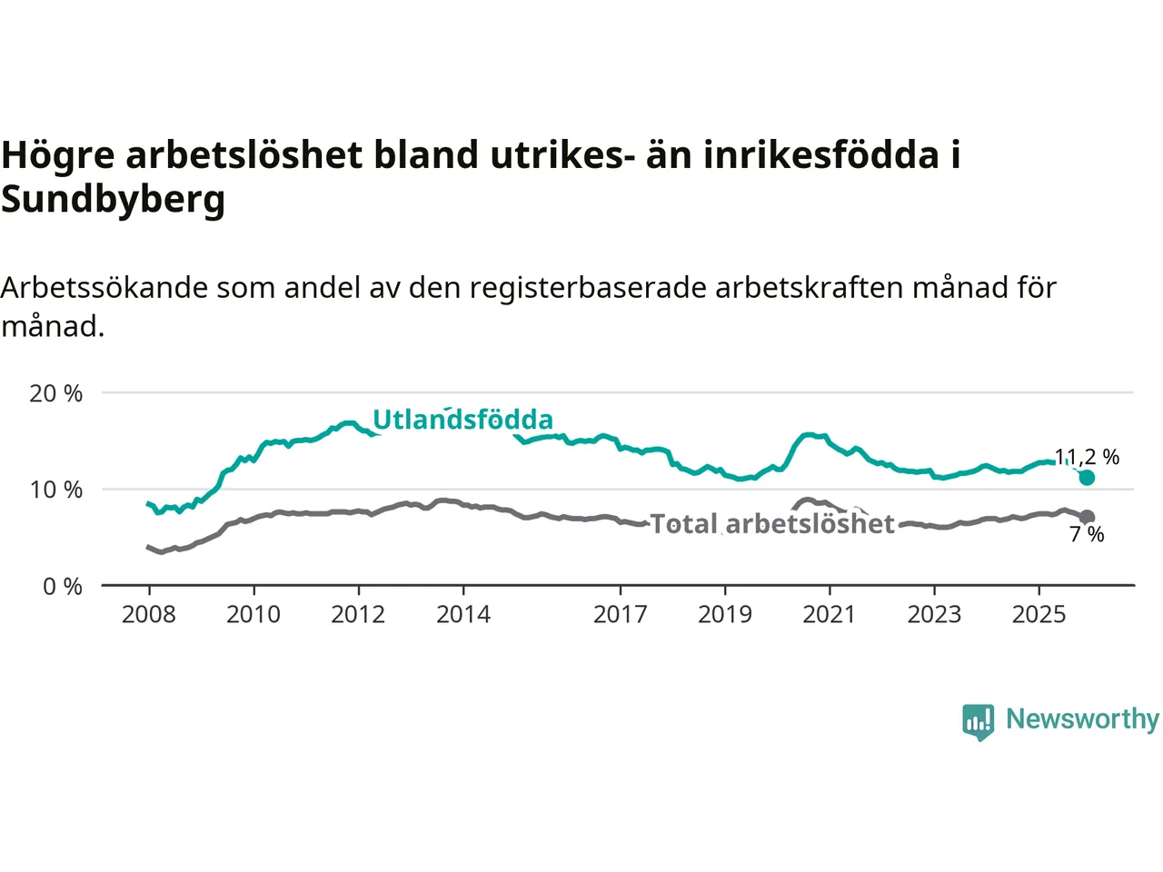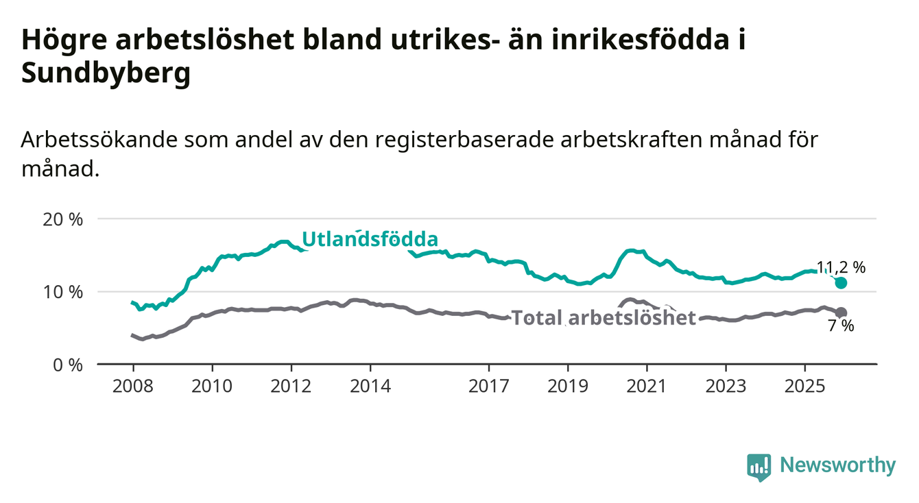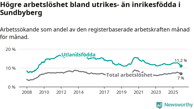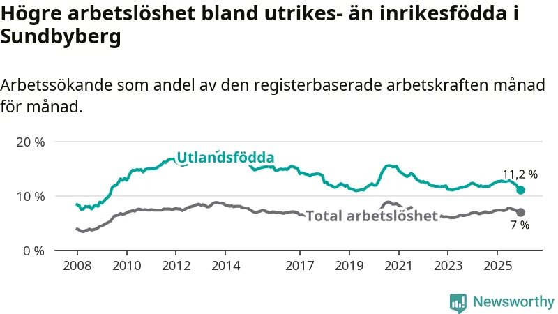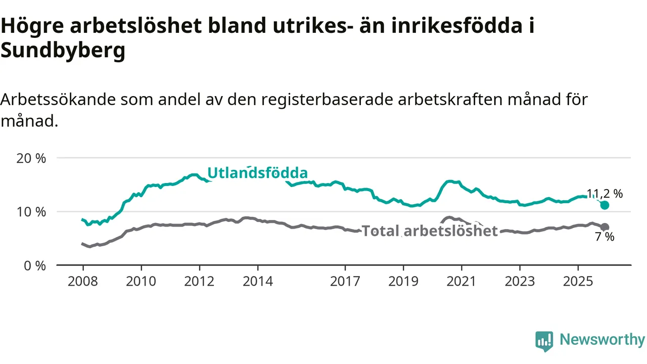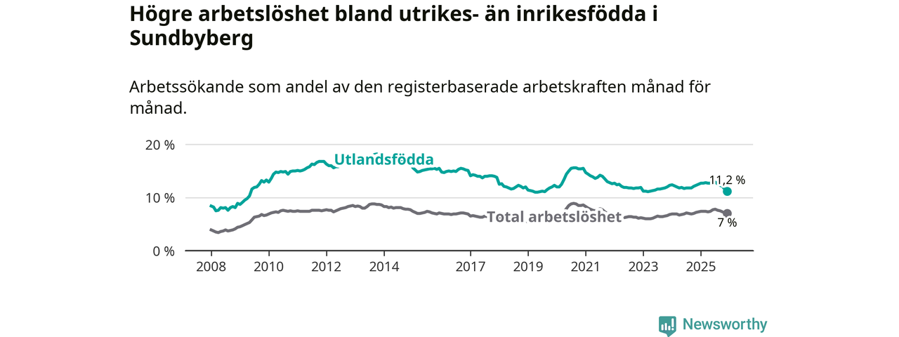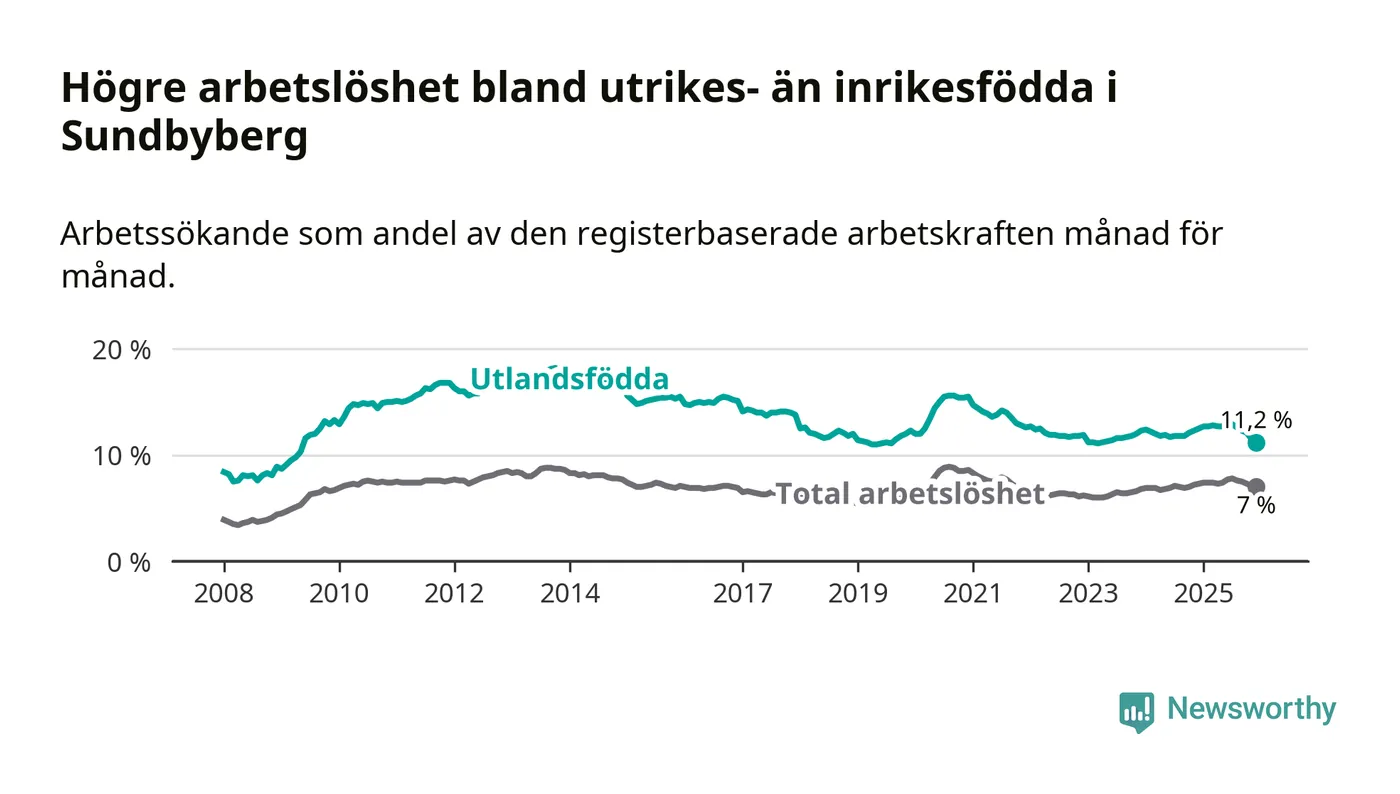 Skillnaden i arbetslöshet mellan utrikesfödda och hela befolkningen är 4,2 procentenheter i Sundbyberg. Det är en mindre skillnad än för ett år sedan (−1,0 procentenheter).
