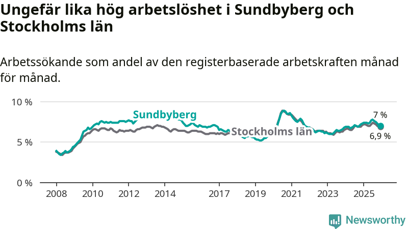Under december månad rapporterade Sundbybergs kommun en total arbetslöshet på 7,0 procent. Det är en minskning jämfört med samma tidpunkt i fjol (−0,3 procentenheter). Även i Stockholms län sjunker arbetslösheten något.