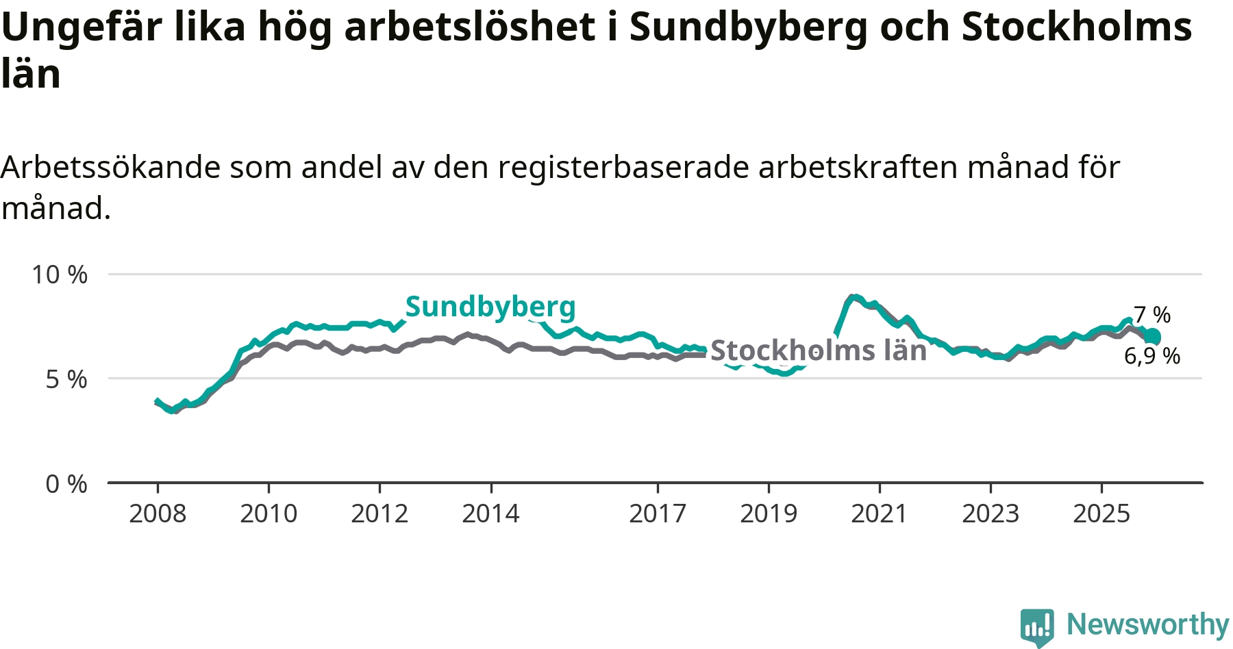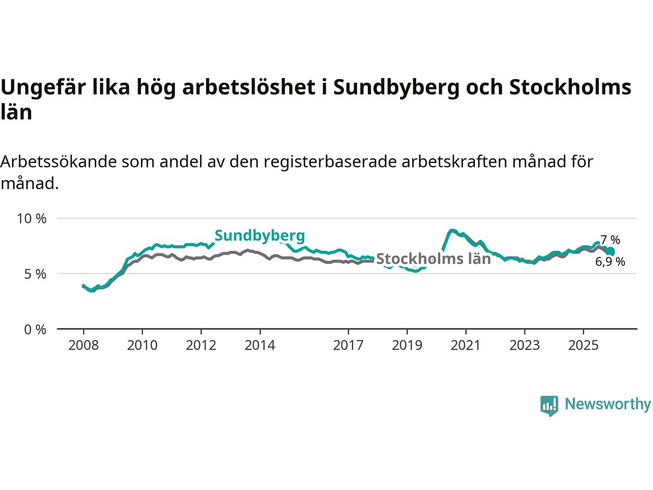 Den minskande arbetslösheten gör att Sundbyberg nu har i stort sett samma arbetslöshetsnivå som hela Stockholms län. Ekerö har den lägsta arbetslösheten i länet (3,8 procent), medan Södertälje har den högsta (11,0 procent). För att Sundbyberg skulle komma ner i samma arbetslöshetsnivå som Ekerö skulle 1 046 personer behöva sysselsättas.