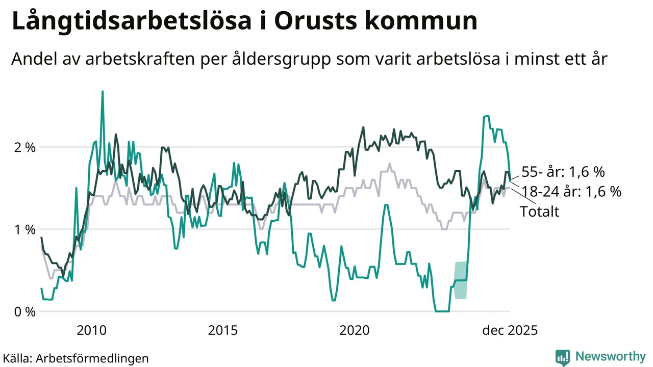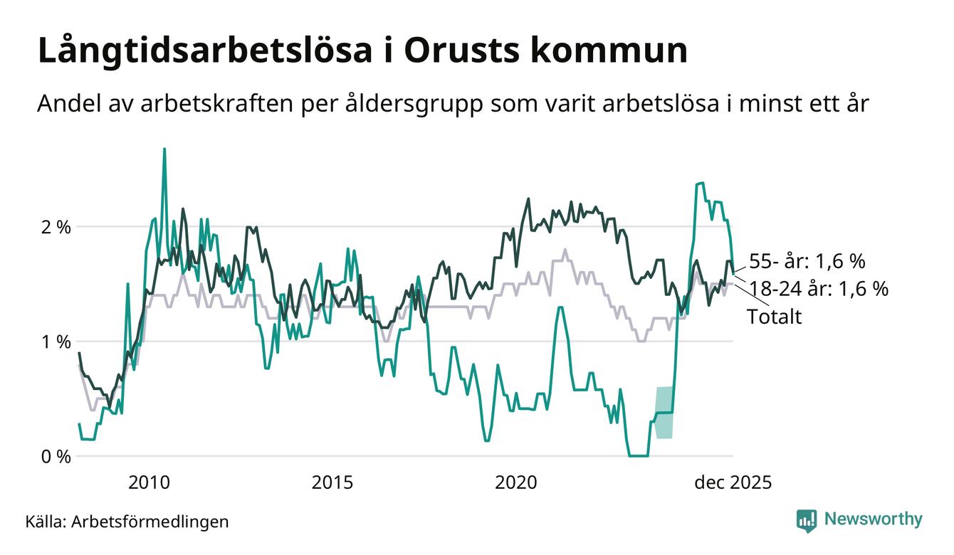 Av de 99 personerna som varit arbetslösa i mer än ett år i Orusts kommun är 31 personer mellan 55 och 651 år och tio är mellan 18 och 24 år.