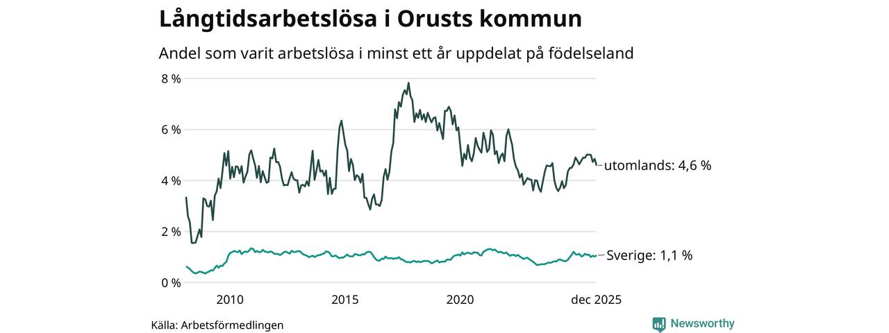 64 av de långtidsarbetslösa på Orust är födda i Sverige, medan 35 är födda utomlands. Det innebär att långtidsarbetslösheten bland Sverigefödda är 1,1 procent, medan den är fyra gånger så hög – 4,6 procent – bland födda utomlands. Även i riket som helhet är arbetslösheten högre bland utrikesfödda.