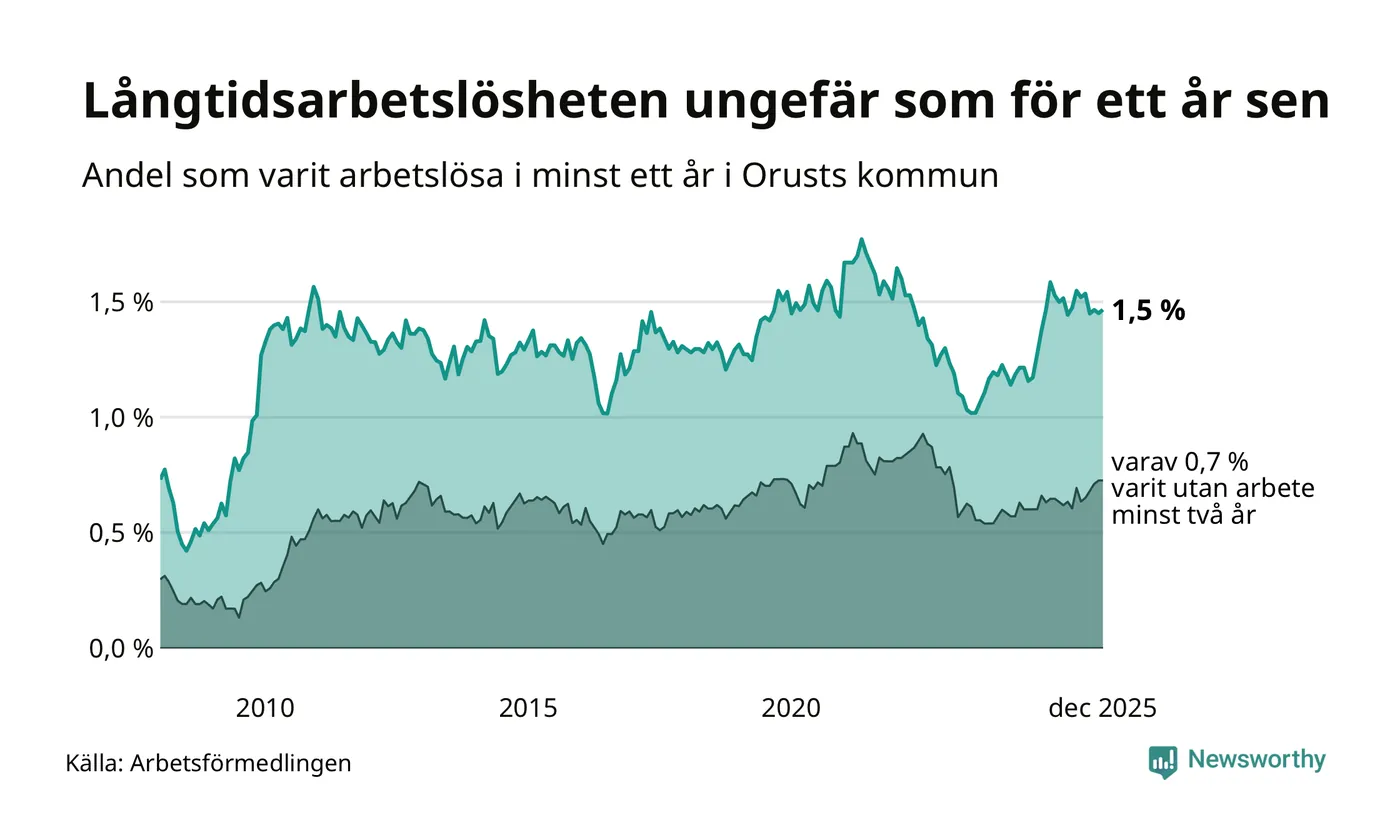 I december hade 99 Orustbor varit arbetslösa i minst ett år, vilket är en fler än månaden innan. 99 personer motsvarar 1,5 procent av arbetskraften i kommunen – andelen långtidsarbetslösa är ungefär på samma nivå som för ett år sedan.
