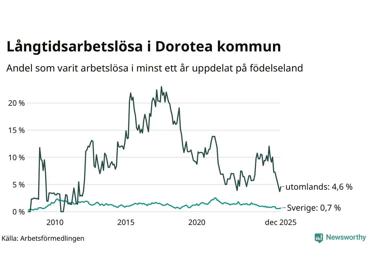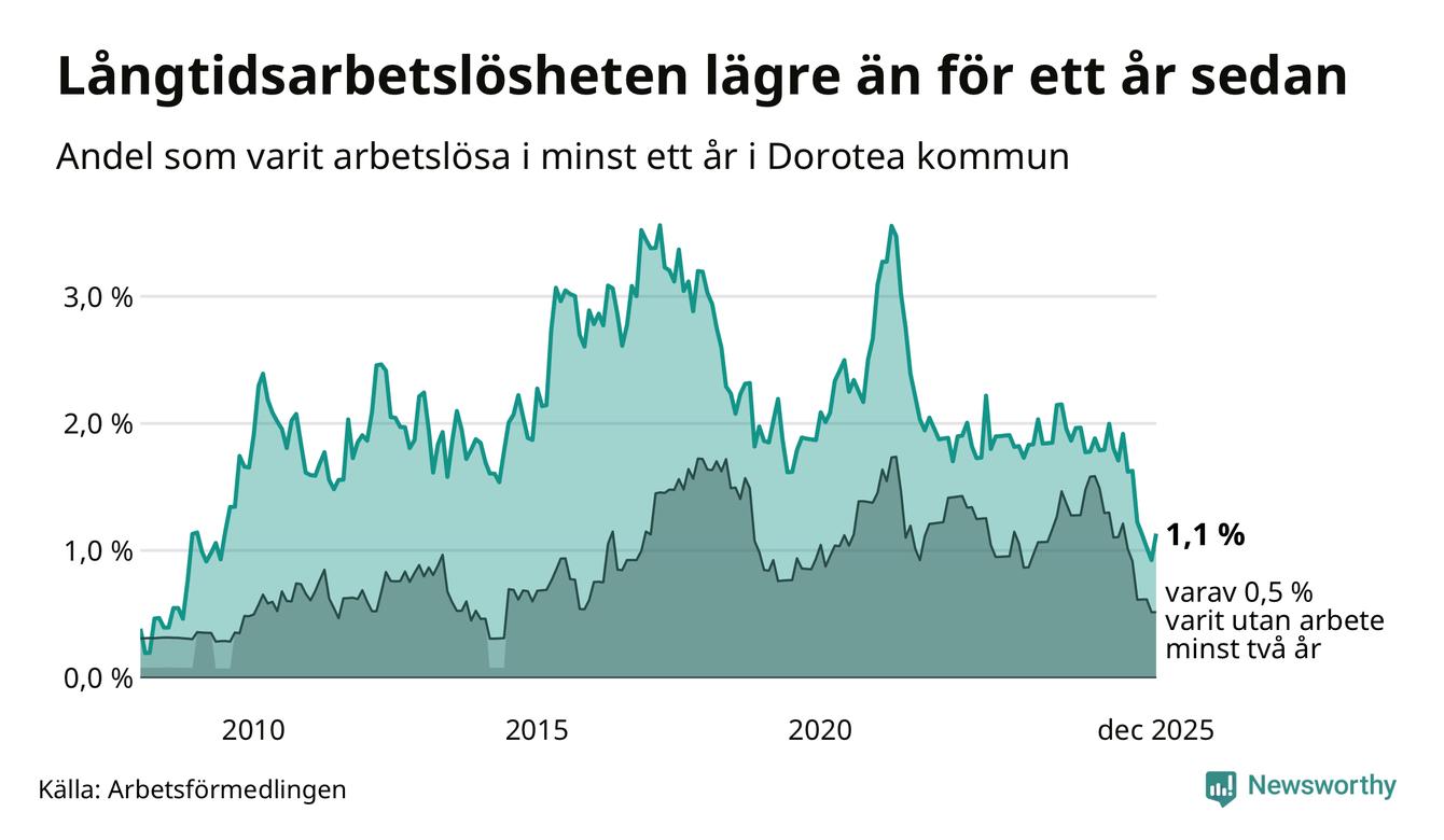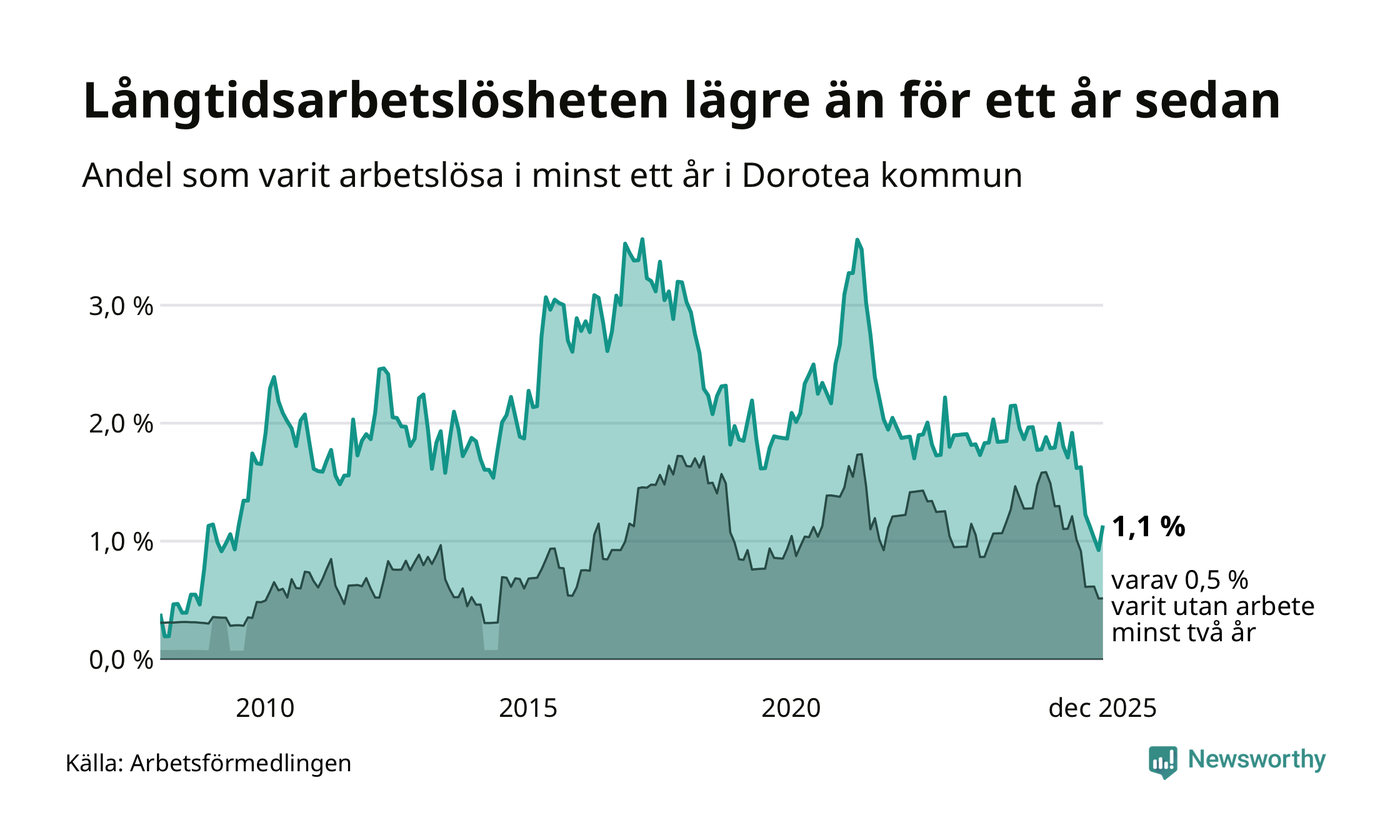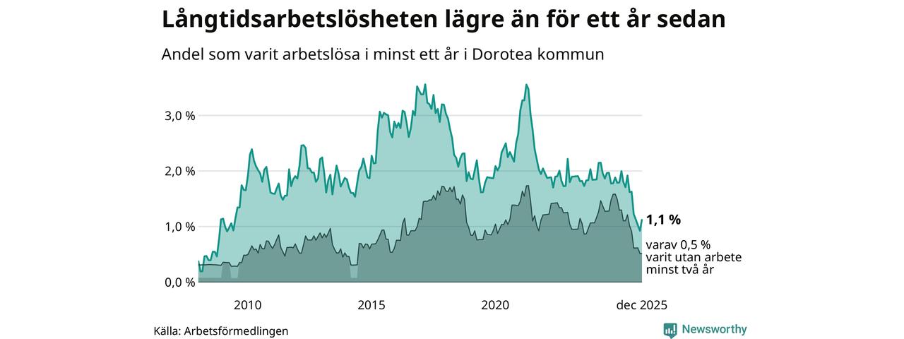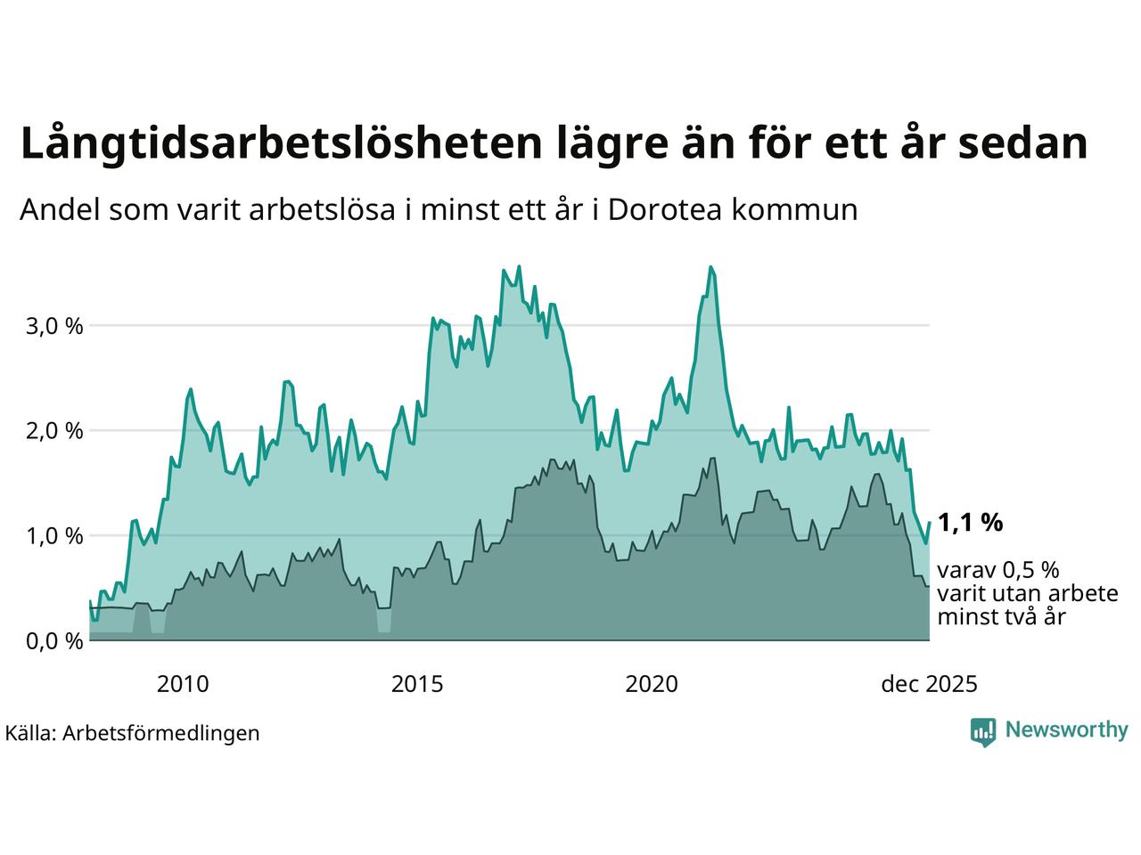 I december hade elva Doroteabor varit arbetslösa i minst ett år, vilket är två fler än månaden innan. Det är den första månaden sedan maj 2025 som antalet arbetslösa ökar. Elva personer motsvarar 1,1 procent av arbetskraften i kommunen – andelen långtidsarbetslösa är 0,7 procentenheter lägre än samma månad för ett år sedan. Dorotea tillhör de kommuner som har lägst andel långtidsarbetslösa i hela landet just nu.