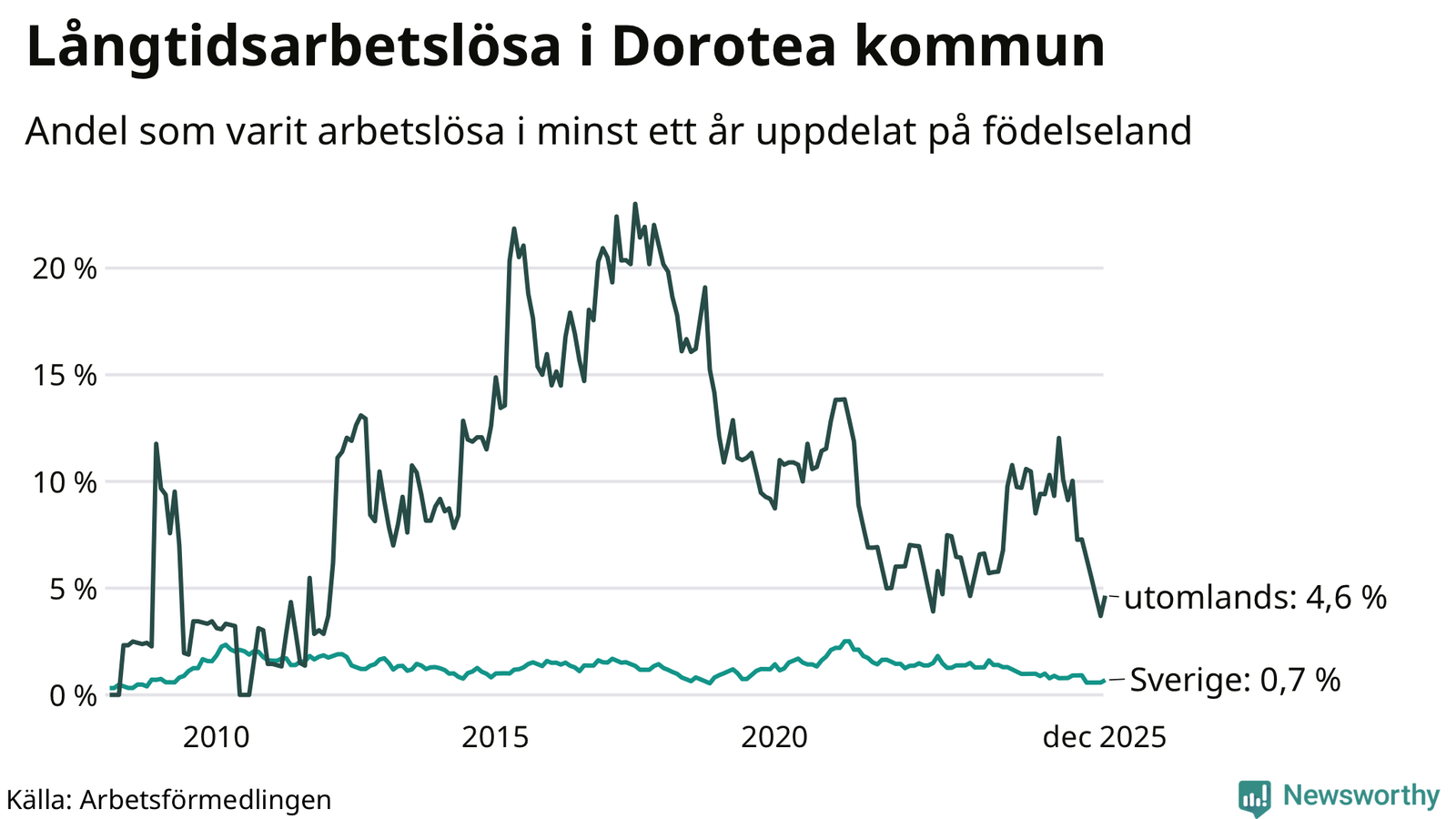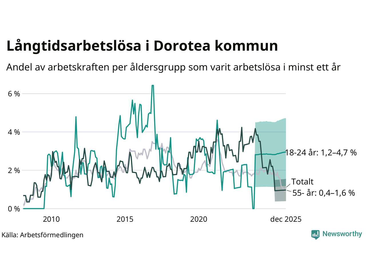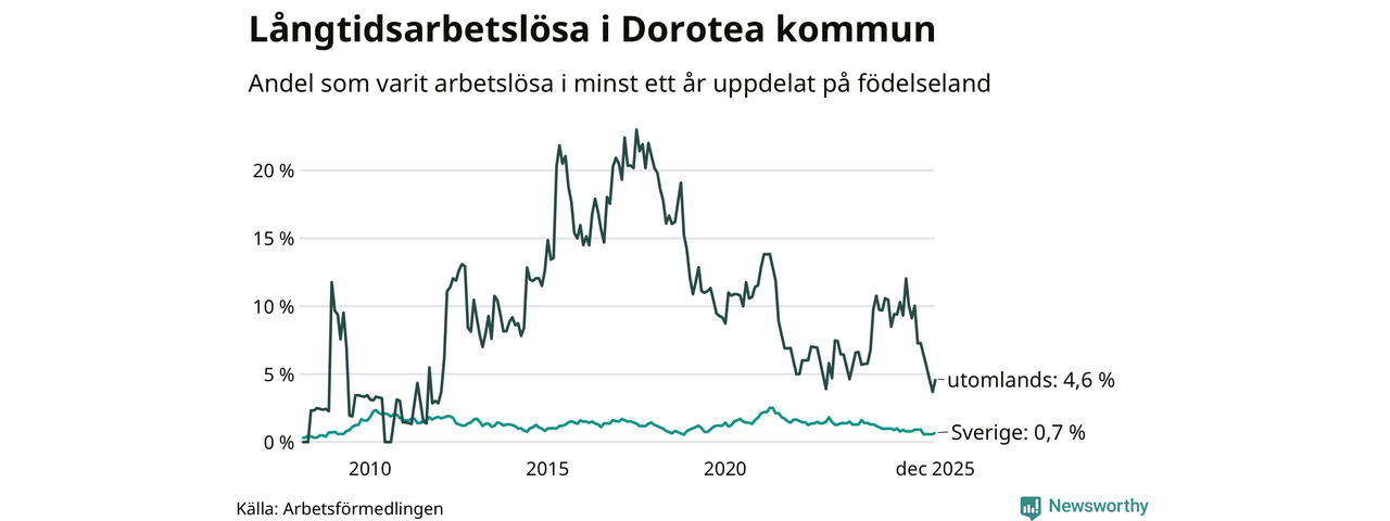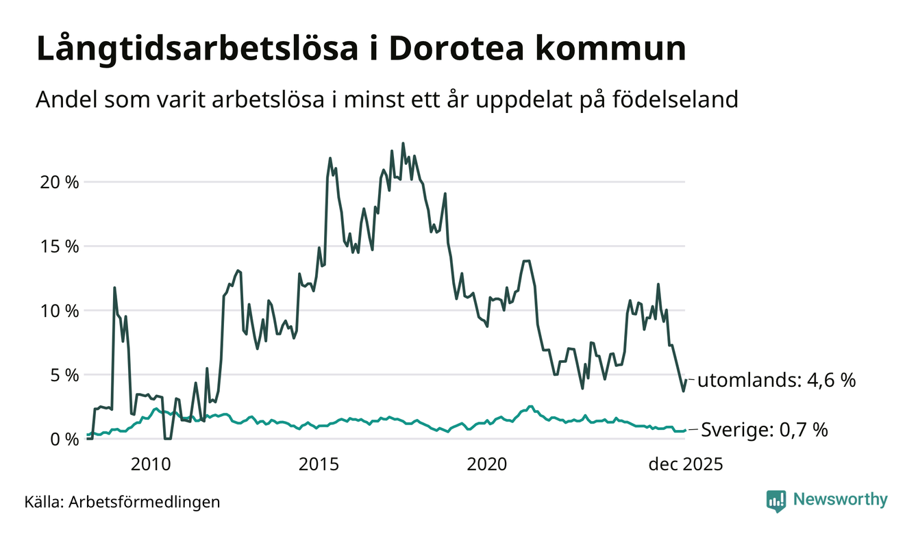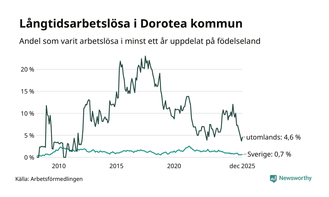 I december hade elva Doroteabor varit arbetslösa i minst ett år, vilket är två fler än månaden innan. Det är den första månaden sedan maj 2025 som antalet arbetslösa ökar. Elva personer motsvarar 1,1 procent av arbetskraften i kommunen – andelen långtidsarbetslösa är 0,7 procentenheter lägre än samma månad för ett år sedan. Dorotea tillhör de kommuner som har lägst andel långtidsarbetslösa i hela landet just nu.