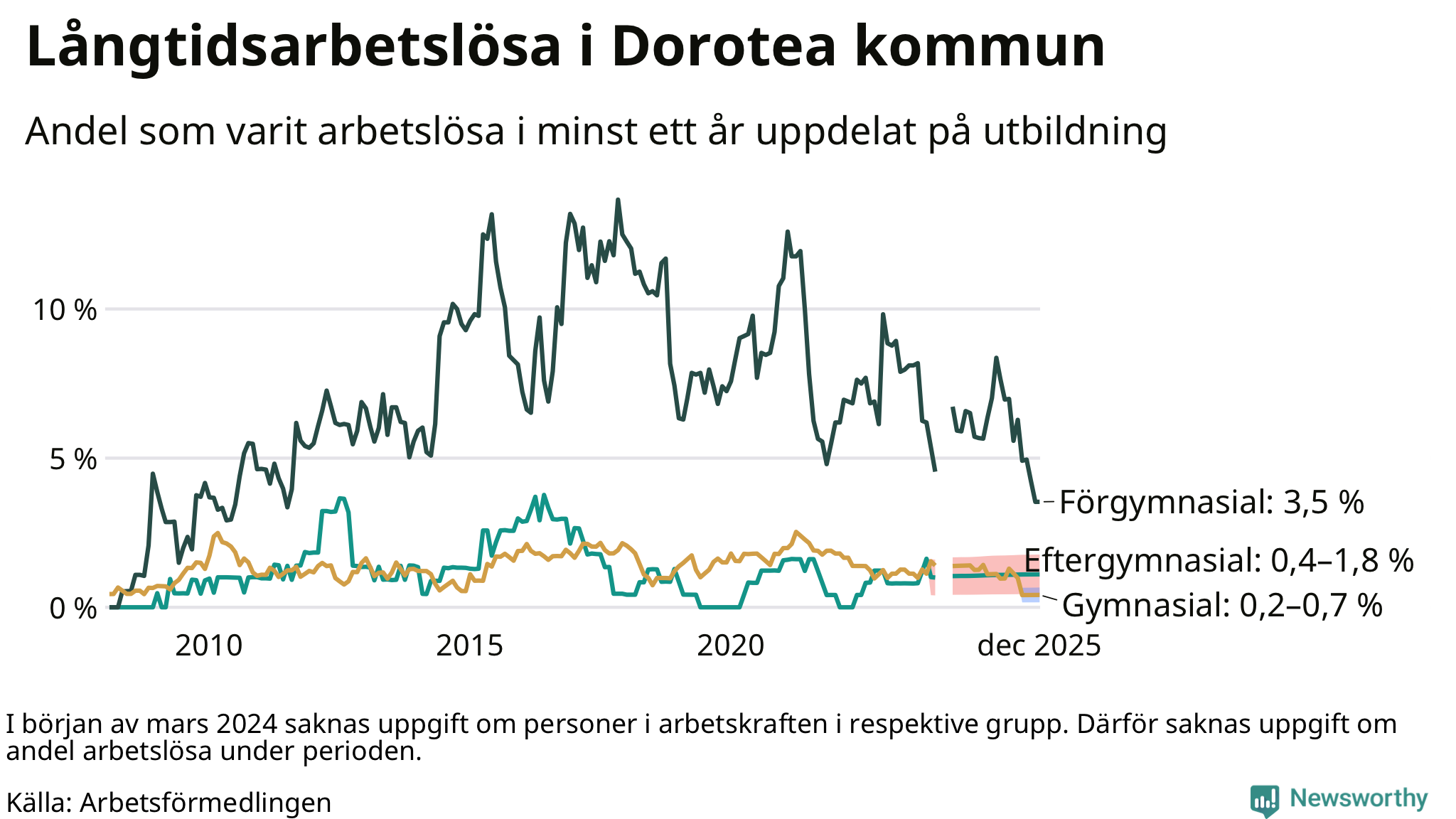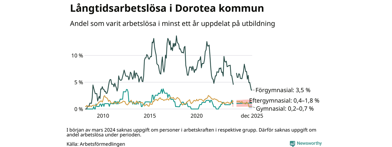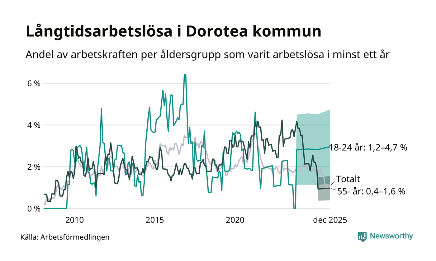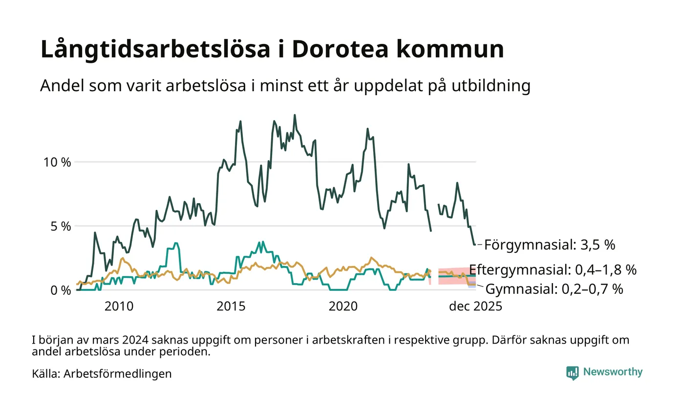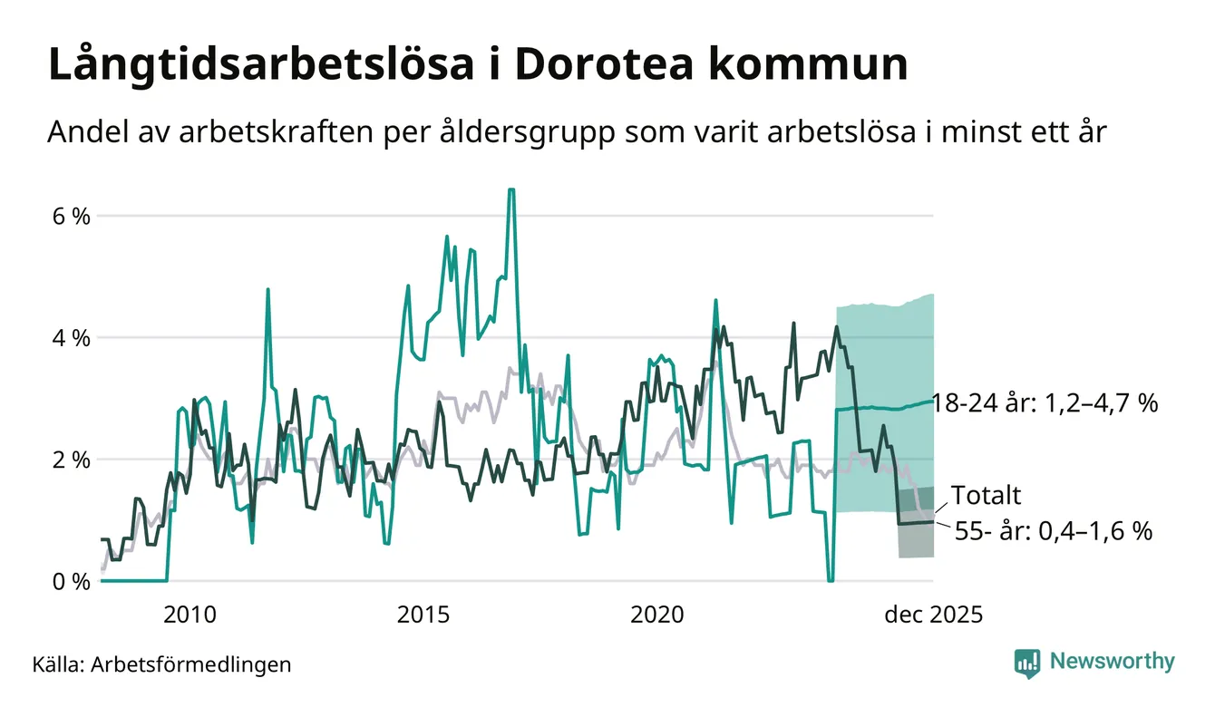 I december hade elva Doroteabor varit arbetslösa i minst ett år, vilket är två fler än månaden innan. Det är den första månaden sedan maj 2025 som antalet arbetslösa ökar. Elva personer motsvarar 1,1 procent av arbetskraften i kommunen – andelen långtidsarbetslösa är 0,7 procentenheter lägre än samma månad för ett år sedan. Dorotea tillhör de kommuner som har lägst andel långtidsarbetslösa i hela landet just nu.