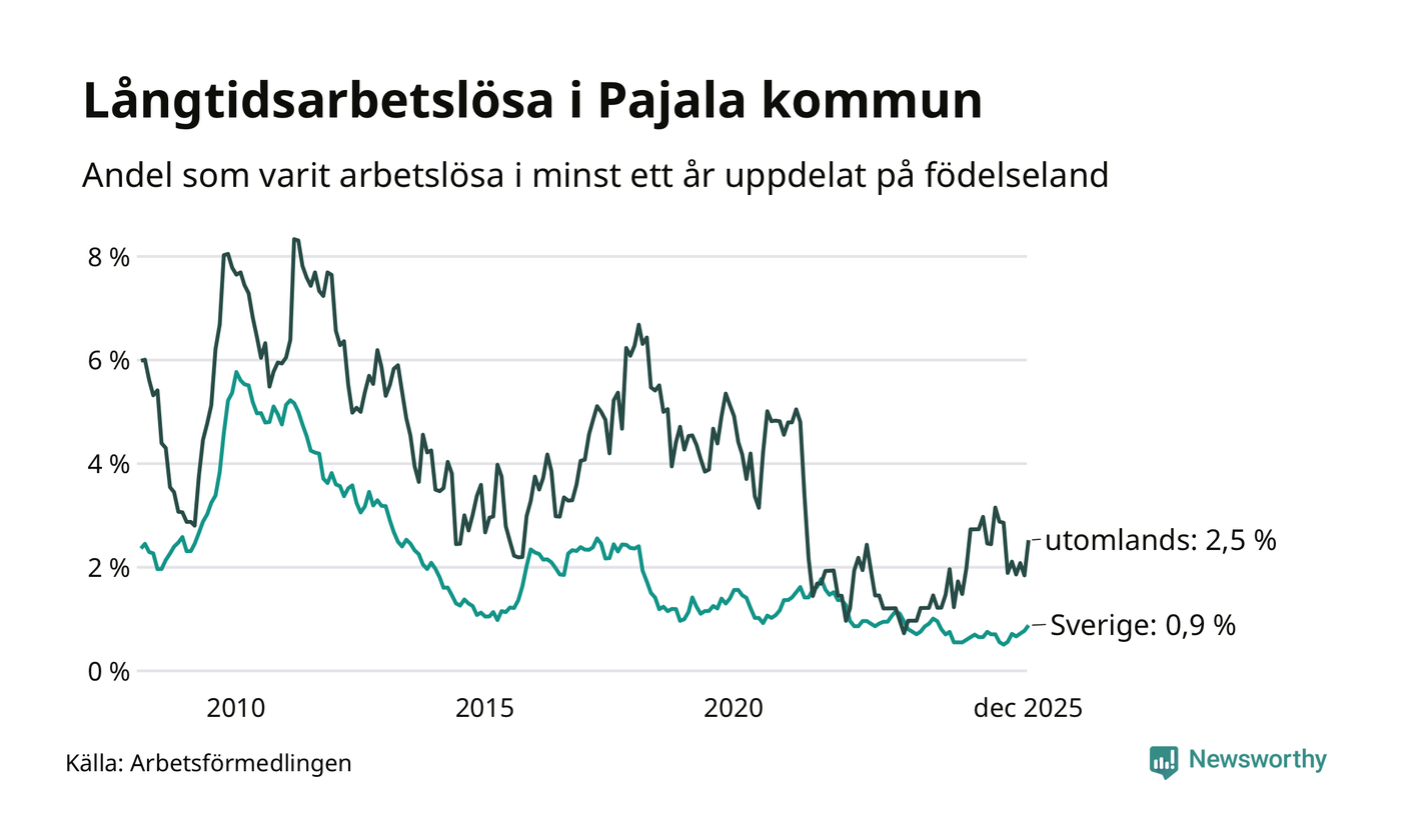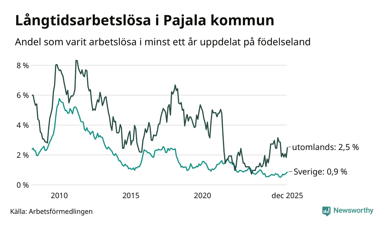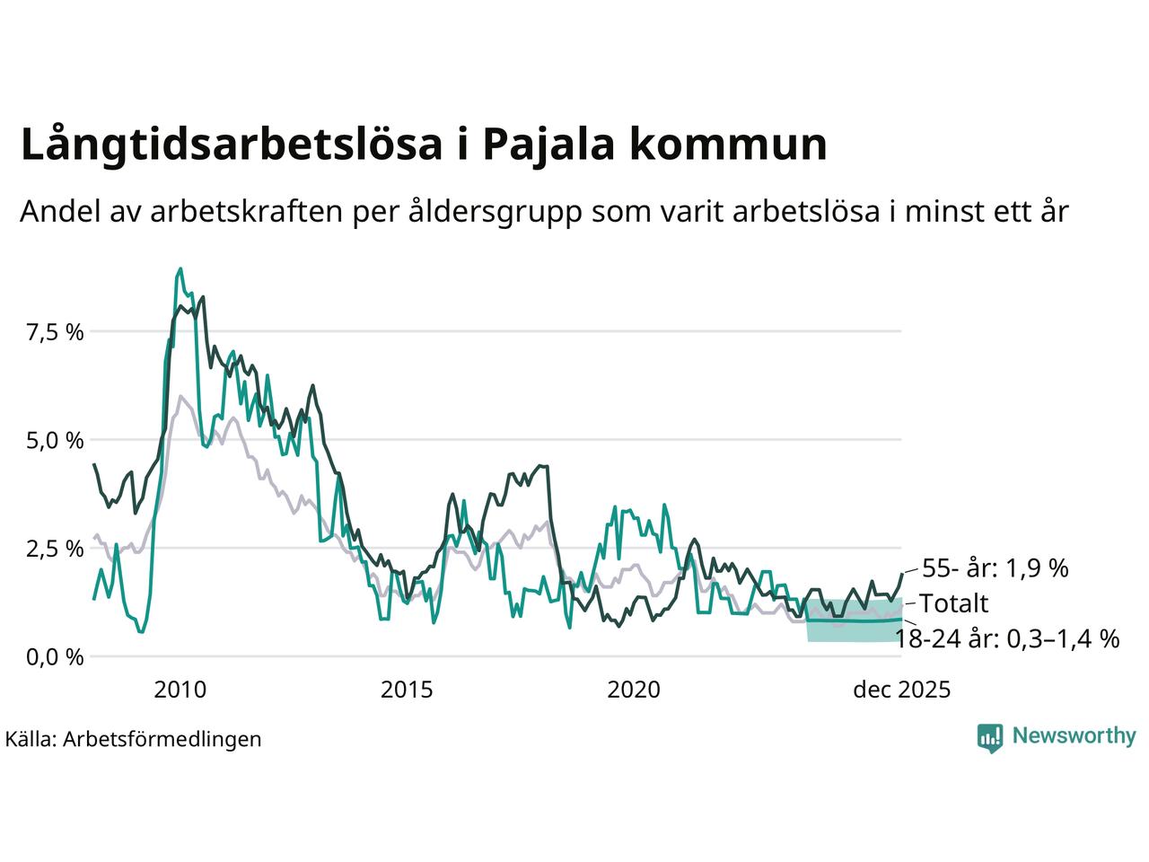 I december hade 28 Pajalabor varit arbetslösa i minst ett år, vilket är fem fler än månaden innan. 28 personer motsvarar 1,2 procent av arbetskraften i kommunen – andelen långtidsarbetslösa är ungefär på samma nivå som för ett år sedan.
