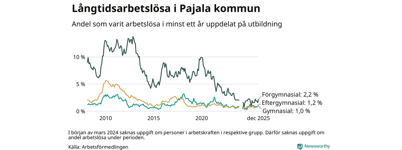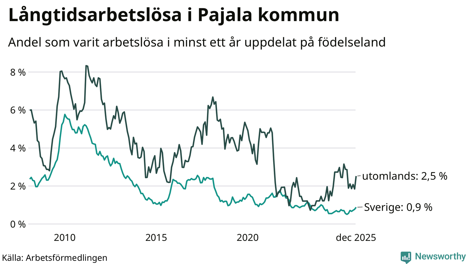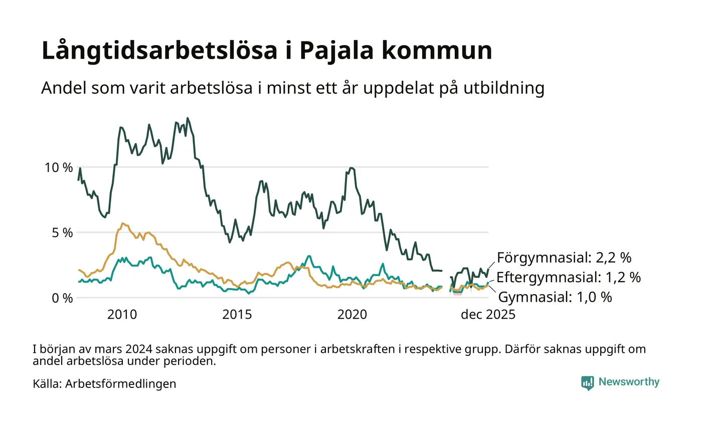 I december hade 28 Pajalabor varit arbetslösa i minst ett år, vilket är fem fler än månaden innan. 28 personer motsvarar 1,2 procent av arbetskraften i kommunen – andelen långtidsarbetslösa är ungefär på samma nivå som för ett år sedan.