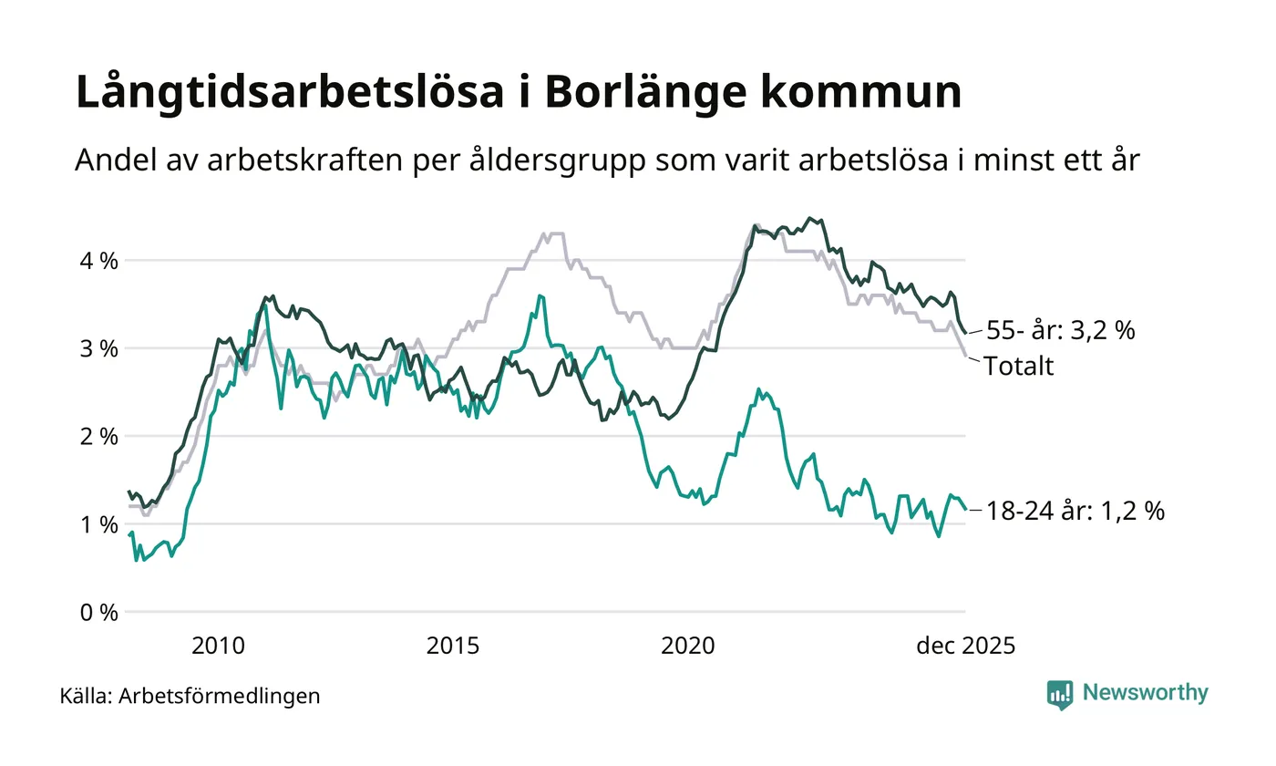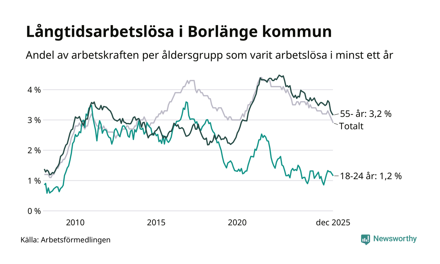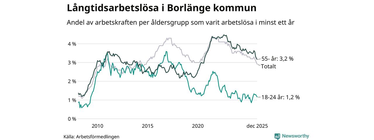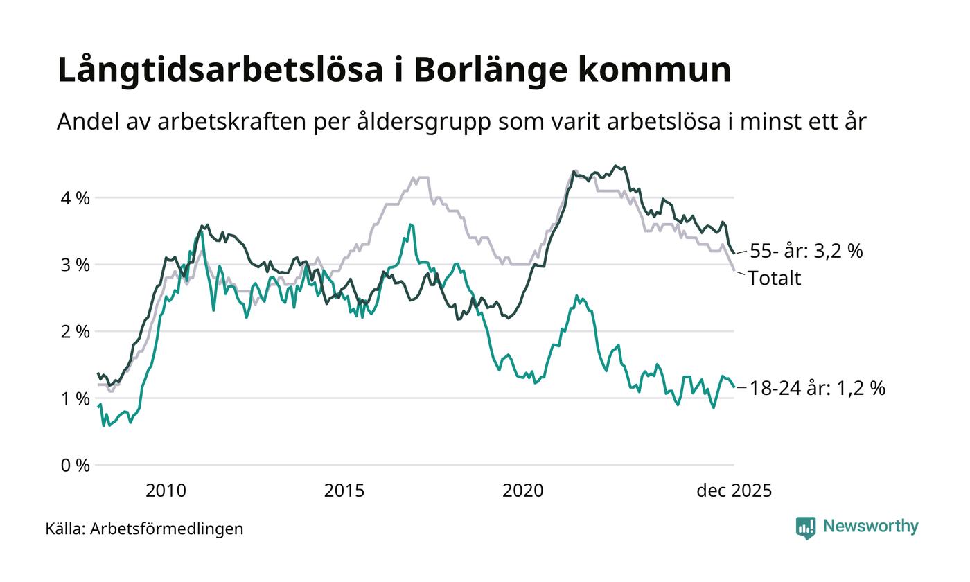 Av de 743 personerna som varit arbetslösa i mer än ett år i Borlänge kommun är 173 personer mellan 55 och 651 år och 34 är mellan 18 och 24 år. För den äldre gruppen är andelen arbetslösa 3,2 procent medan den i den yngre gruppen är 1,2 procent. Även i riket som helhet är långtidsarbetslösheten högre i gruppen äldre.