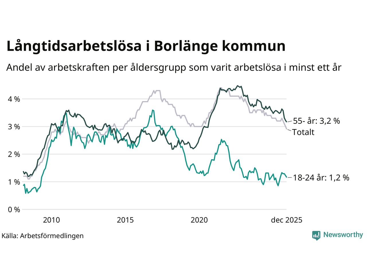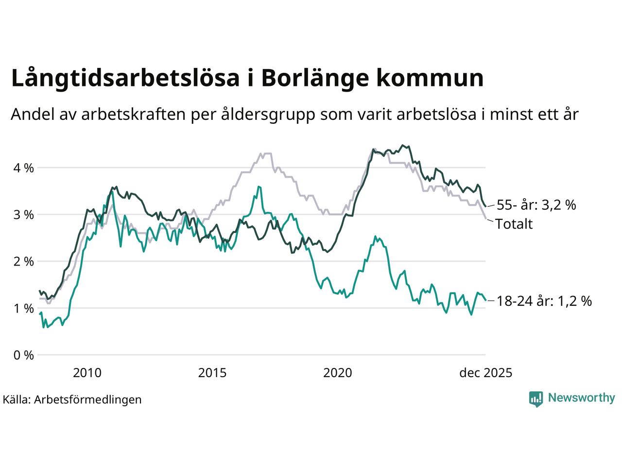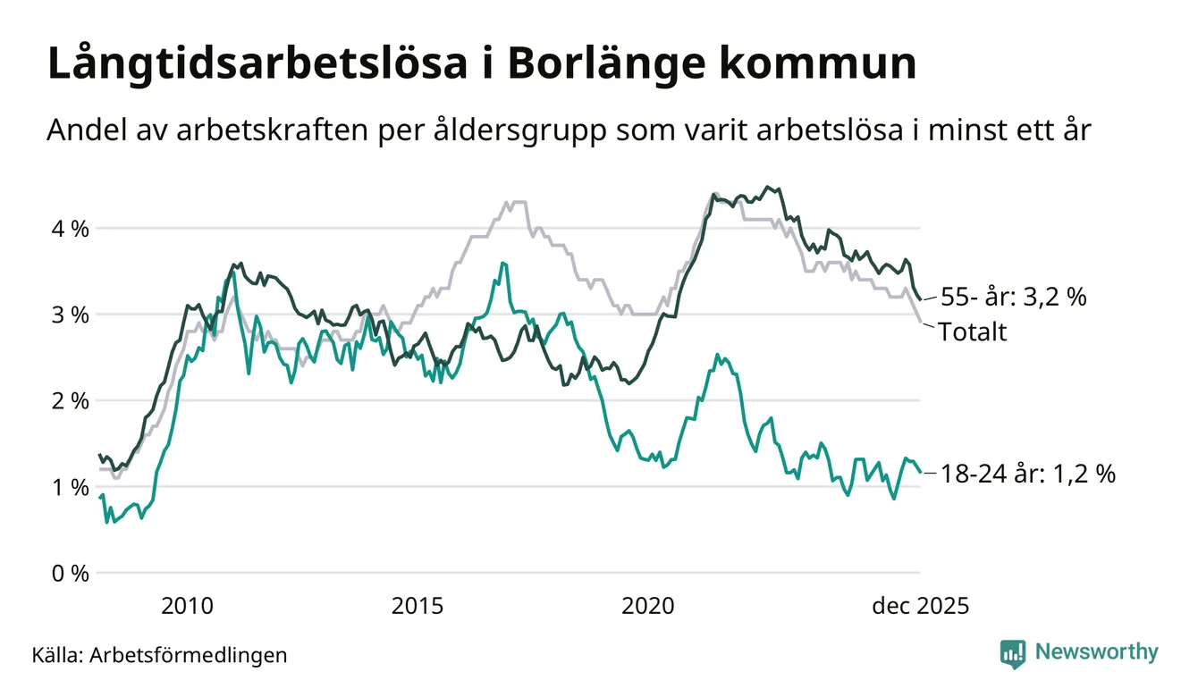 Av de 743 personerna som varit arbetslösa i mer än ett år i Borlänge kommun är 173 personer mellan 55 och 651 år och 34 är mellan 18 och 24 år. För den äldre gruppen är andelen arbetslösa 3,2 procent medan den i den yngre gruppen är 1,2 procent. Även i riket som helhet är långtidsarbetslösheten högre i gruppen äldre.