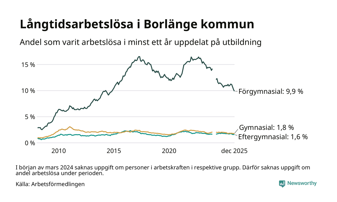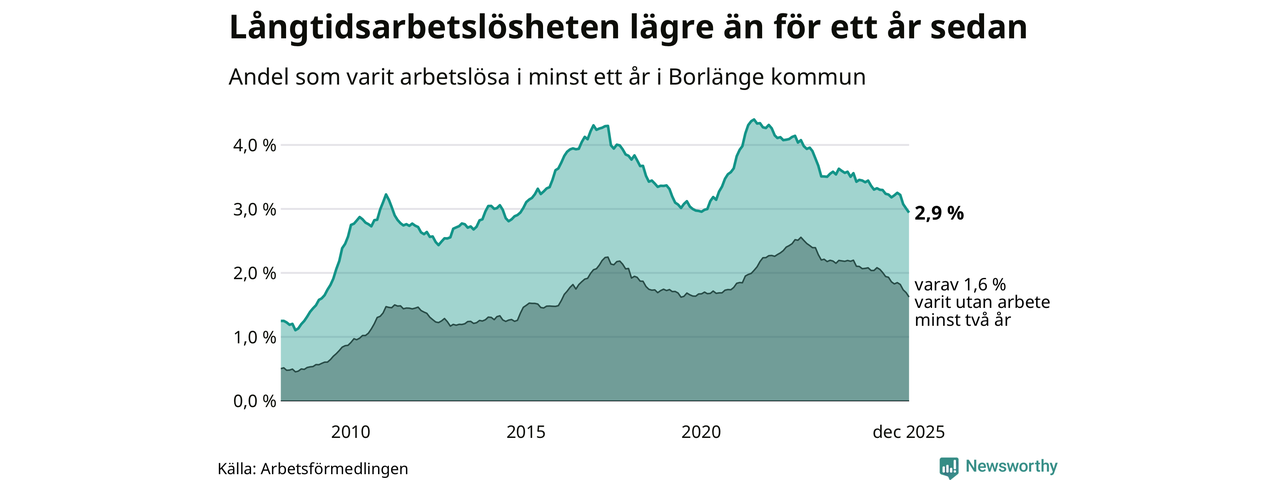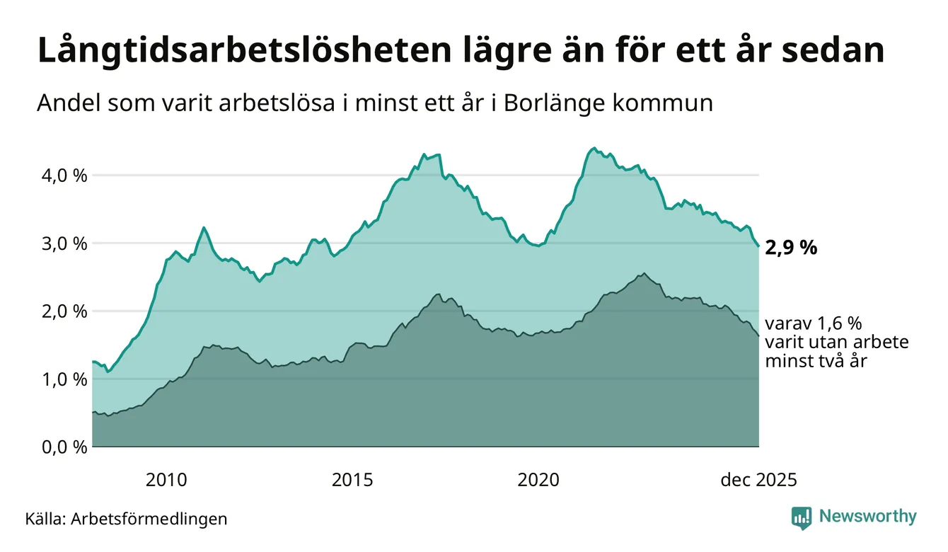I december hade 743 Borlängebor varit arbetslösa i minst ett år, vilket är 16 färre än månaden innan. Det är den fjärde månaden i rad med minskande antal långtidsarbetslösa. 743 personer motsvarar 2,9 procent av arbetskraften i kommunen – andelen långtidsarbetslösa är 0,4 procentenheter lägre än samma månad för ett år sedan.