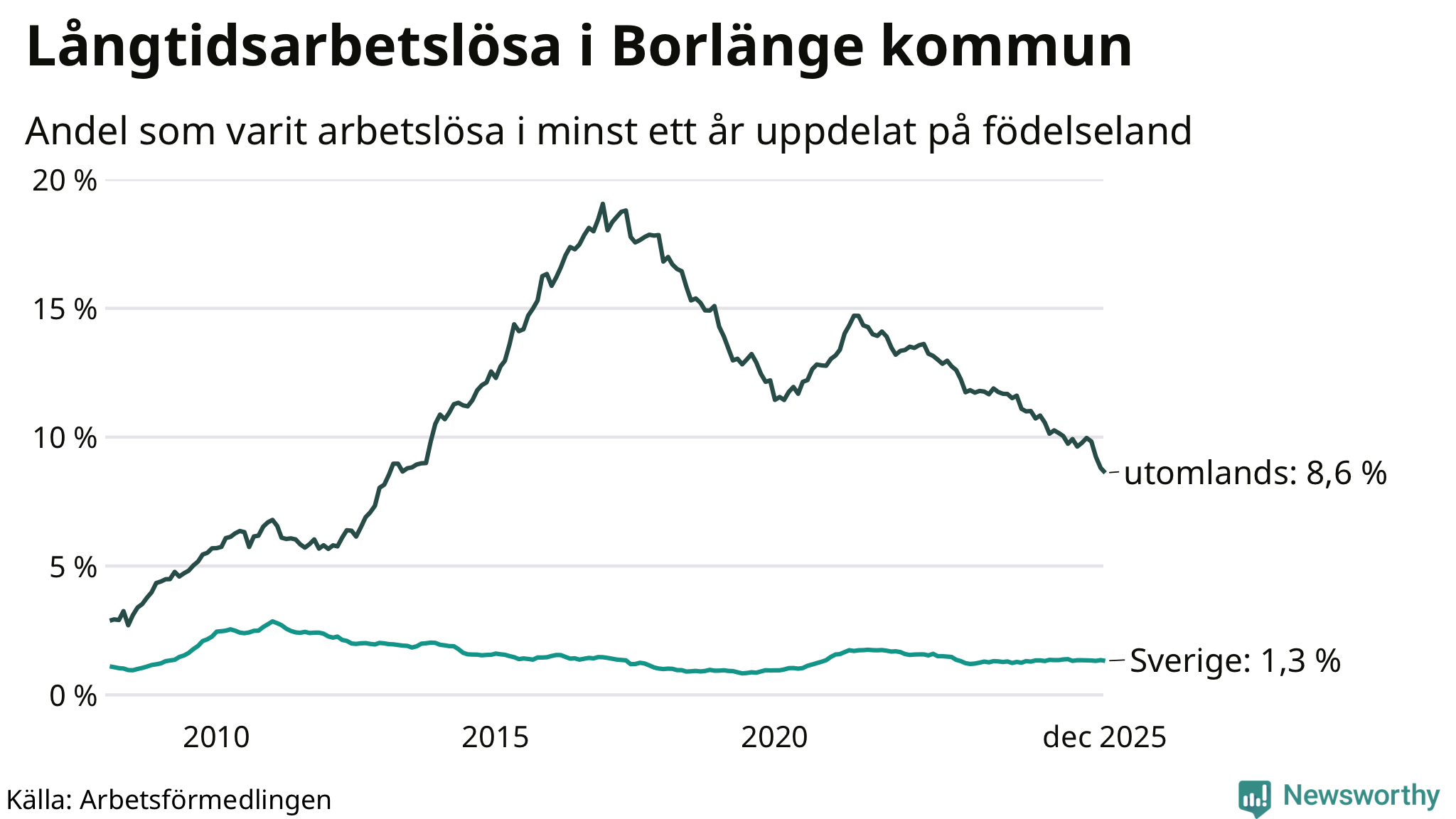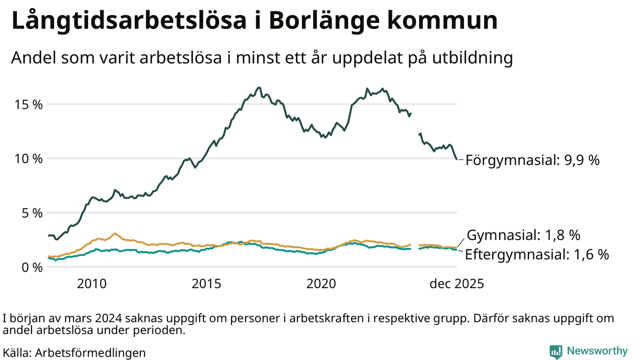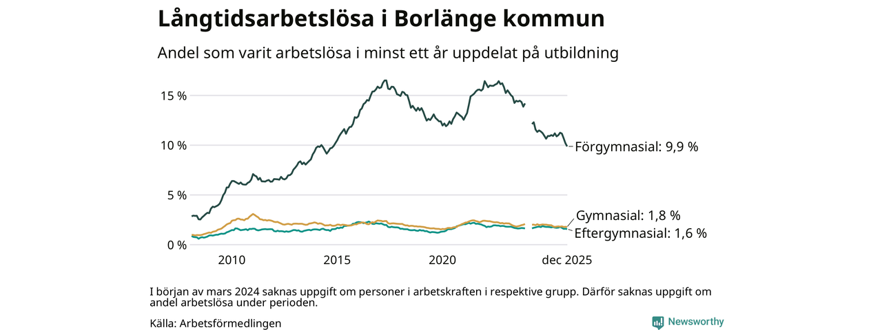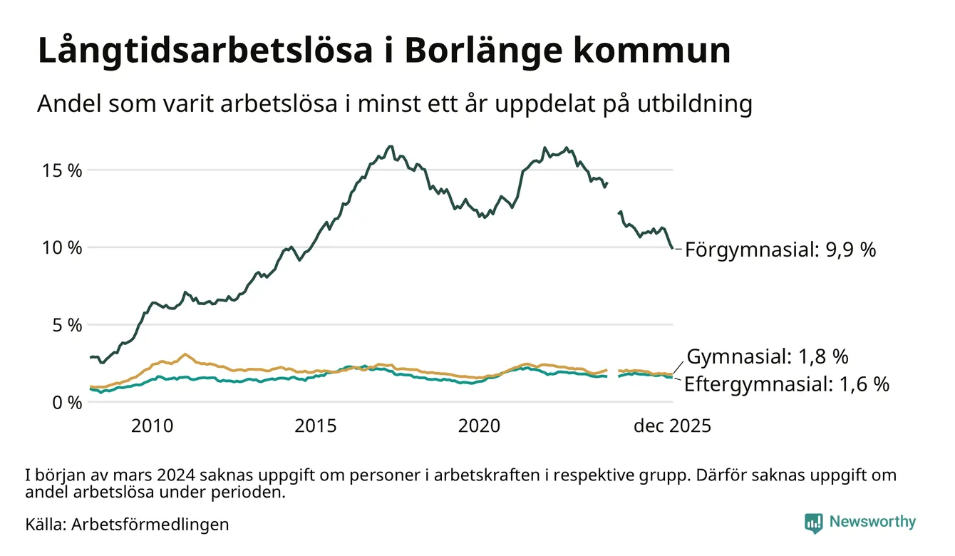 I december hade 743 Borlängebor varit arbetslösa i minst ett år, vilket är 16 färre än månaden innan. Det är den fjärde månaden i rad med minskande antal långtidsarbetslösa. 743 personer motsvarar 2,9 procent av arbetskraften i kommunen – andelen långtidsarbetslösa är 0,4 procentenheter lägre än samma månad för ett år sedan.