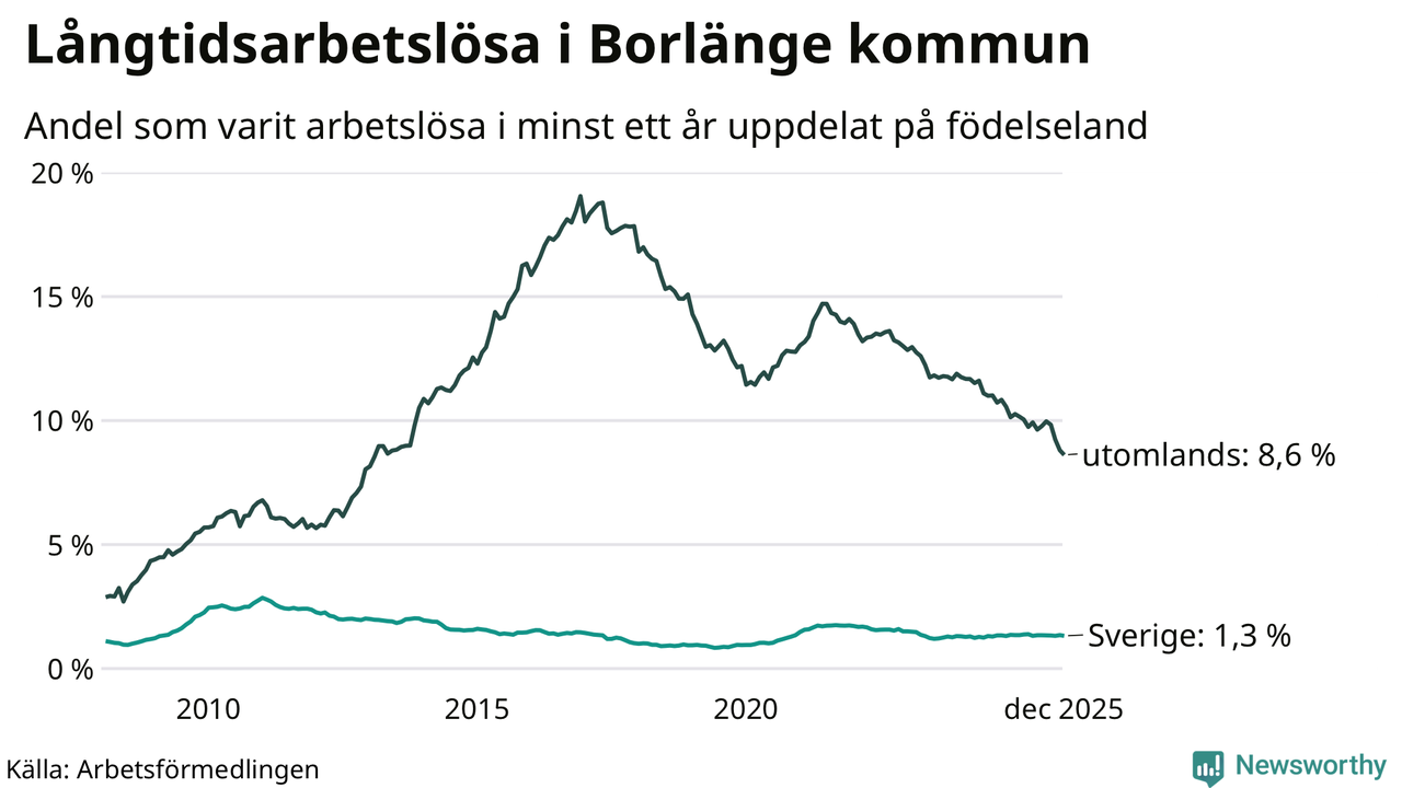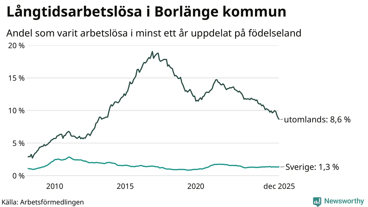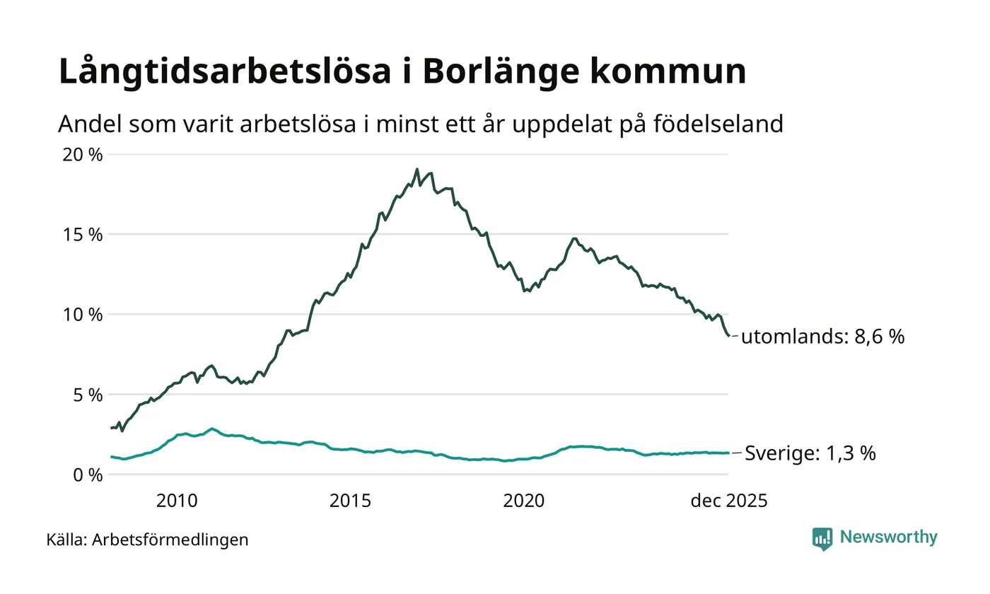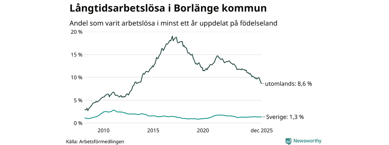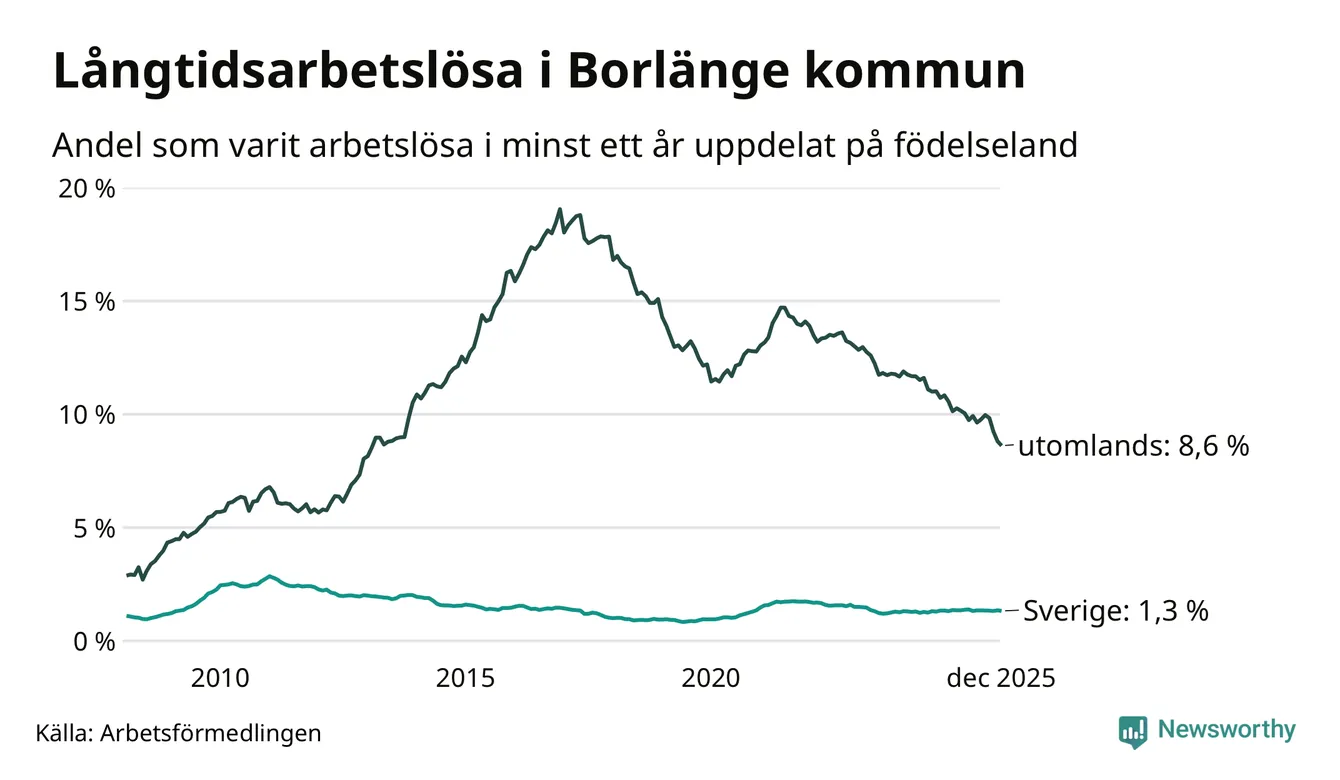 259 av de långtidsarbetslösa i Borlänge är födda i Sverige, medan 484 är födda utomlands. Det innebär att långtidsarbetslösheten bland Sverigefödda är 1,3 procent, medan den är sju gånger så hög – 8,6 procent – bland födda utomlands. Även i riket som helhet är arbetslösheten högre bland utrikesfödda.