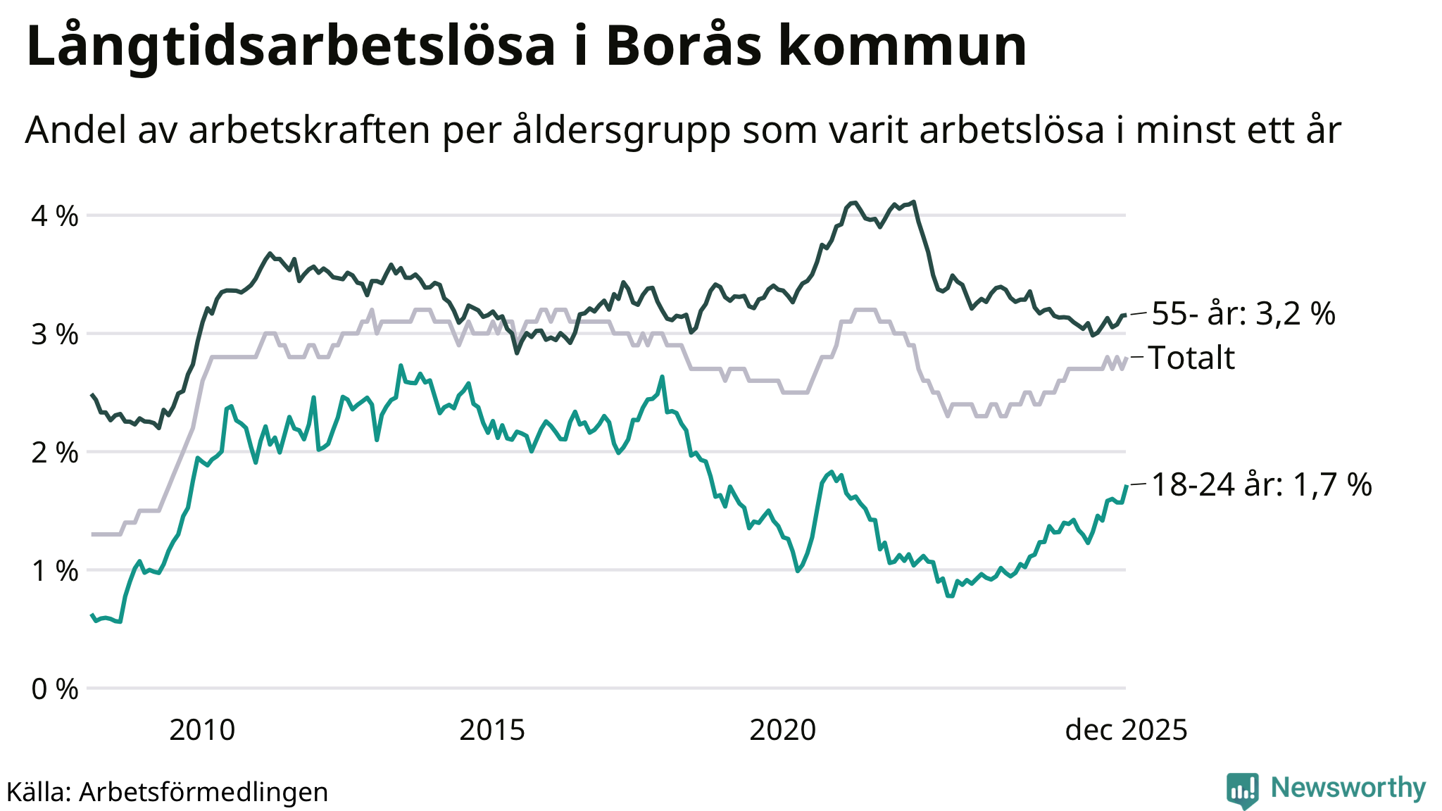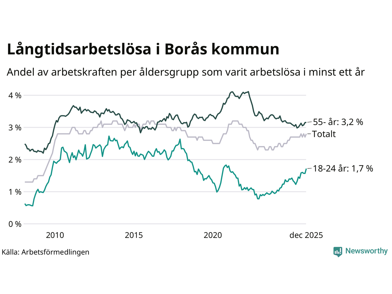 Av de 1 617 personerna som varit arbetslösa i mer än ett år i Borås kommun är 376 personer mellan 55 och 651 år och 115 är mellan 18 och 24 år. För den äldre gruppen är andelen arbetslösa 3,2 procent medan den i den yngre gruppen är 1,7 procent. Även i riket som helhet är långtidsarbetslösheten högre i gruppen äldre.